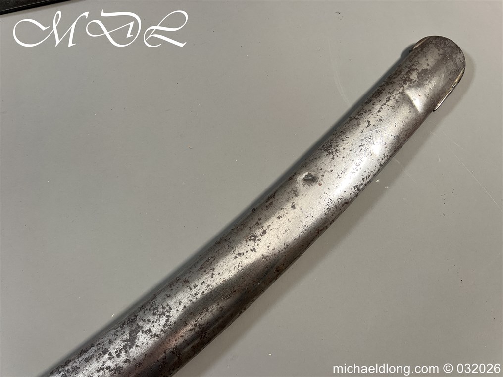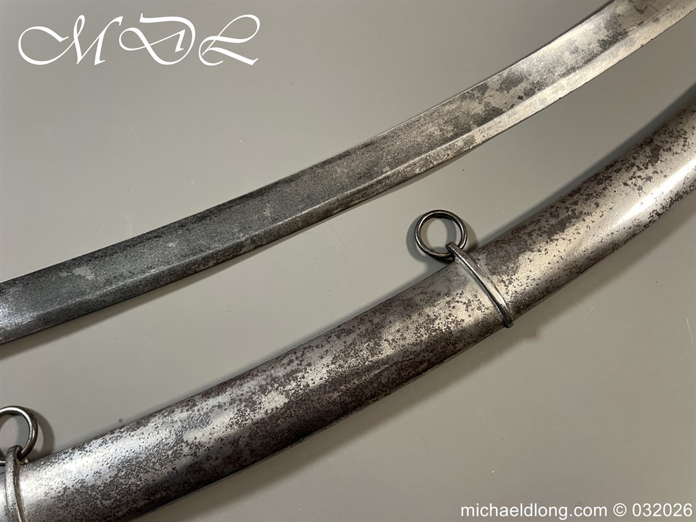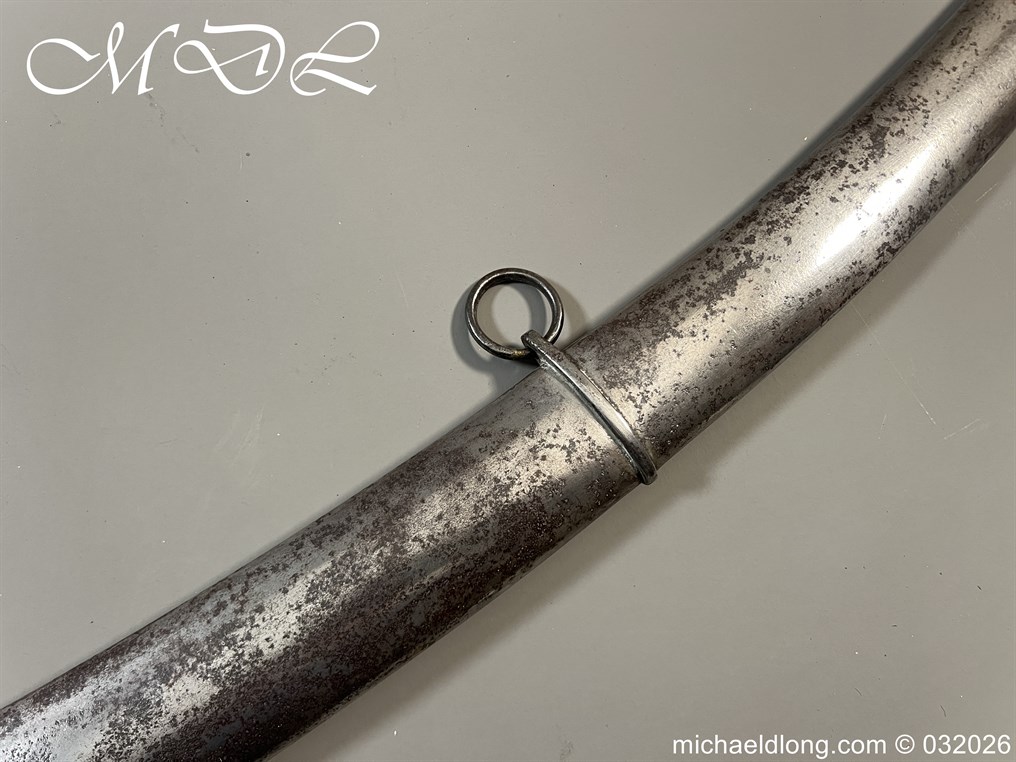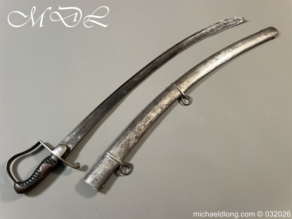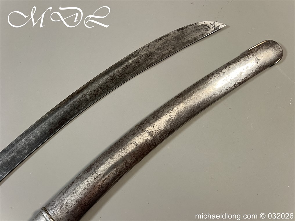 British 1796 Troopers Cavalry Sword by Gill curved blade with large fuller each side and stamped with a small crown over 4 The hilt regulation form with ribbed leather bound grip. The spine maker marked Gill and complete with matching scabbard with two loose rings, blade length 32.5 inch