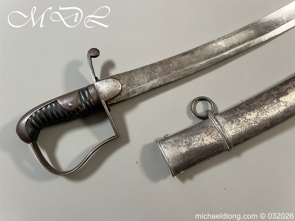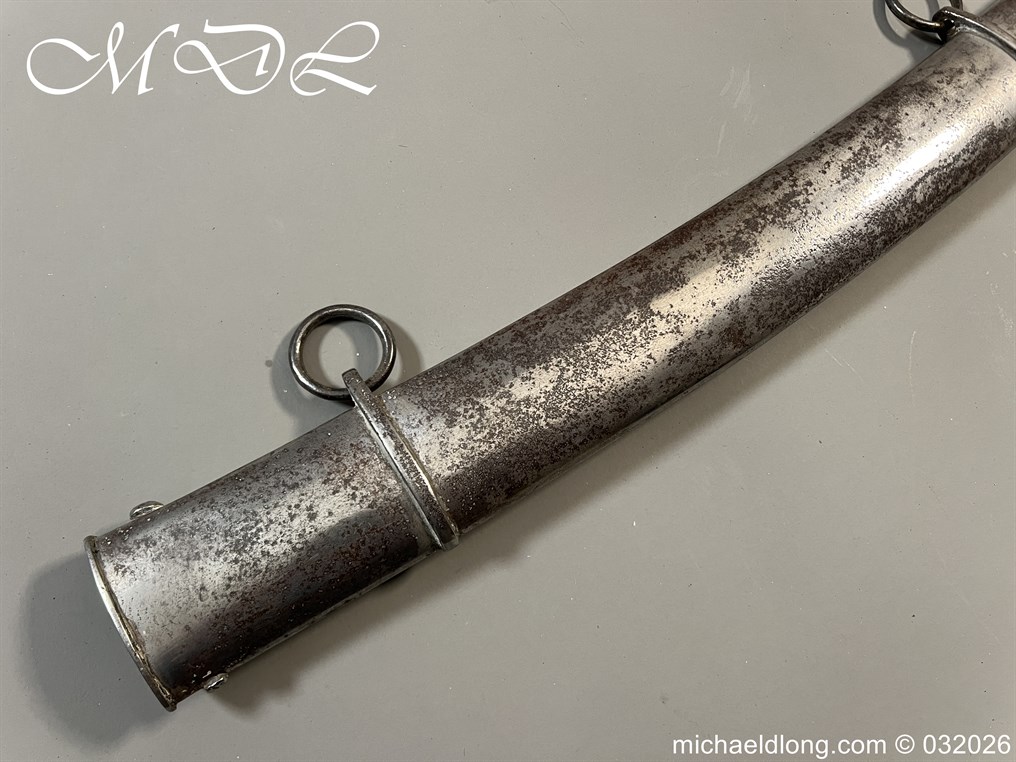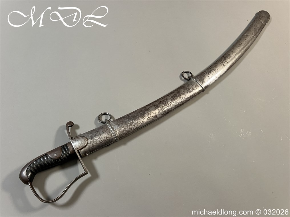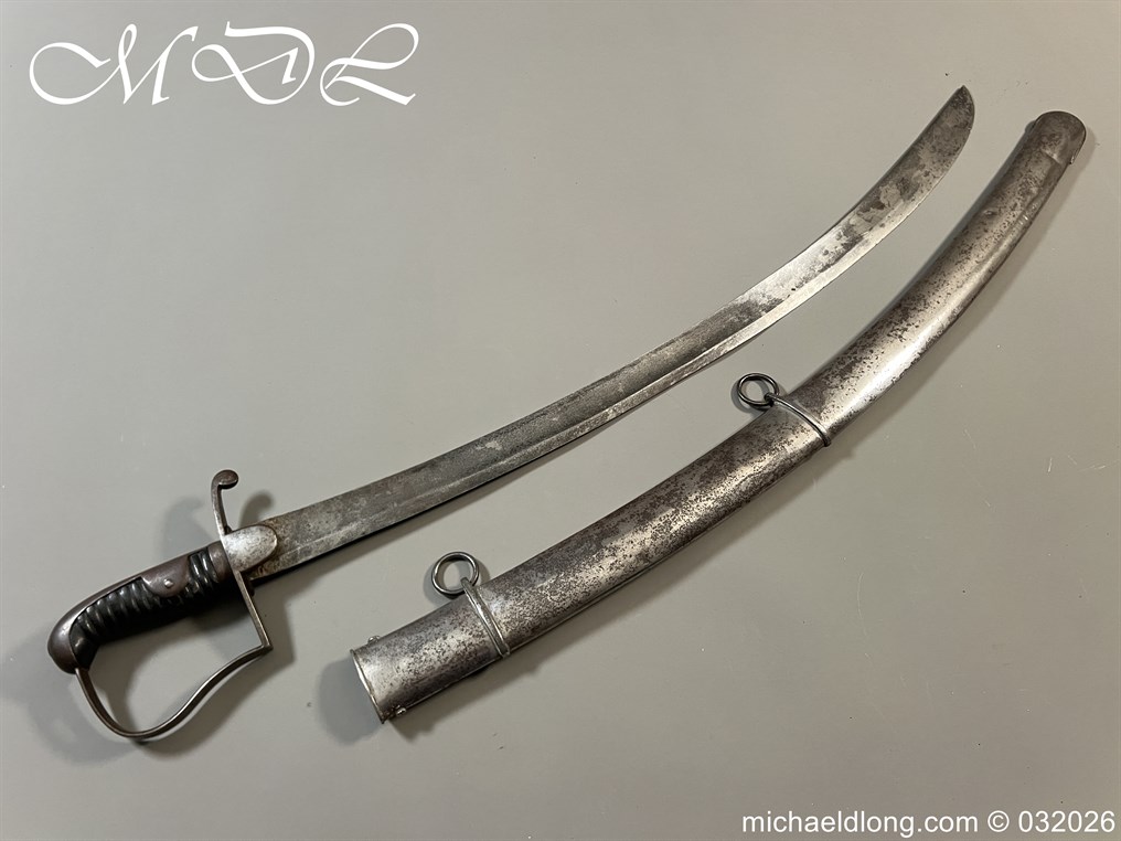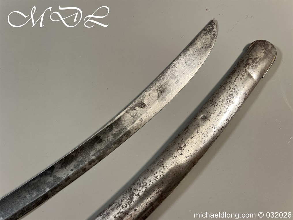 British 1796 Troopers Cavalry Sword by Gill curved blade with large fuller each side and stamped with a small crown over 4 The hilt regulation form with ribbed leather bound grip. The spine maker marked Gill and complete with matching scabbard with two loose rings, blade length 32.5 inch