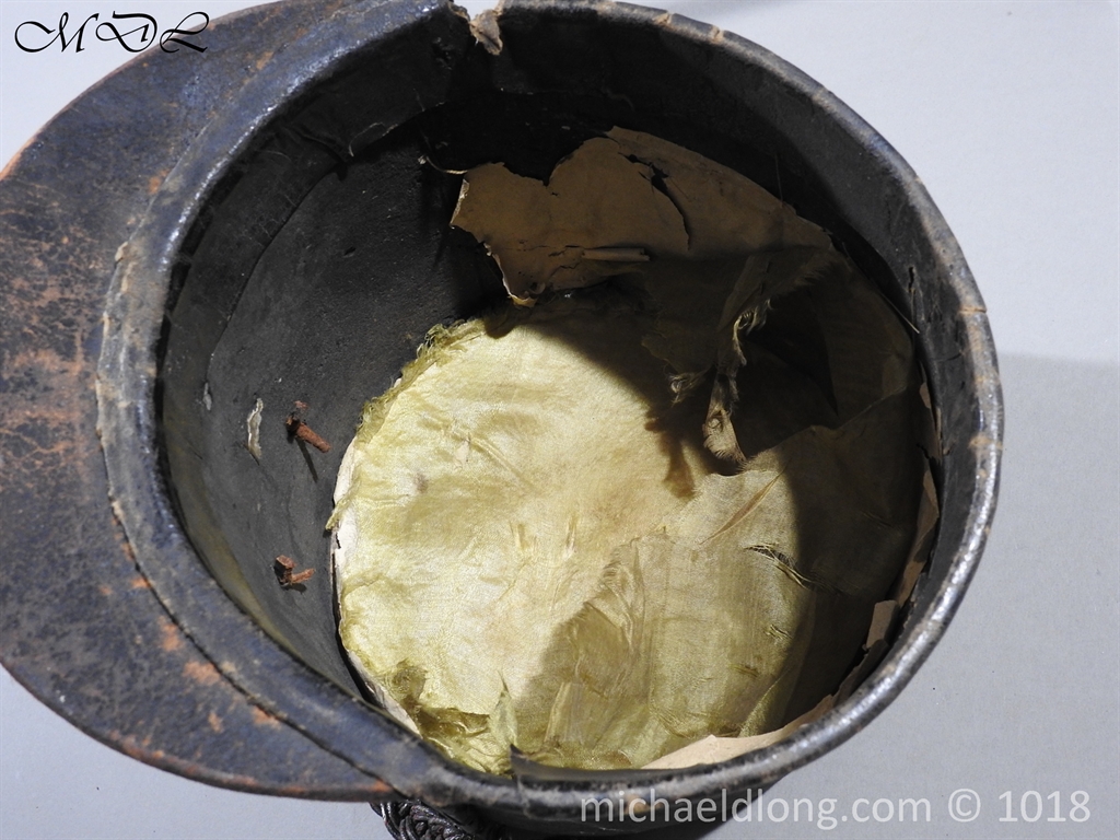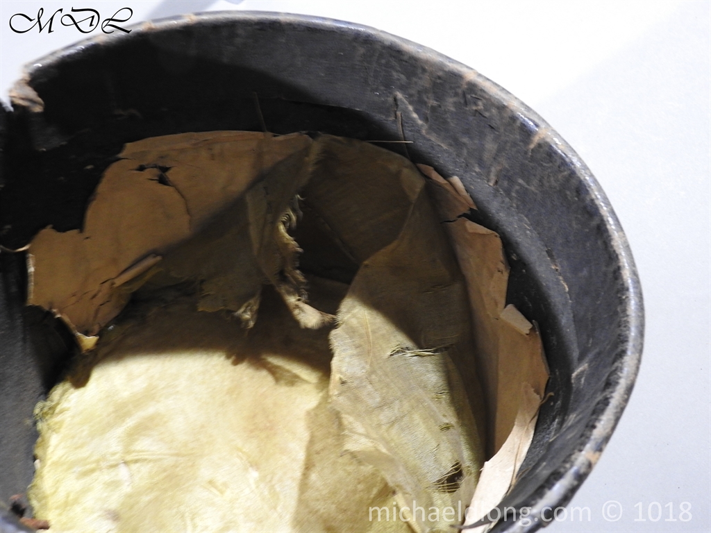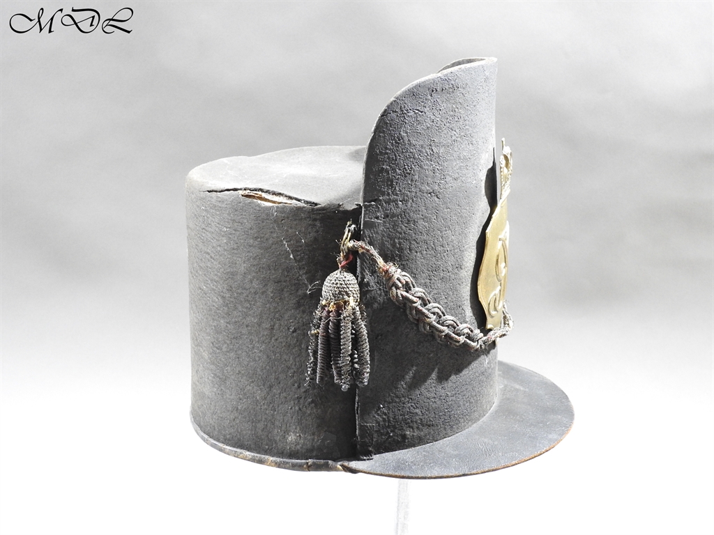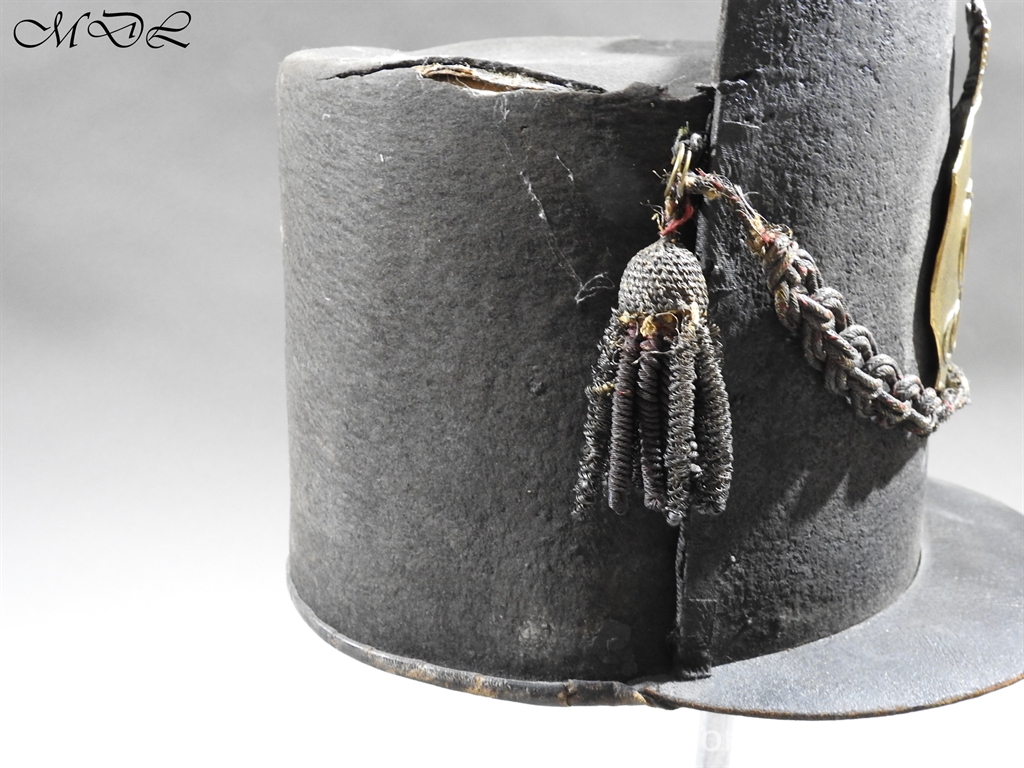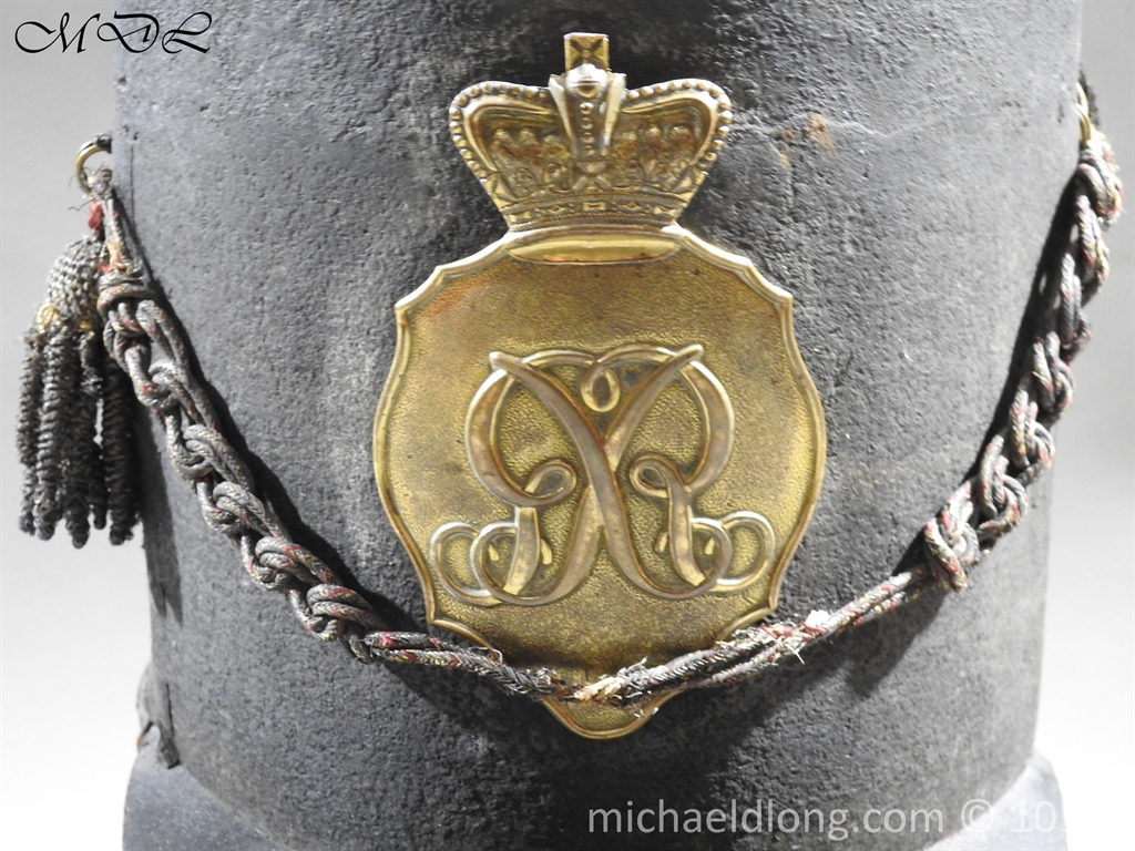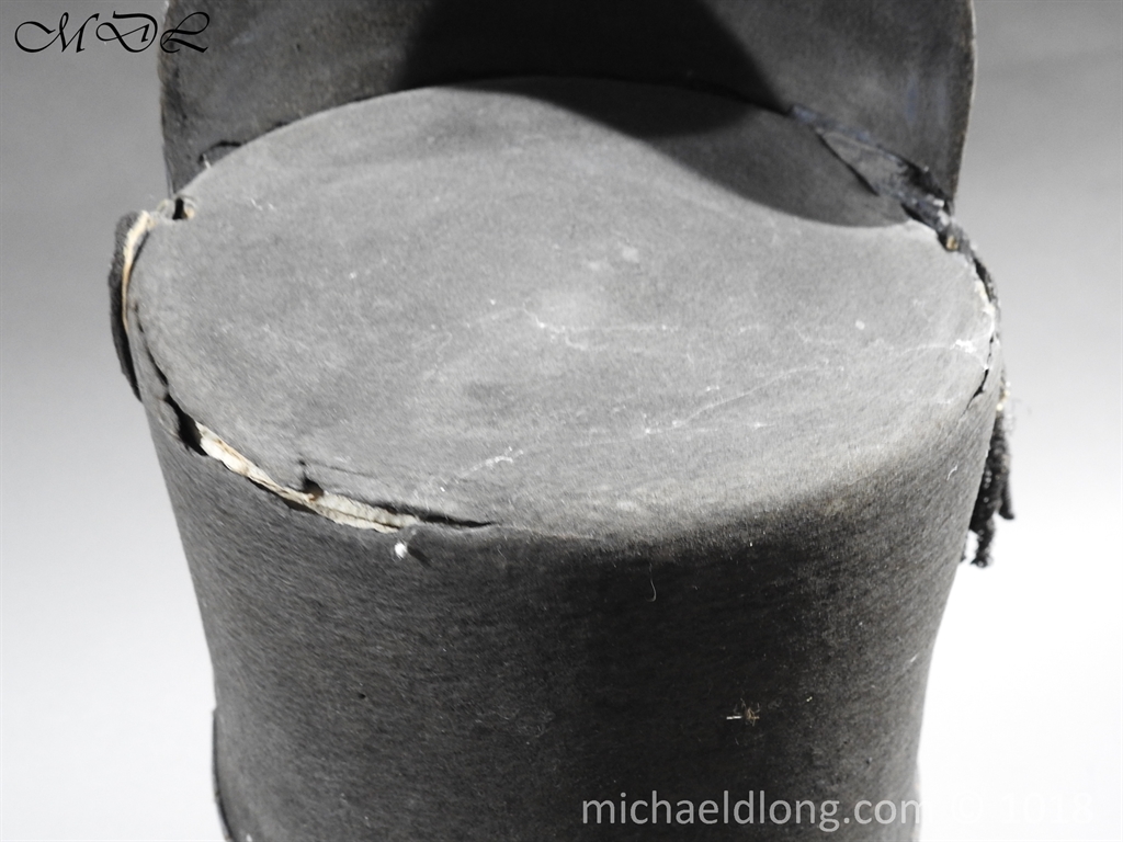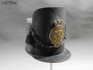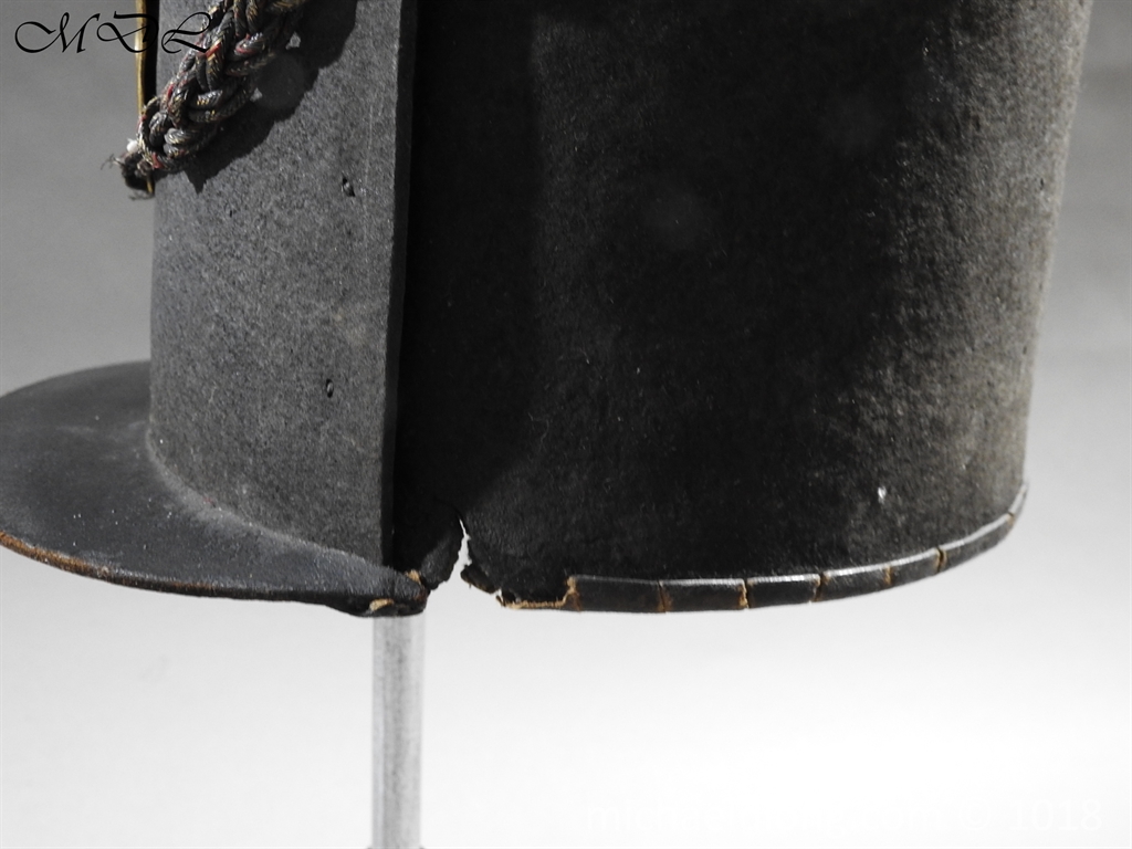 Very rare shako to find due to the original construction and materials used, known as the Belgic or Waterloo Shako, this example retains good shape and is solid however does show area’s of age wear please see images. The side plume is missing however complete with the universal pattern GR helmet plate with crown, silver and crimson plaited festoon and black rosette with slung bugle. The interior is complete with a leather sweat band and the cap is partly lined in waxed cotton and a leather peak extends fowards from the cap, these shako’s were never fitted with chin strap.