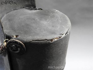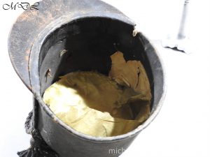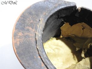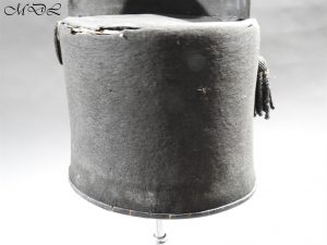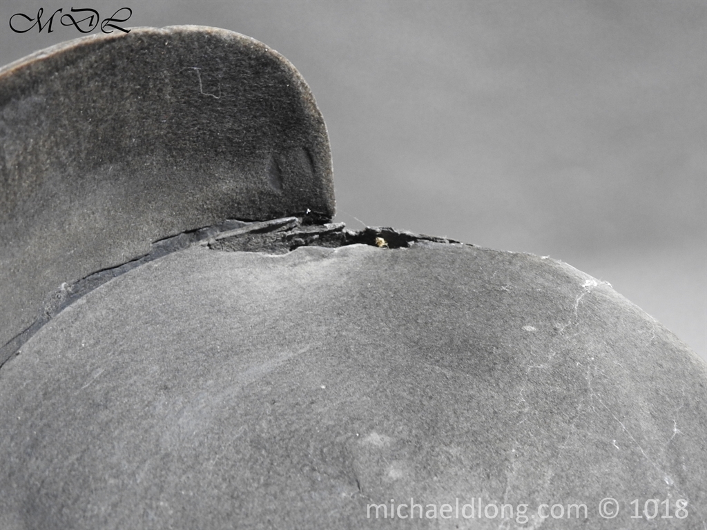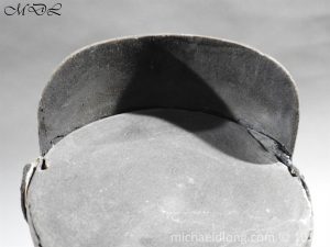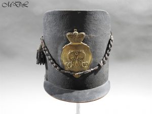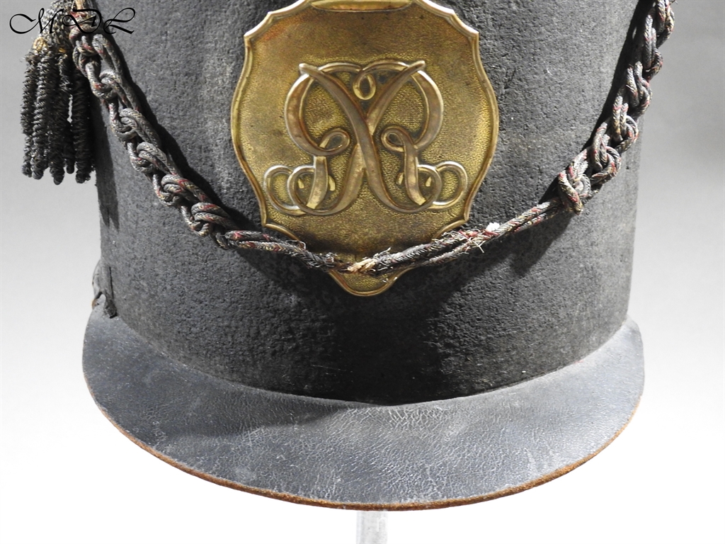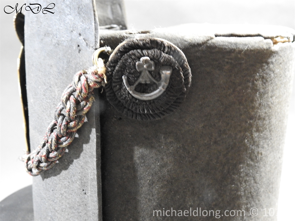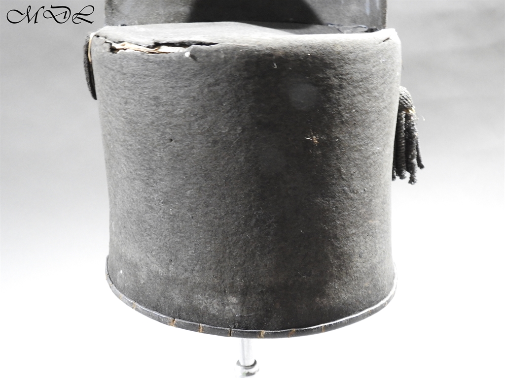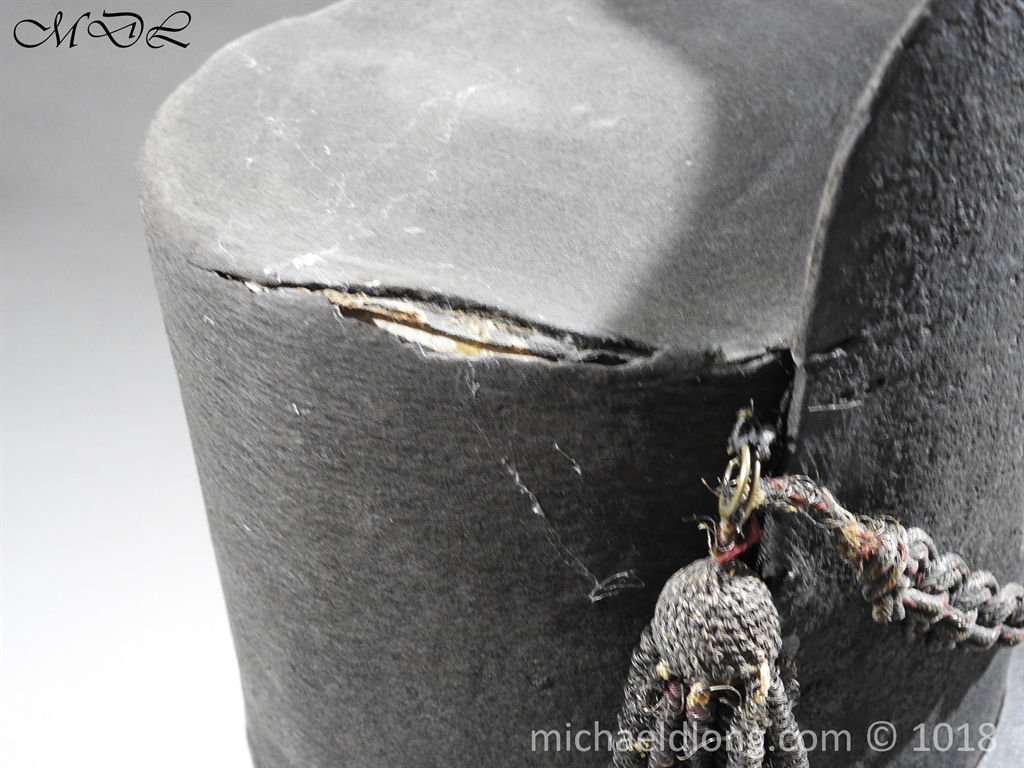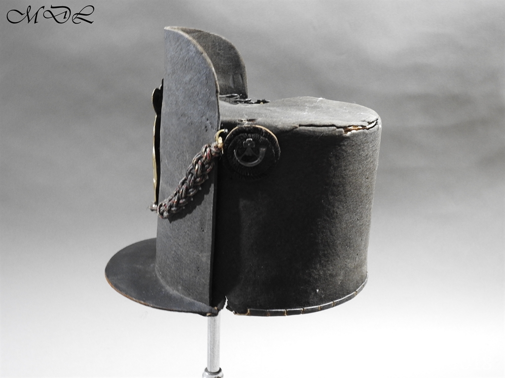Very rare shako to find due to the original construction and materials used, known as the Belgic or Waterloo Shako, this example retains good shape and is solid however does show area’s of age wear please see images. The side plume is missing however complete with the universal pattern GR helmet plate with crown, silver and crimson plaited festoon and black rosette with slung bugle. The interior is complete with a leather sweat band and the cap is partly lined in waxed cotton and a leather peak extends fowards from the cap, these shako’s were never fitted with chin strap.