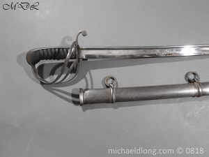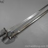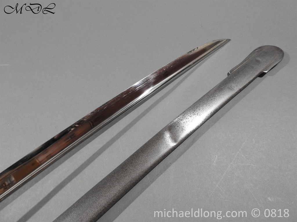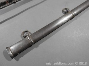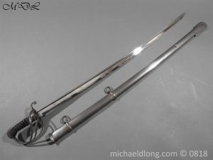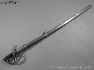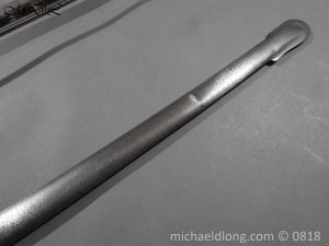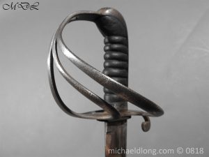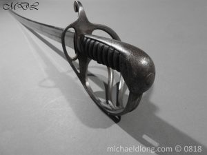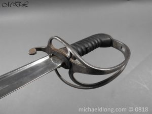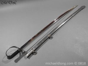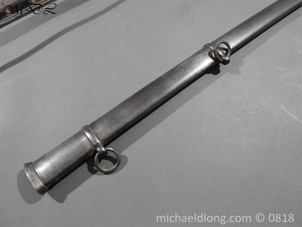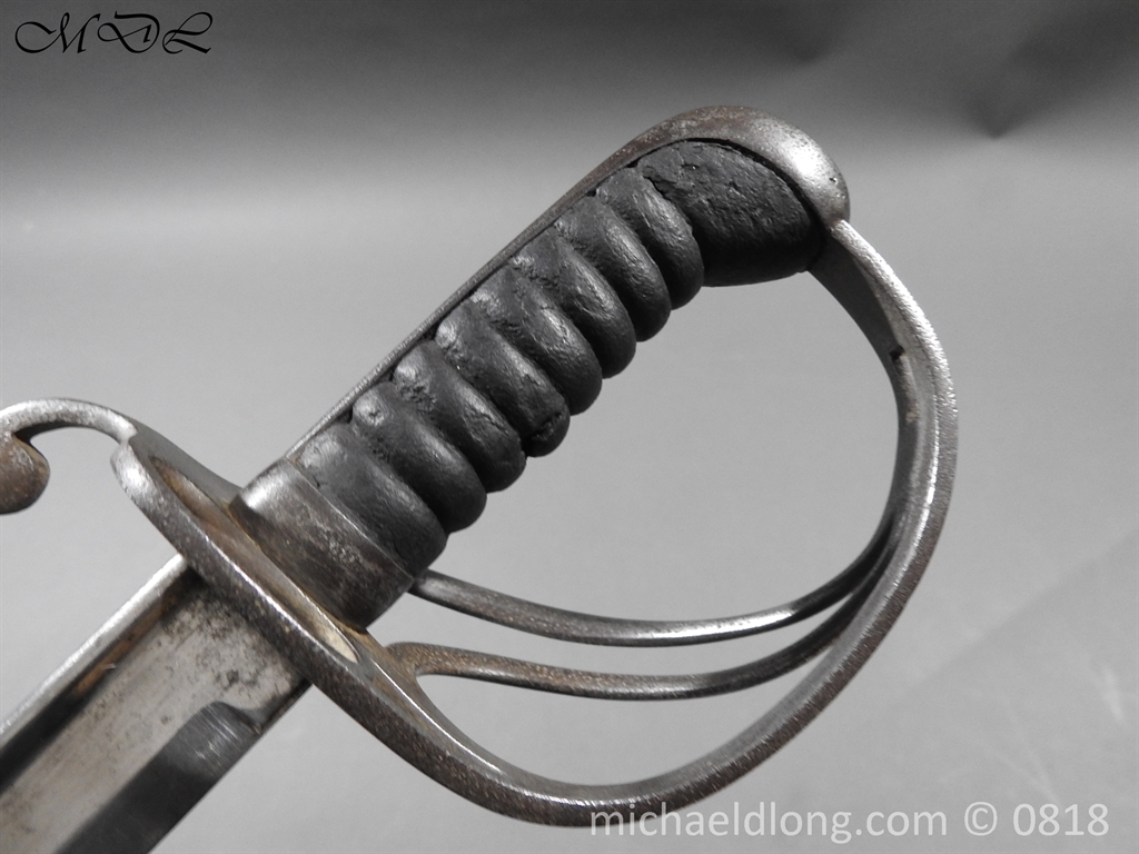 1821 pattern trooper sword, leather covered wooden grip, 3 bar guard with smooth dome pommel. The single edged pipe backed blade curved blade complete with steel scabbard Dimensions: Blade Length: 90 cm – Overall Length: 104 cm