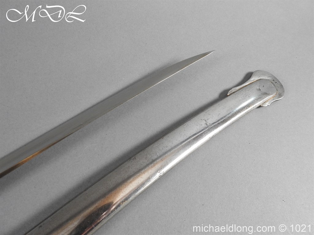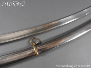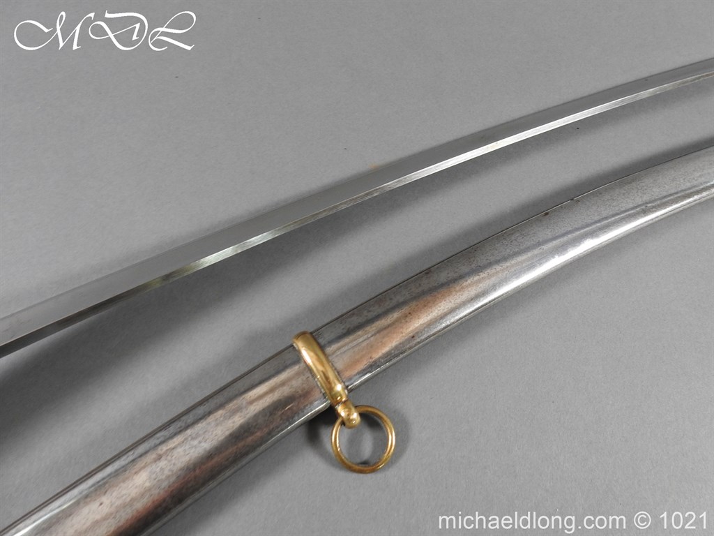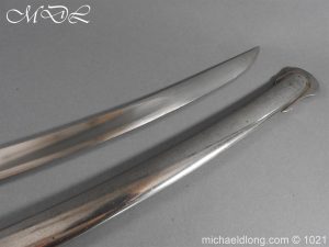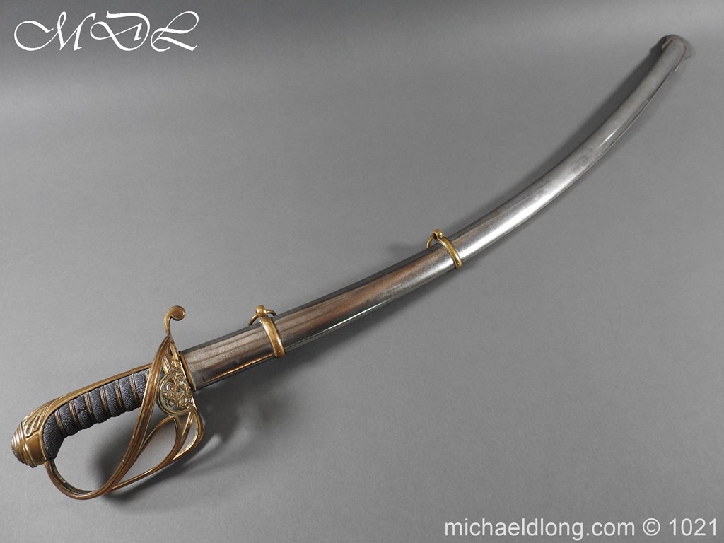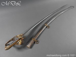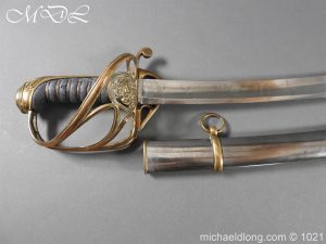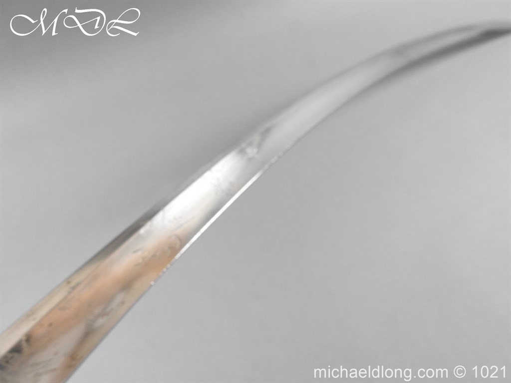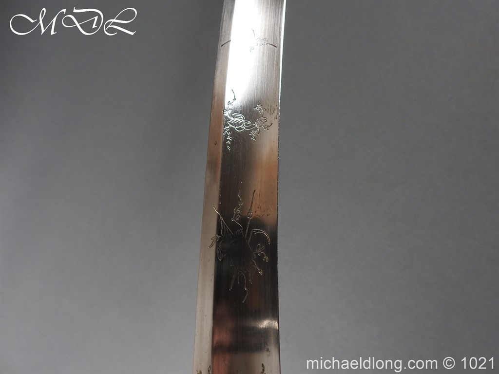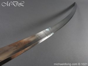 The blade is more curved than normal and similar to an 1803 engraved with trophies of arms and foliage plus the initials S H F which we assume were the owners. Complete with steel matching scabbard with brass mounts. Note repair to drag and marked E B H II