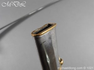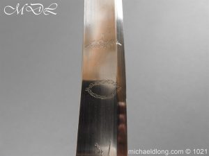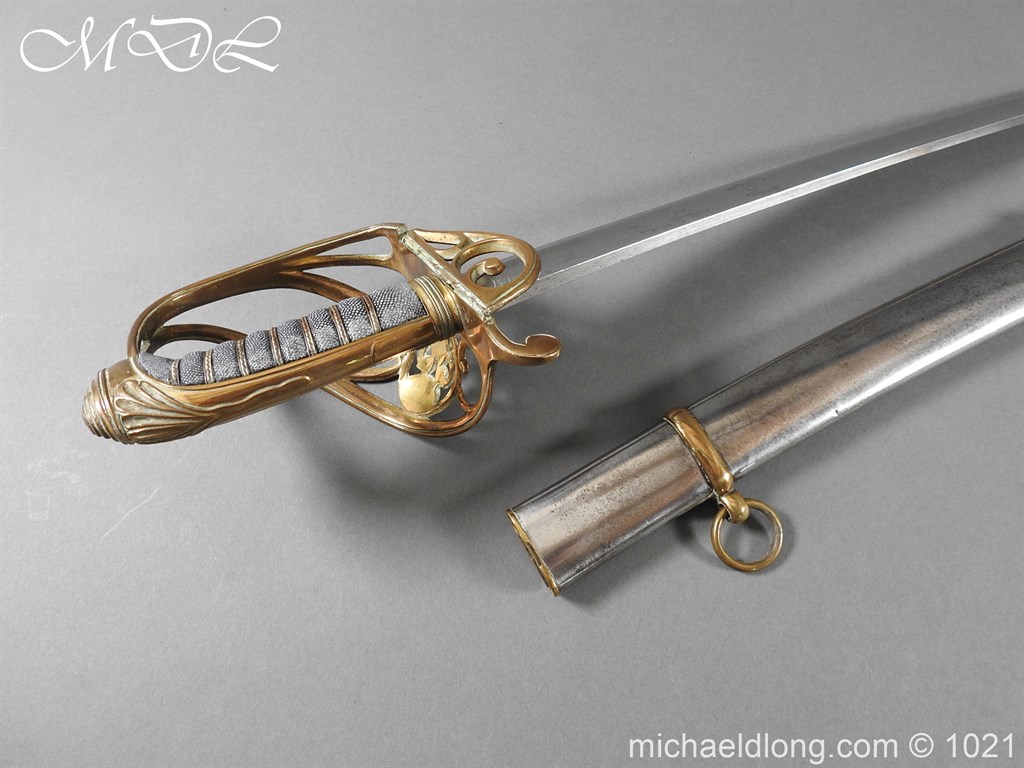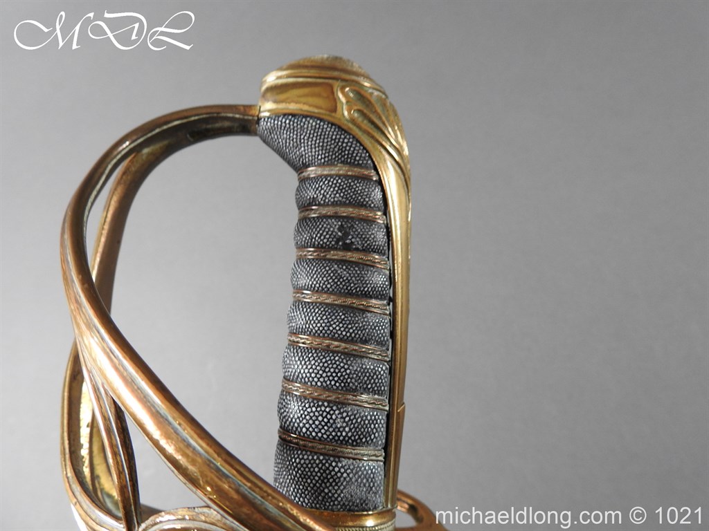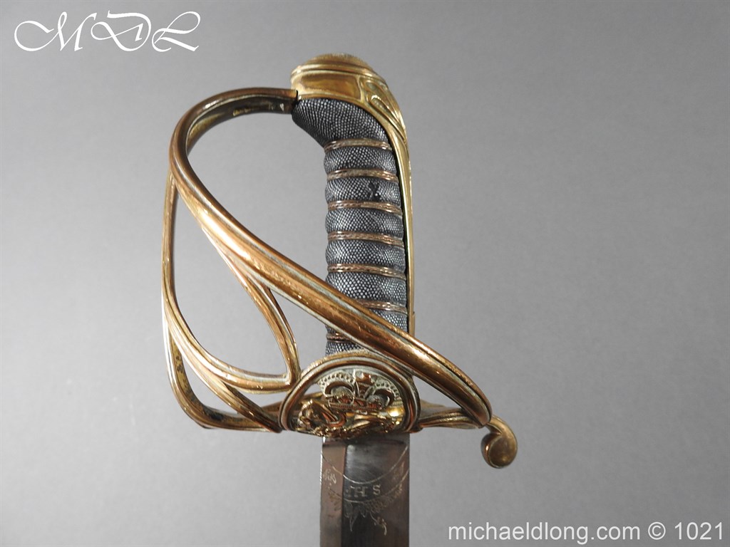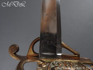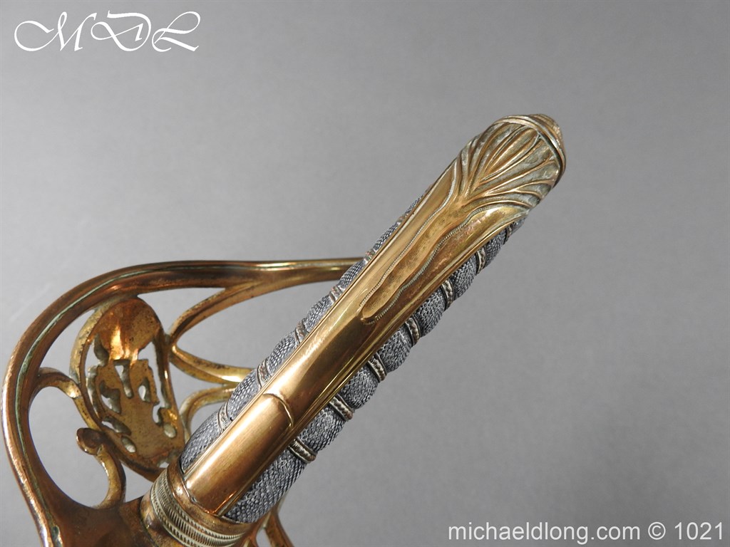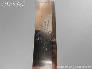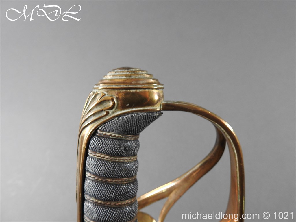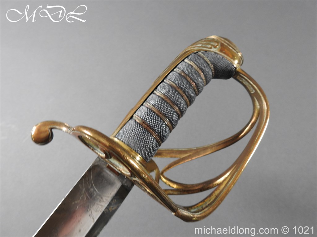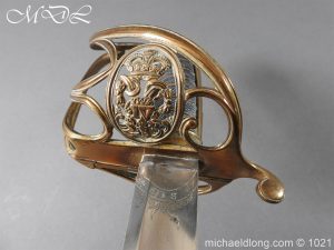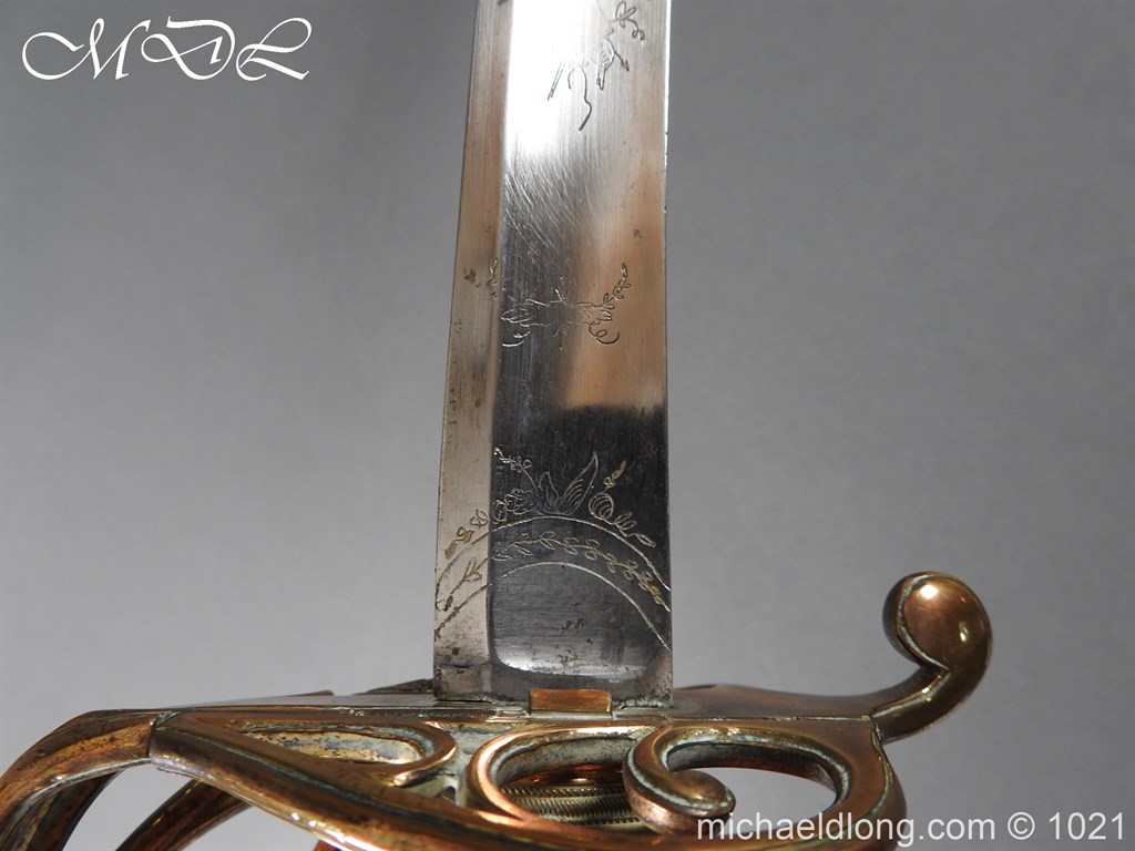 British 1822 Infantry Officer’s Sword brass gothic hilt with folding side guard and George the 4th cartouche. Fluted back strap with stepped pommel and fish skin grip.