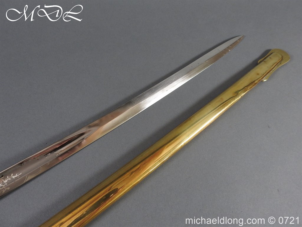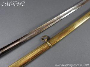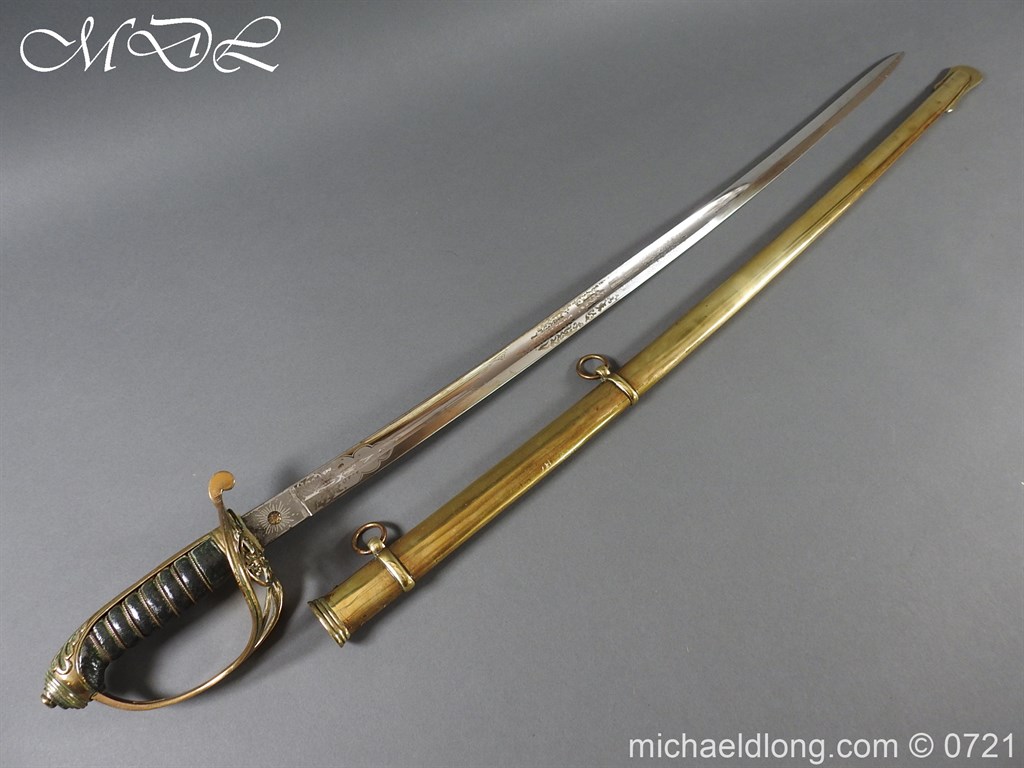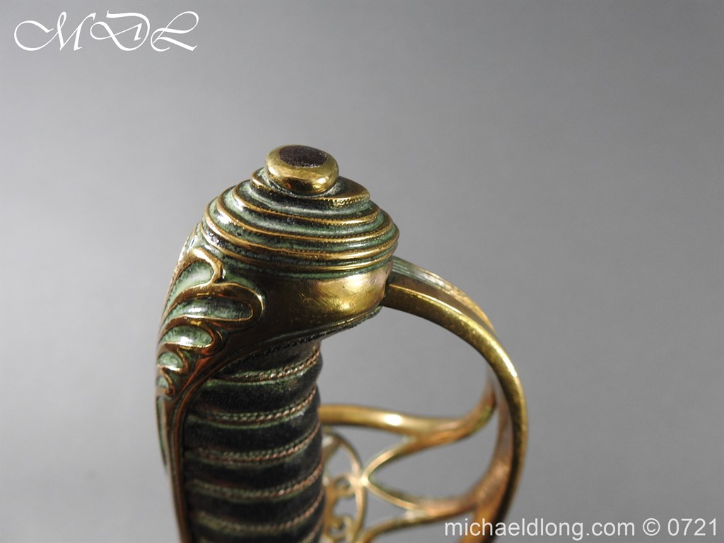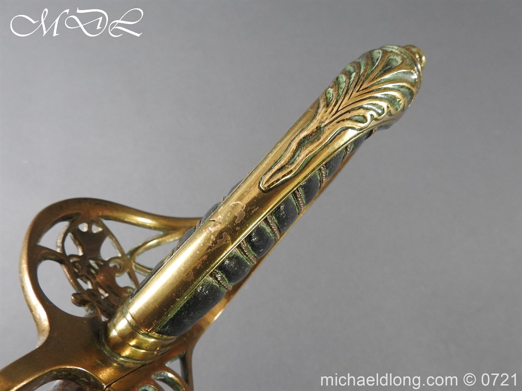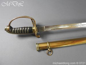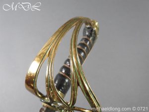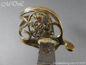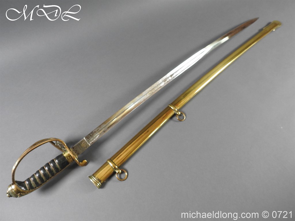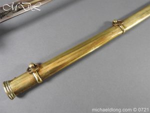 British 1822 Infantry Officer’s Sword, regulation brass hilt with Royal cipher and Victorian crown, folding side guard, fish skin grip and decorative back strap. Slightly curved blade etched with VR and Crown plus floral decoration to both side with Galt Portsmouth and proof plug. Complete with brass scabbard.