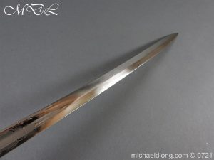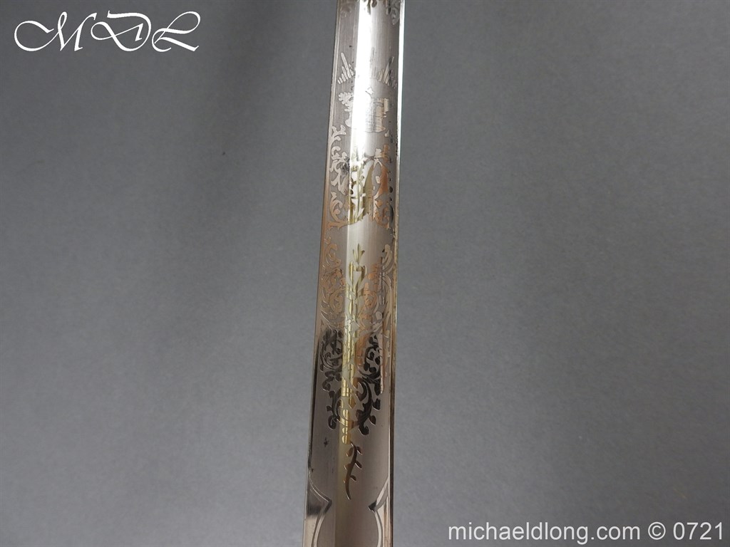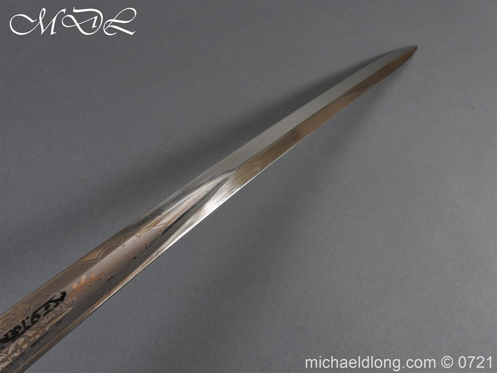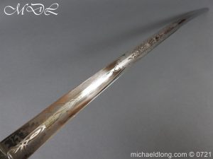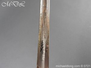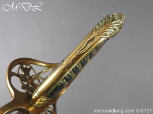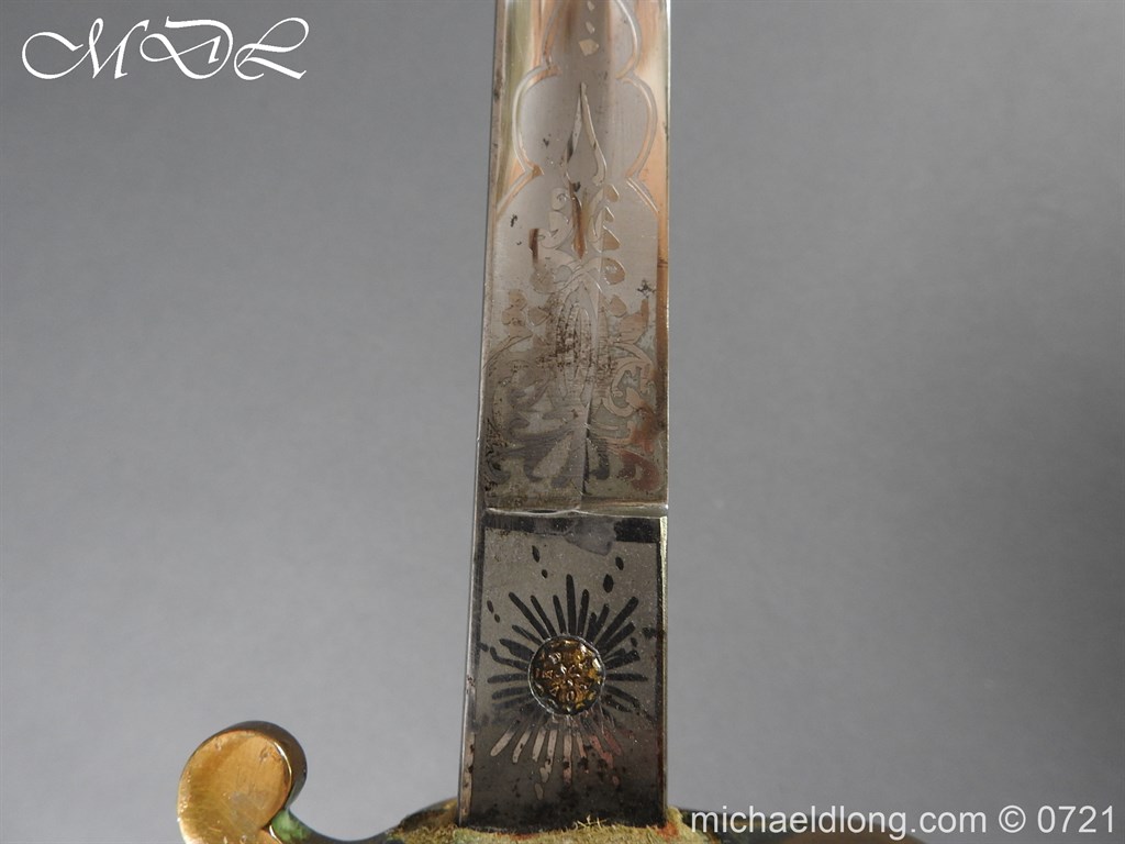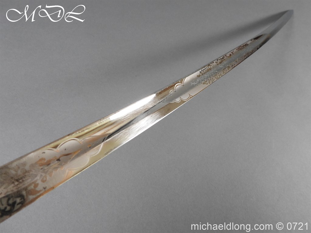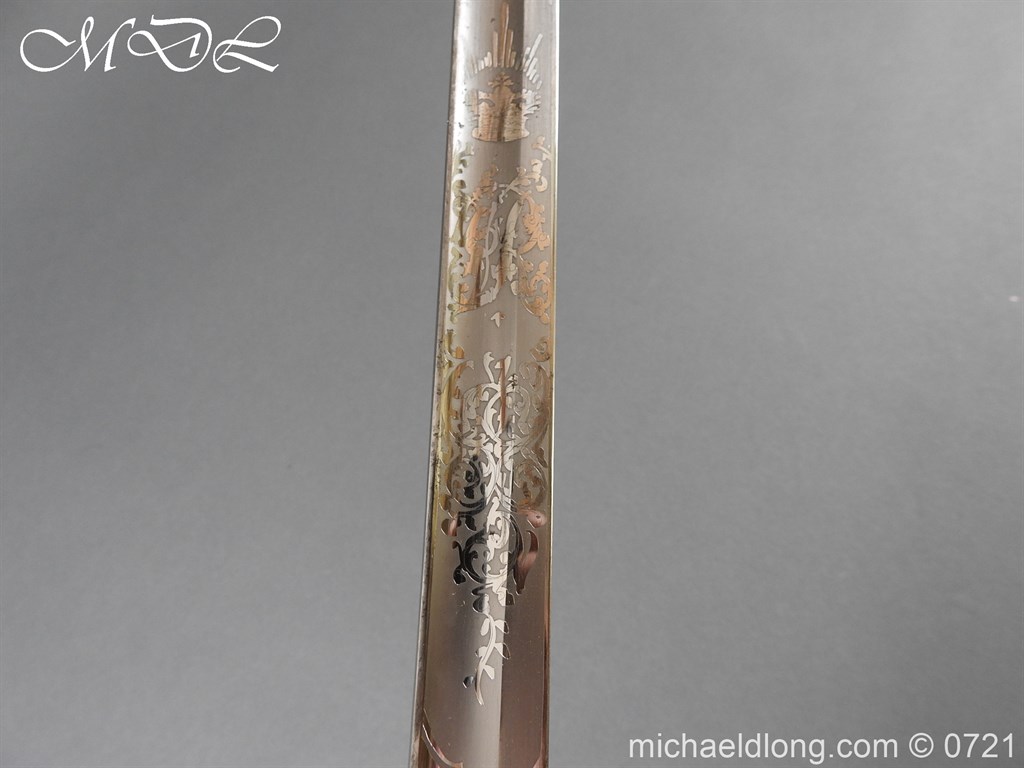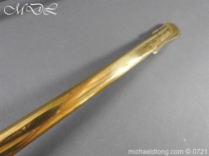 British 1822 Infantry Officer’s Sword, regulation brass hilt with Royal cipher and Victorian crown, folding side guard, fish skin grip and decorative back strap. Slightly curved blade etched with VR and Crown plus floral decoration to both side with Galt Portsmouth and proof plug. Complete with brass scabbard.