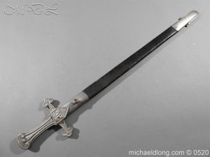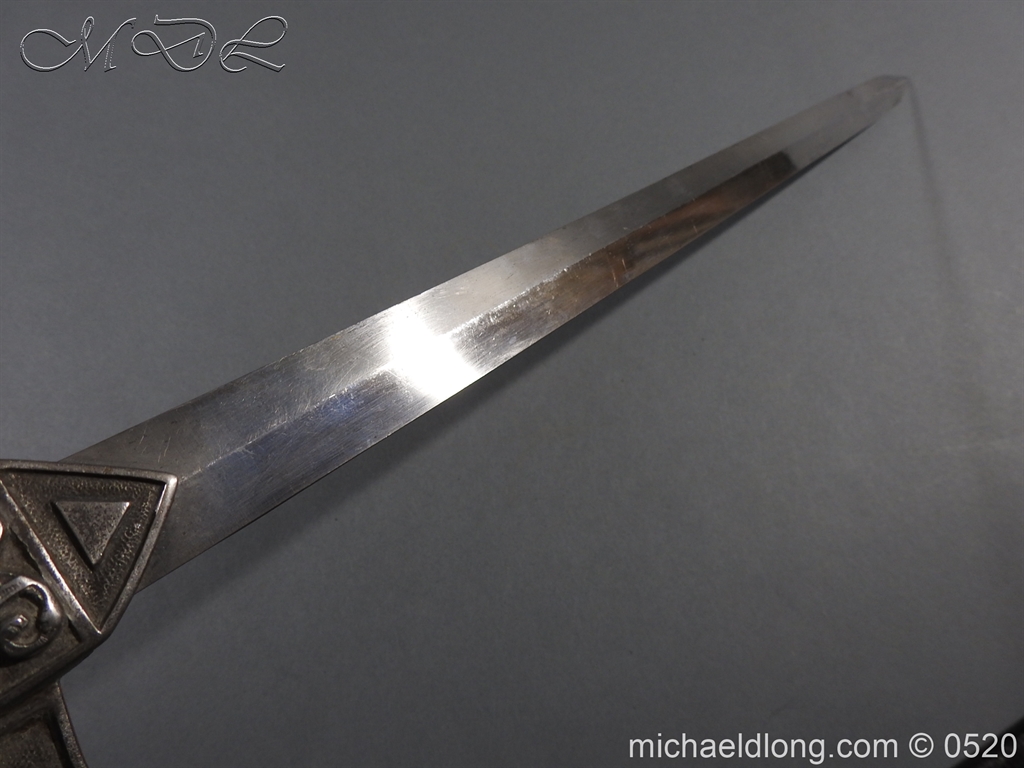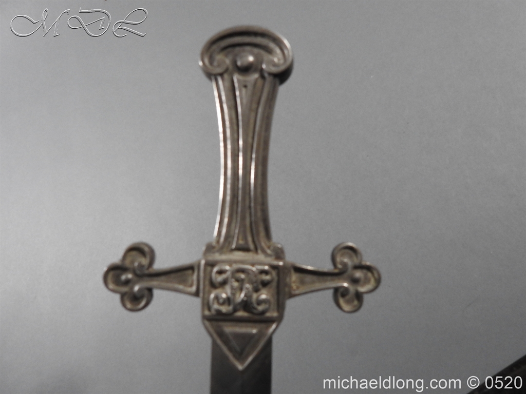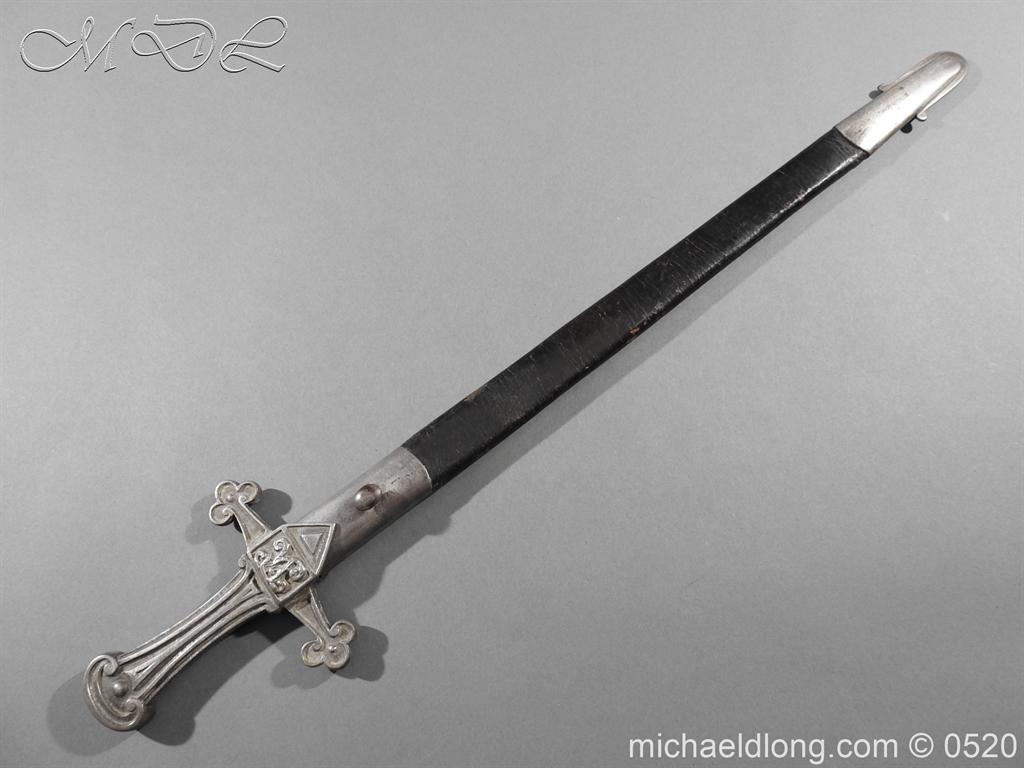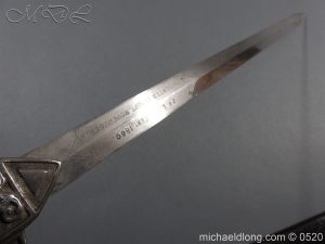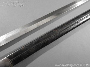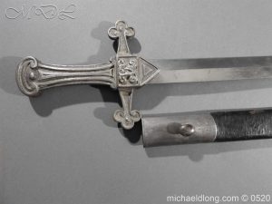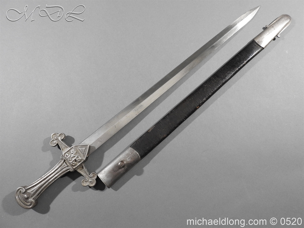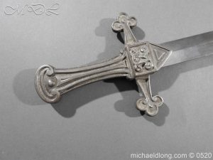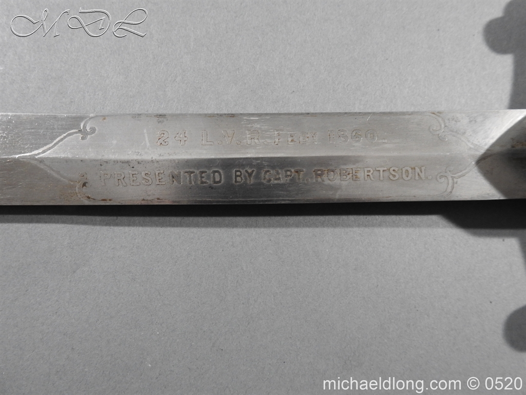One piece Gothic cast iron grip and crossguard with central VR cipher. Steel double edged spear point blade. Blade engraved “ 24. L.V.R Feby 1860” over “ Presented by Captain Robertson” , no makers marks. In its steel mounted black leather scabbard, Locket marked 1 over 2 L. Loa 671mm Blade 533mm