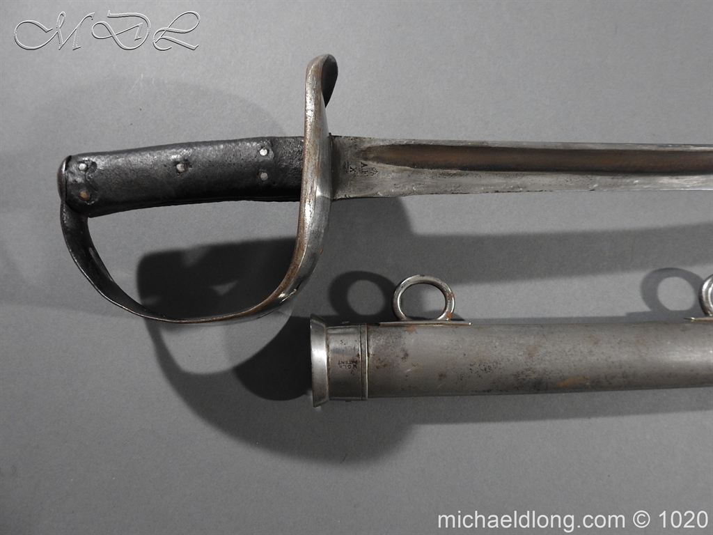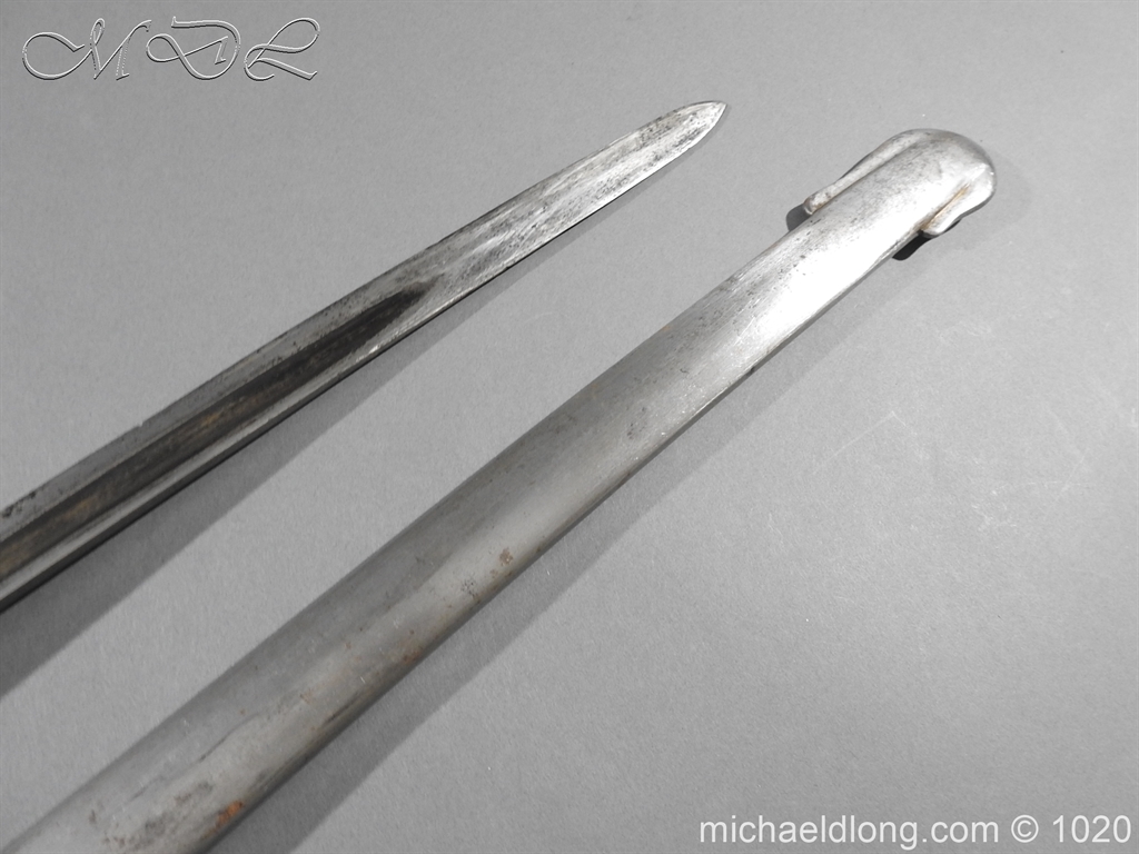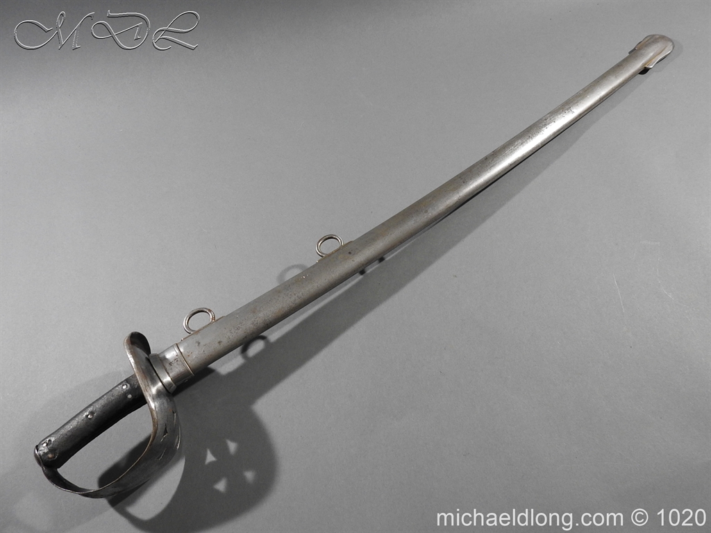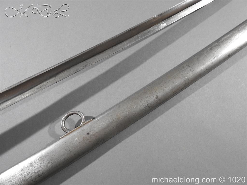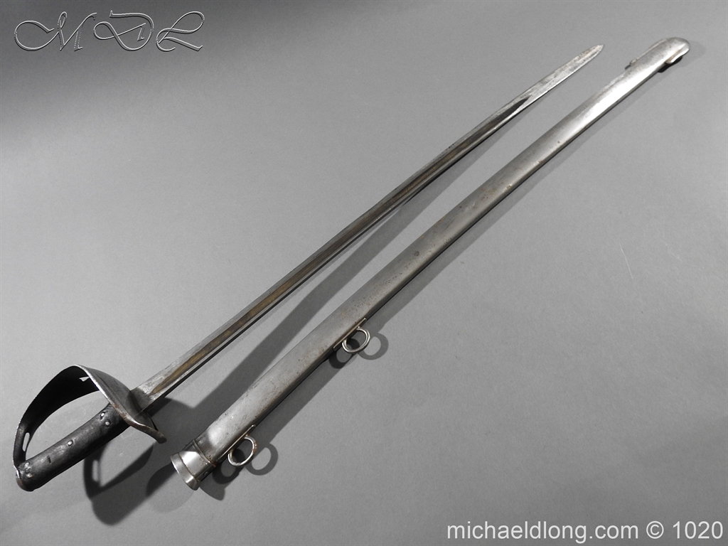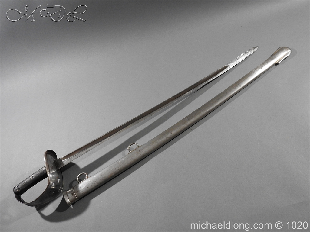 British 1882 Troopers Cavalry Sword, regulation hilt slab grips showing age wear. The blade flat backed with single fuller each side has been sharpened for service and stamped with W D plus a number of issue – inspection marks. Complete with steel scabbard with 2 fixed rings