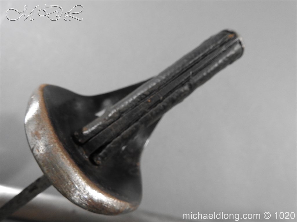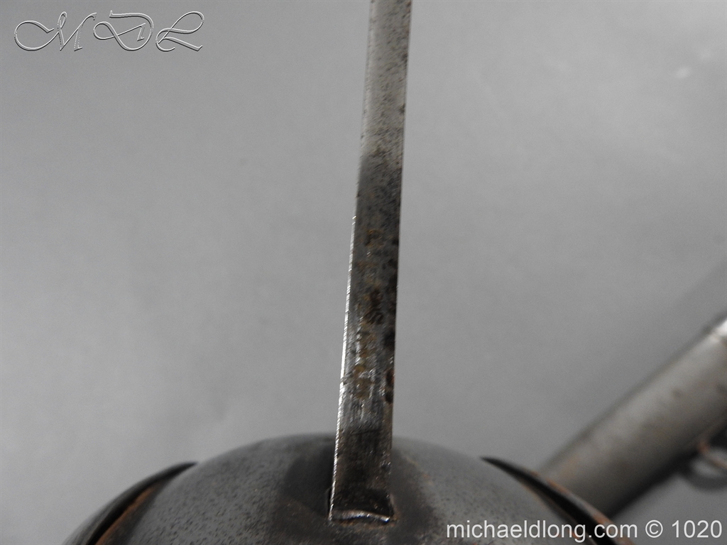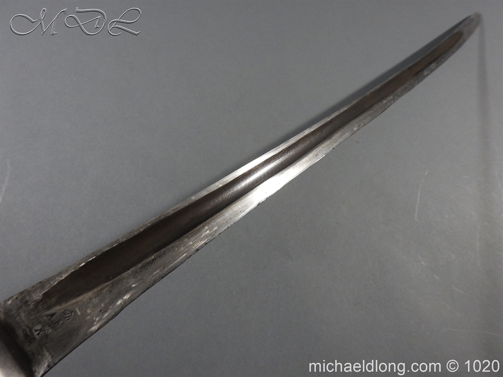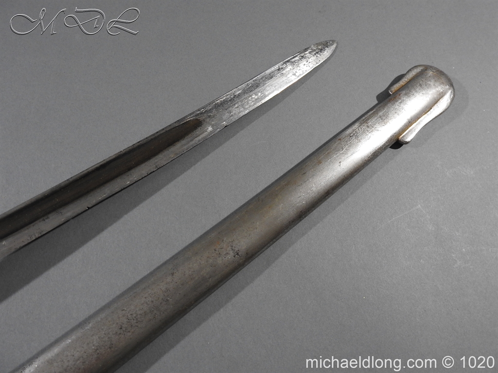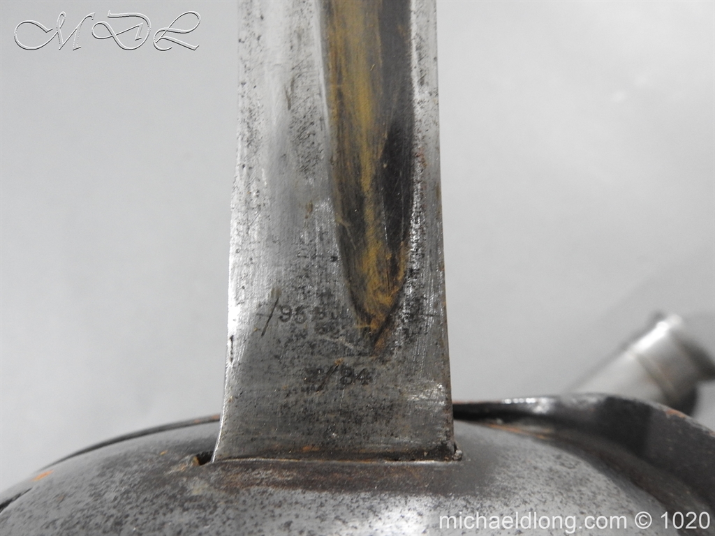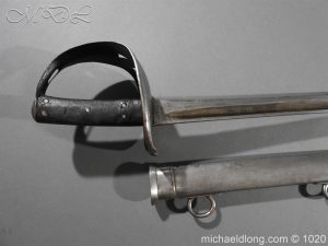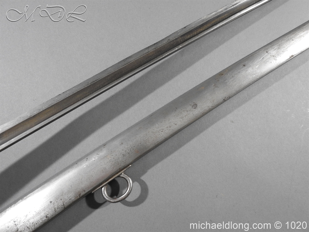 British 1882 Troopers Cavalry Sword, regulation hilt slab grips showing age wear. The blade flat backed with single fuller each side has been sharpened for service and stamped with W D plus a number of issue – inspection marks. Complete with steel scabbard with 2 fixed rings