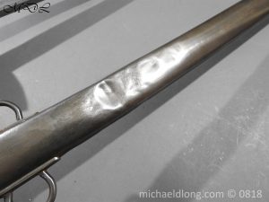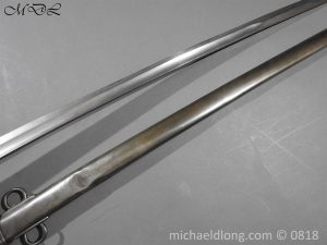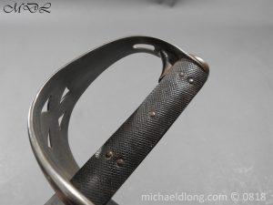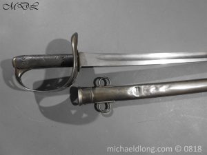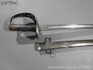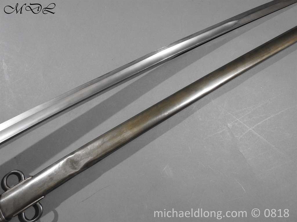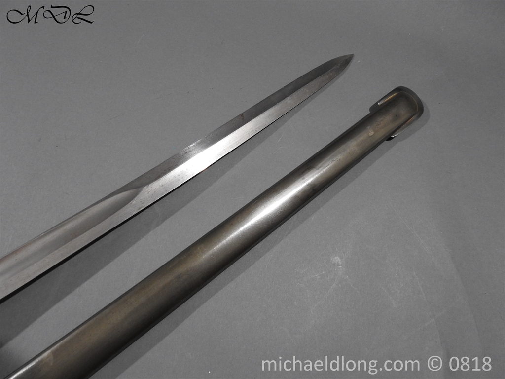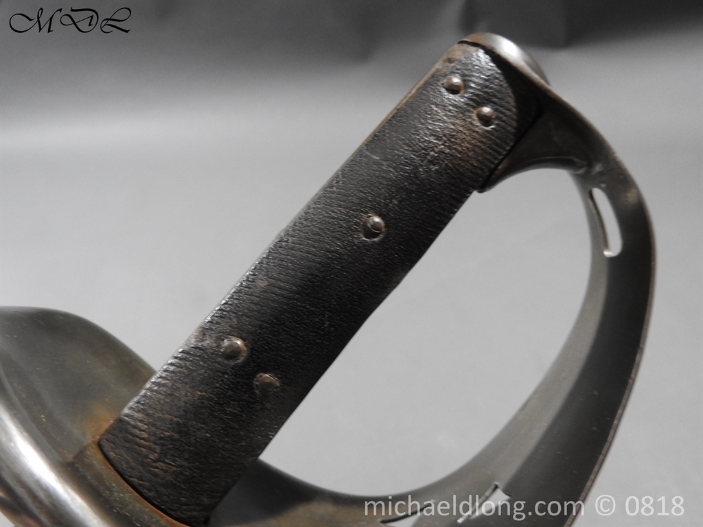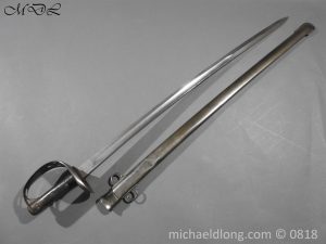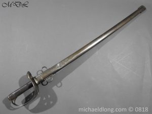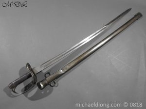 1885 trooper’s cavalry sword, steel bowl guard with Maltese cross leather chequered grips riveted either side to the tang. The blade is flat back with fuller being double edged for the last 10 inches and complete with matching steel scabbard please note dents below hanging rings. The blade is stamped 85 Dimensions: Blade Length: 85 cm – Overall Length: 98 cm
