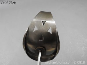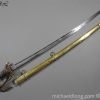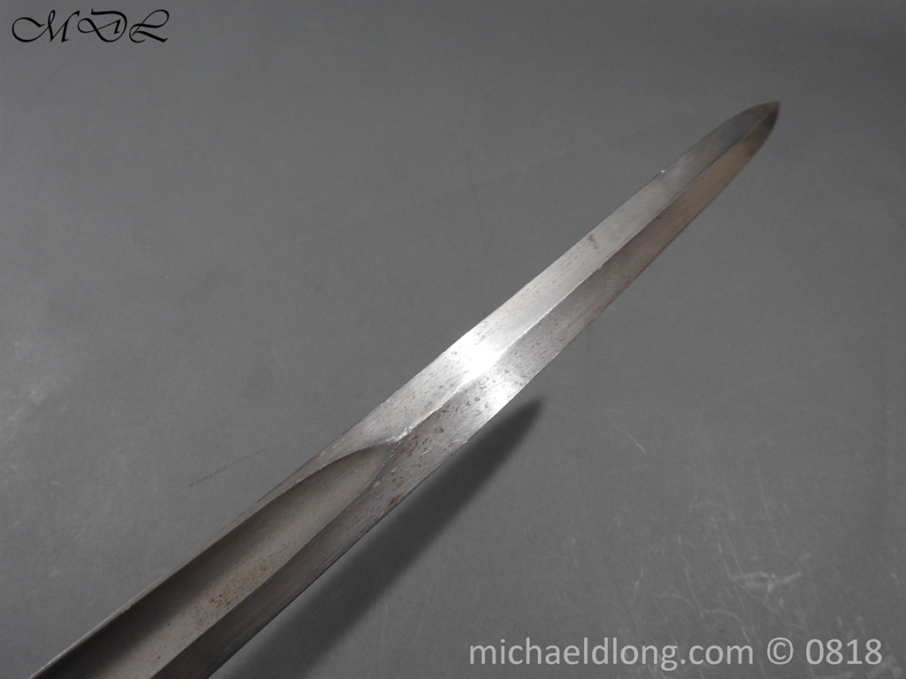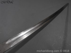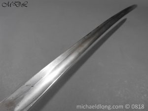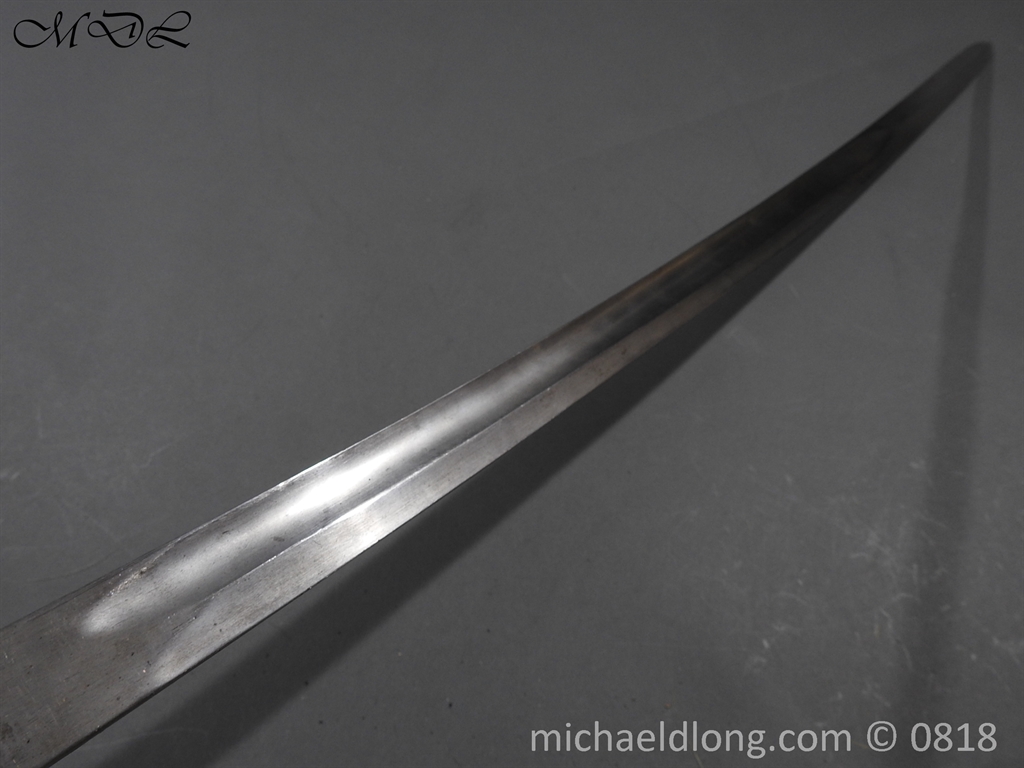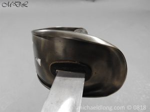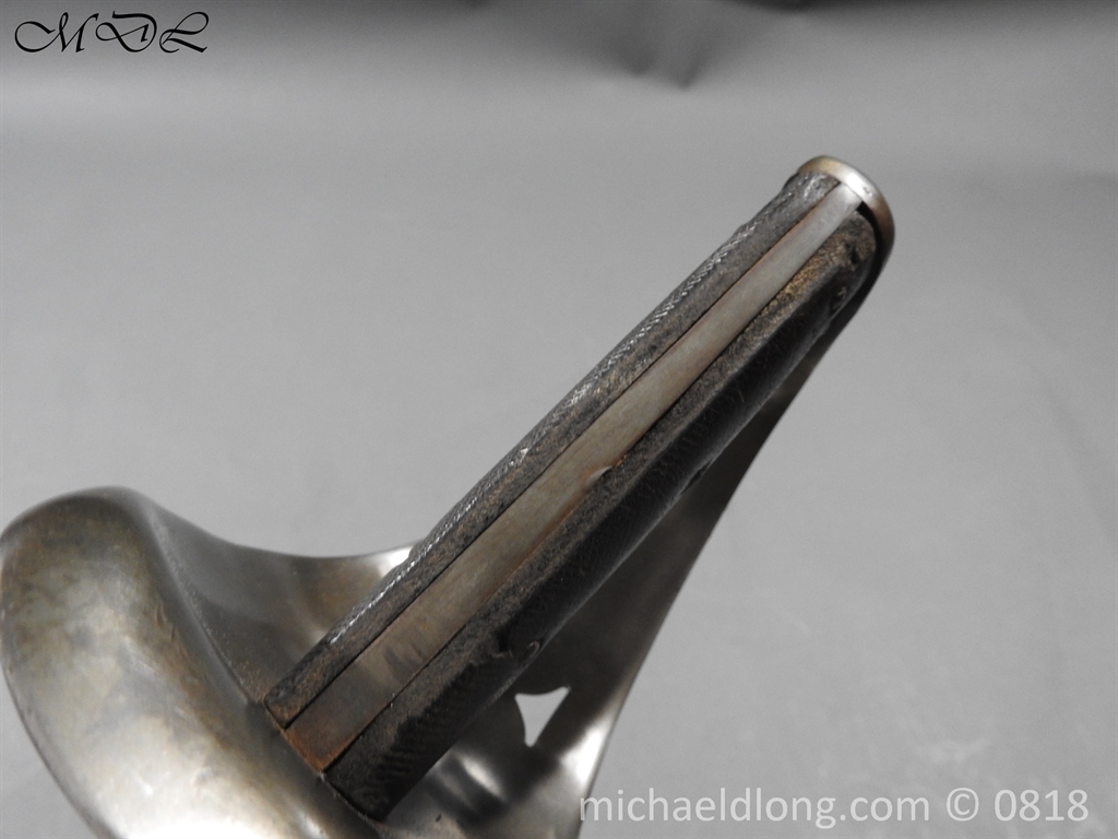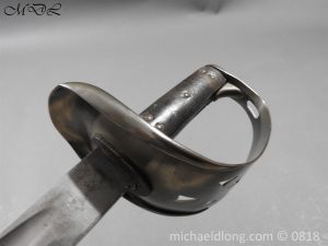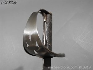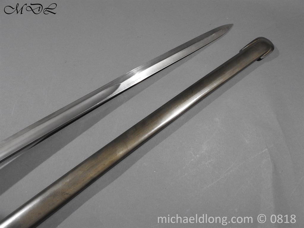 1885 trooper’s cavalry sword, steel bowl guard with Maltese cross leather chequered grips riveted either side to the tang. The blade is flat back with fuller being double edged for the last 10 inches and complete with matching steel scabbard please note dents below hanging rings. The blade is stamped 85 Dimensions: Blade Length: 85 cm – Overall Length: 98 cm