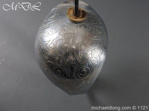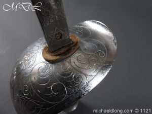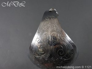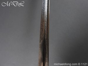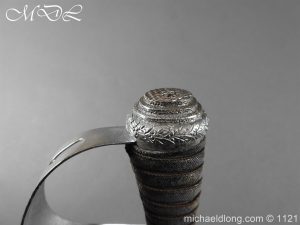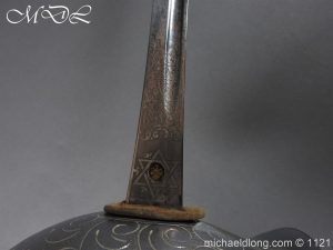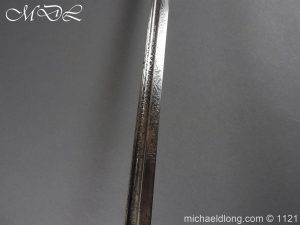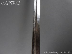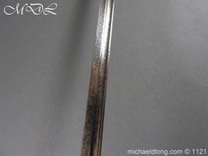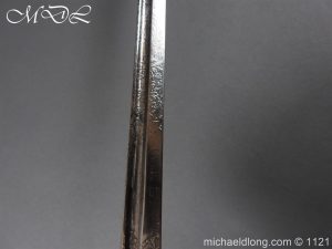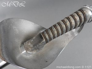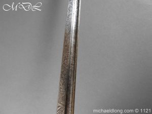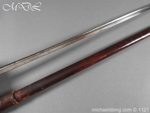 British 1912 Indian pattern Officer’s Sword regulation 1912 hilt but with G R I and crown stepped pommel and fish skin grip. Regulation blade with spear point etched with foliage crown over Royal crest and G R I plus owners initials G J S and retails address A C Harris London. The back edge marked Made in England and numbered 15320. Complete with field service scabbard. Information: Swords of the British Army by Brian Robson Revised Edition page 101 – Blade Length: 34.75 inches – Overall Length: 42 inches