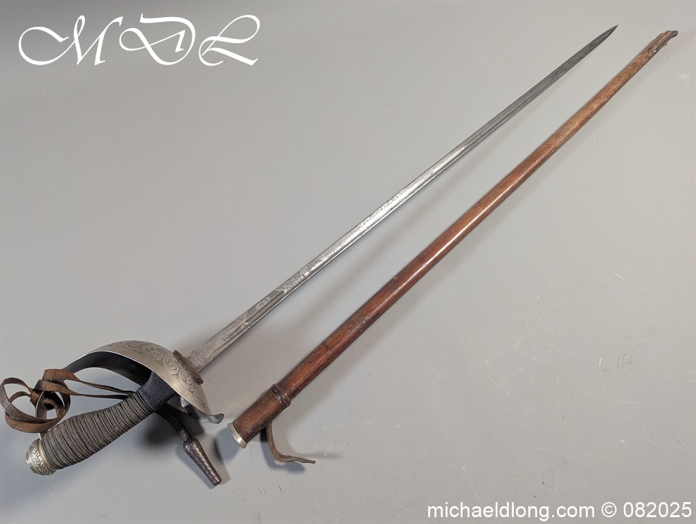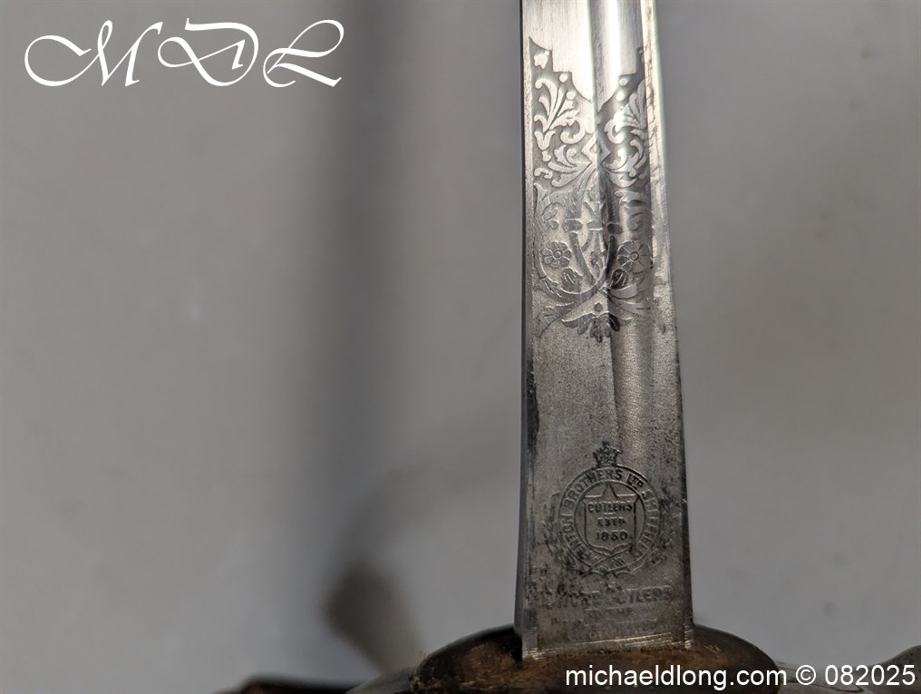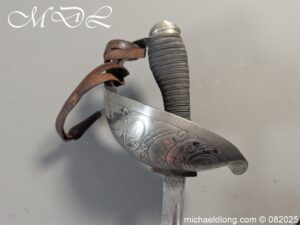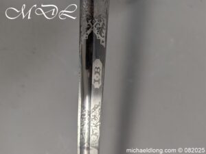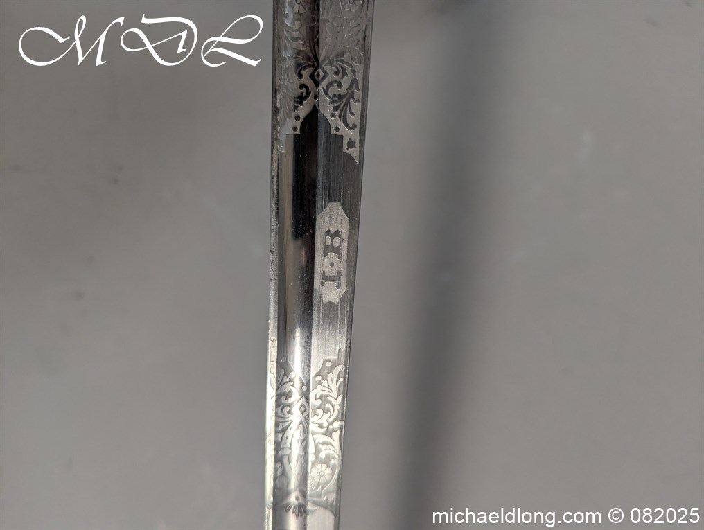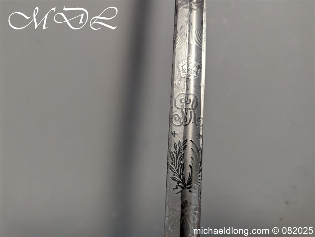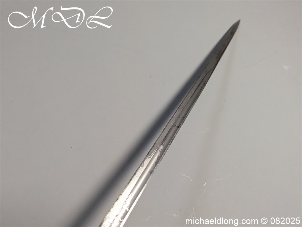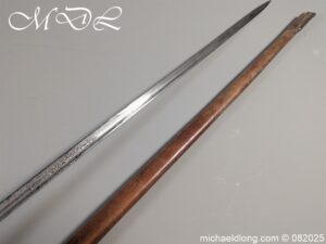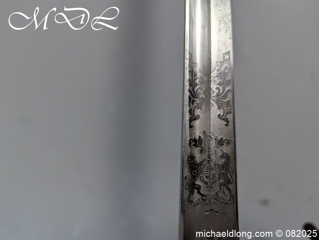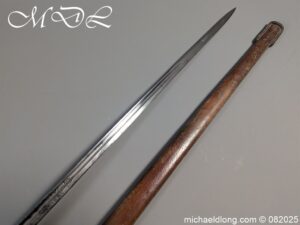 WW1 period straight single fullered blade with flat back and spear point 89cm in length. The blade is decorated on one side with the crowned royal cypher for George V, and on the other with the crowned royal coat of arms. On both sides there scrolling foliate designs. On one side there is the makers name in a crest and on the other a engraved proof plus owner initials I B. Plated steel bowl guard heavily embossed with a honeysuckle ladder pattern. Fish skin wrapped grip with brass wire and embossed stepped pommel. Complete with field service knot and scabbard.