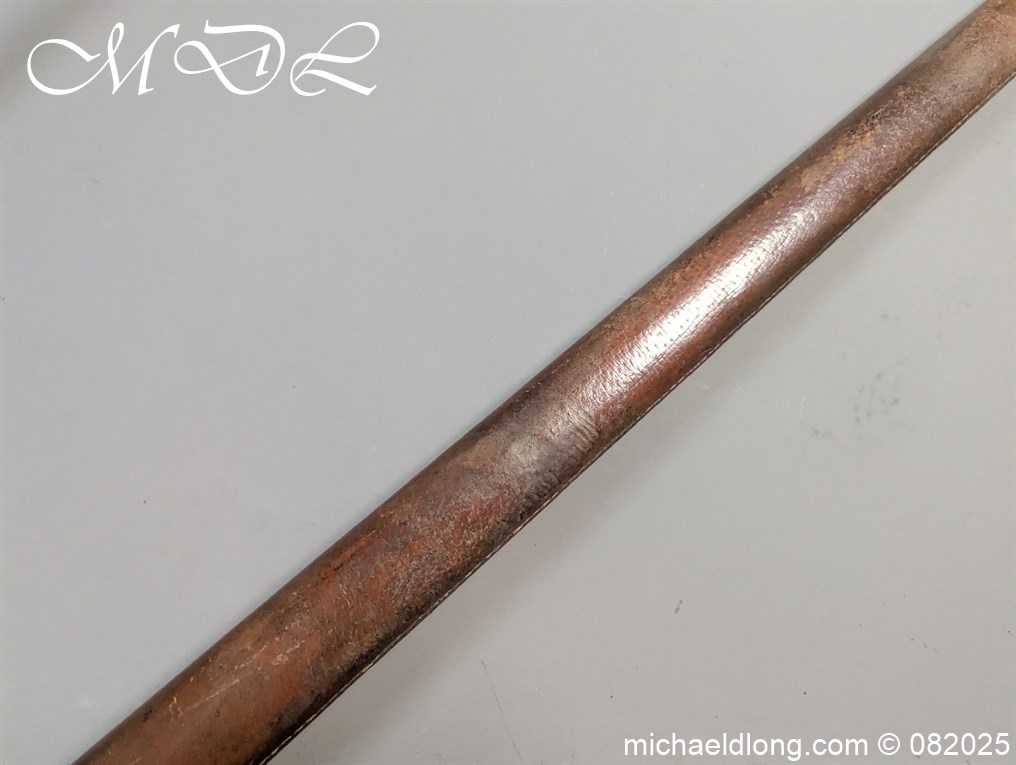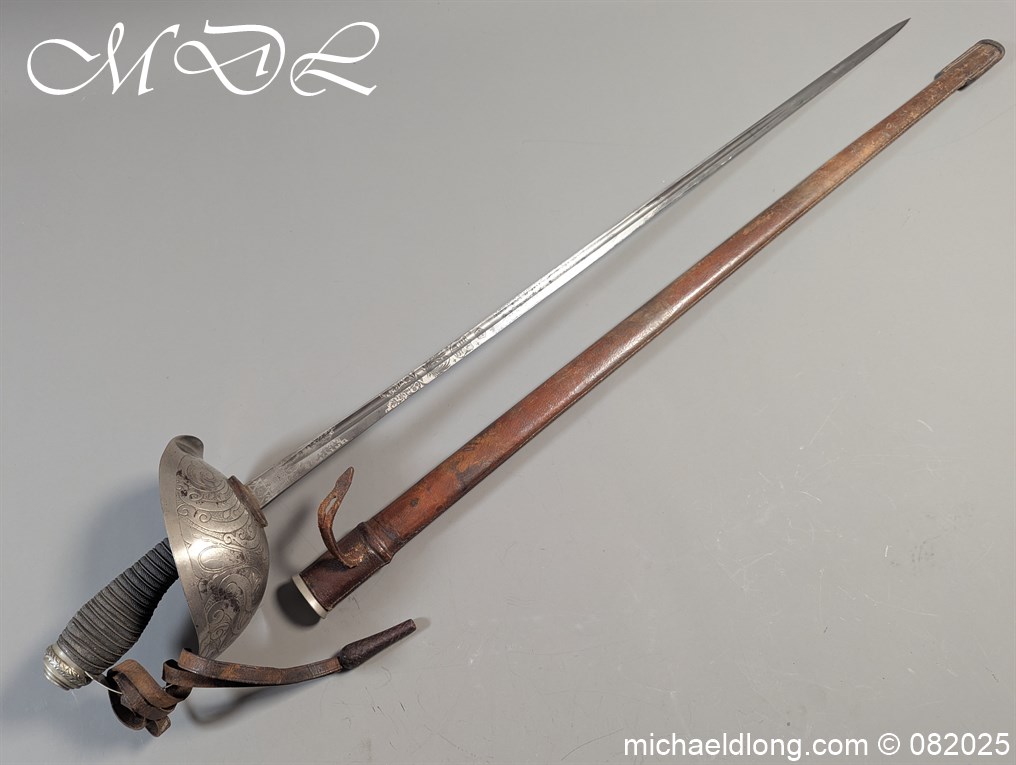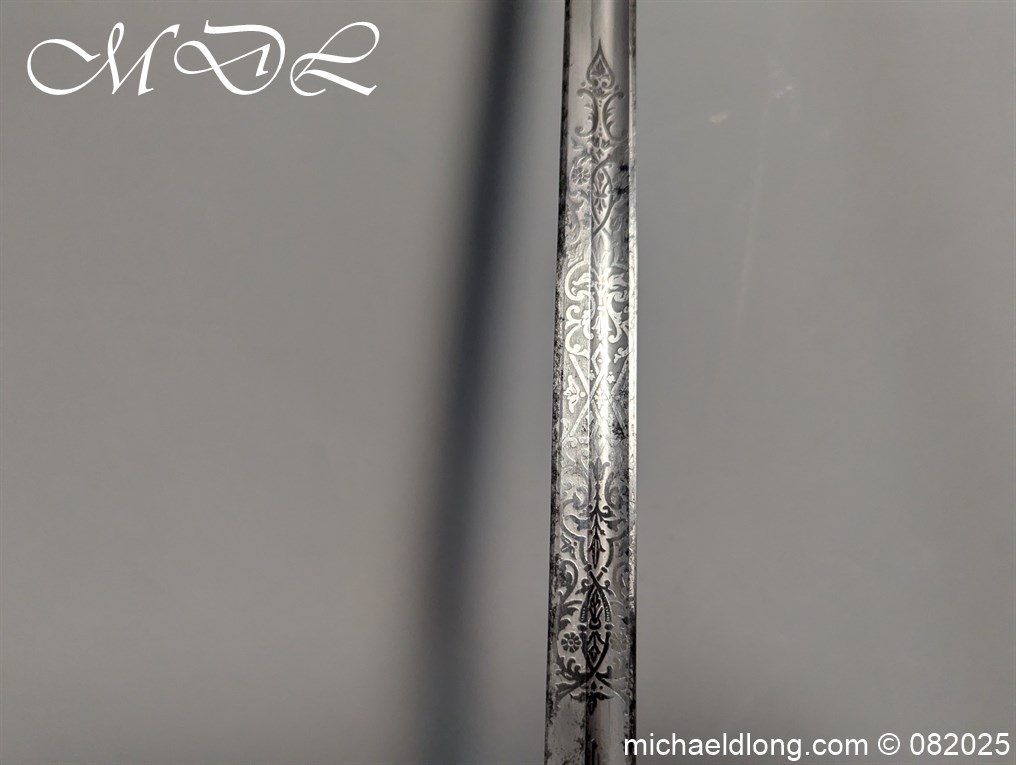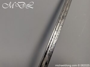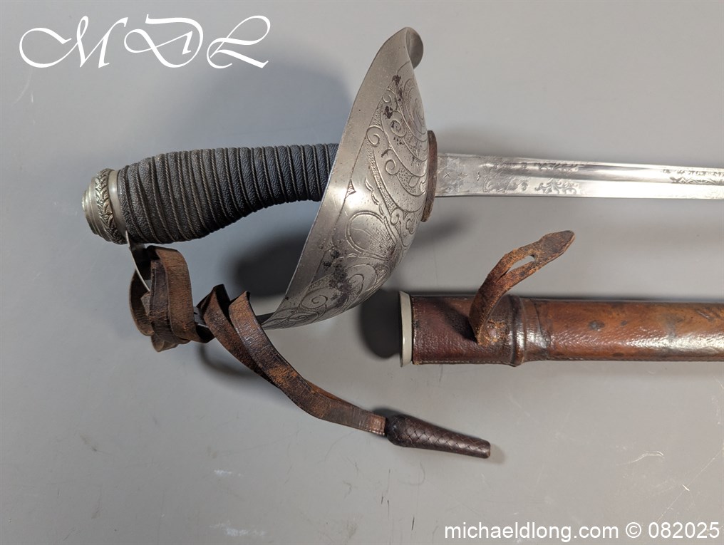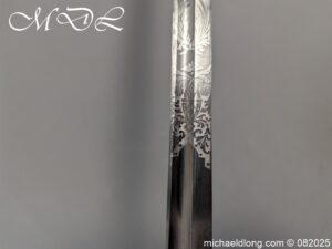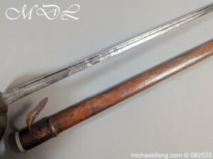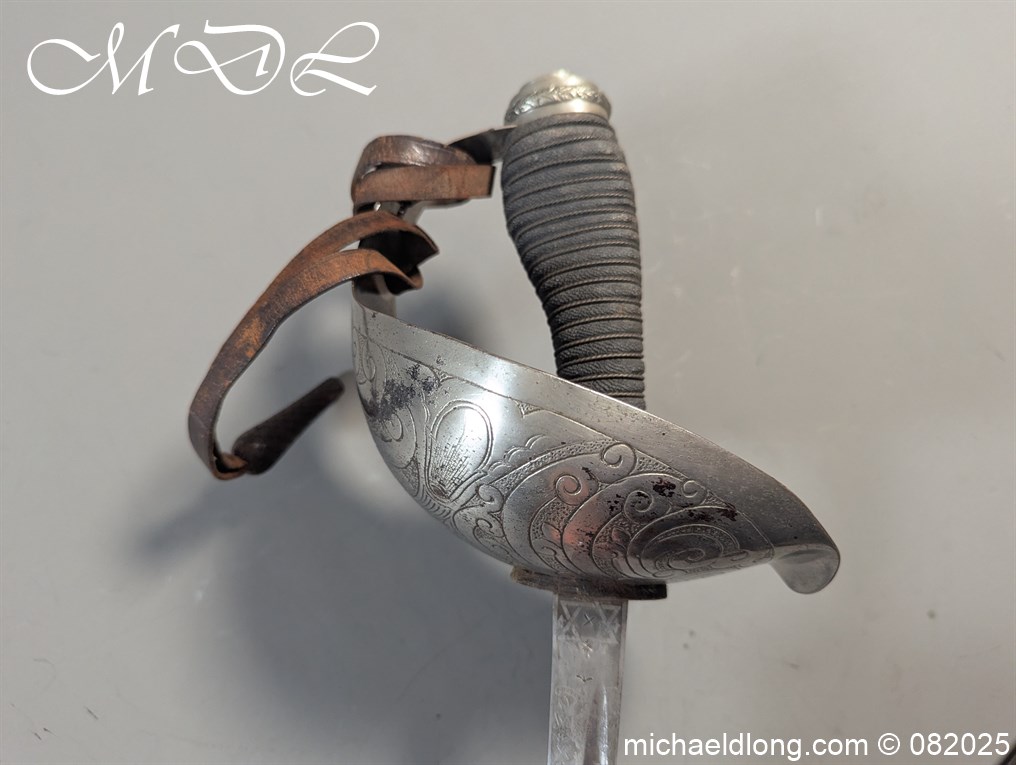 WW1 period straight single fullered blade with flat back and spear point 89cm in length. The blade is decorated on one side with the crowned royal cypher for George V, and on the other with the crowned royal coat of arms. On both sides there scrolling foliate designs. On one side there is the makers name in a crest and on the other a engraved proof plus owner initials I B. Plated steel bowl guard heavily embossed with a honeysuckle ladder pattern. Fish skin wrapped grip with brass wire and embossed stepped pommel. Complete with field service knot and scabbard.