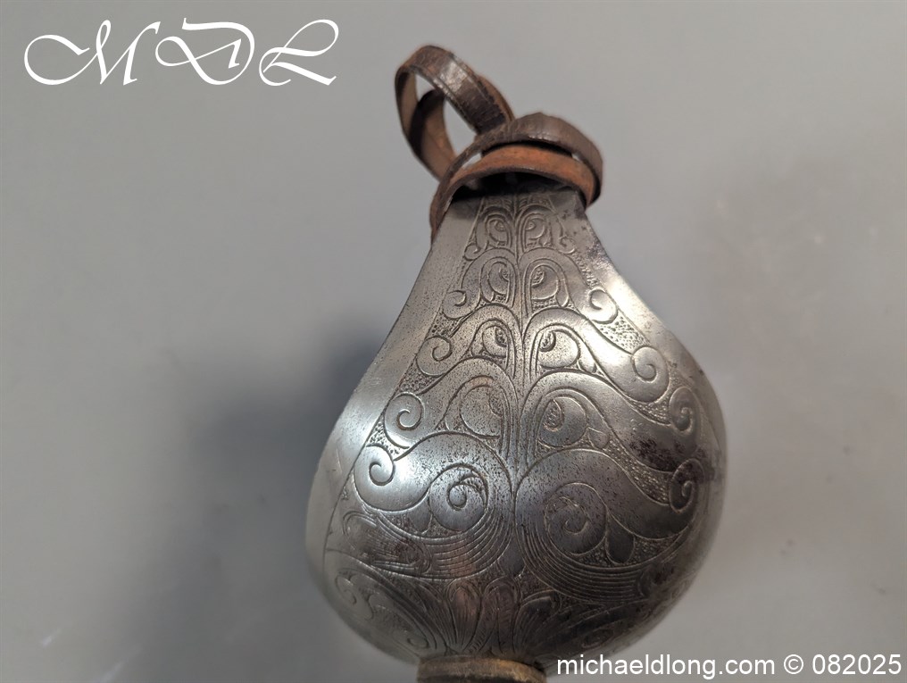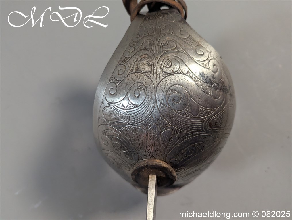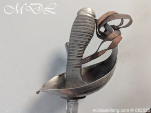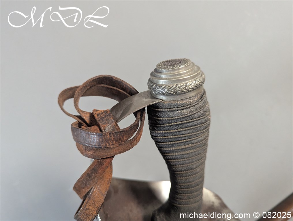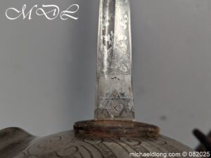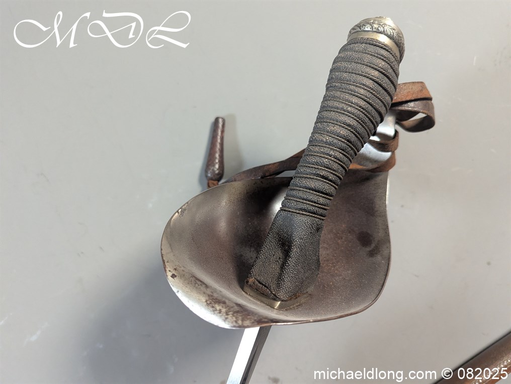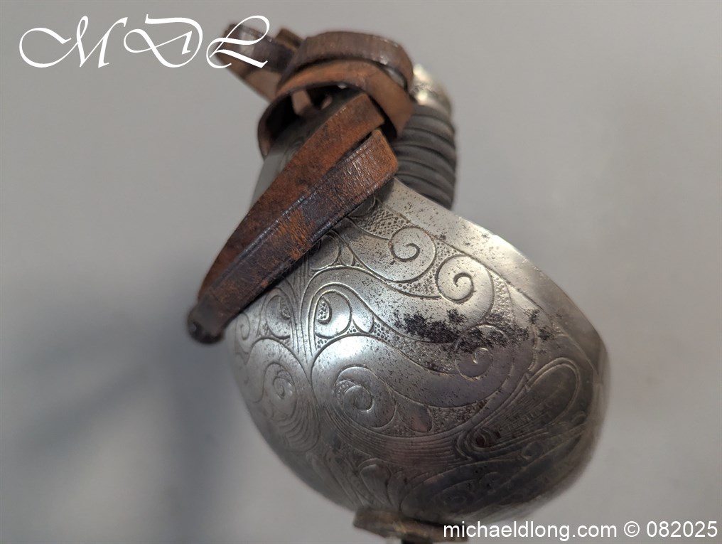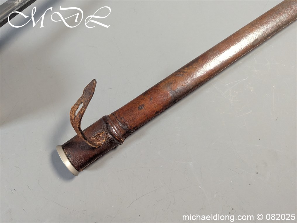 WW1 period straight single fullered blade with flat back and spear point 89cm in length. The blade is decorated on one side with the crowned royal cypher for George V, and on the other with the crowned royal coat of arms. On both sides there scrolling foliate designs. On one side there is the makers name in a crest and on the other a engraved proof plus owner initials I B. Plated steel bowl guard heavily embossed with a honeysuckle ladder pattern. Fish skin wrapped grip with brass wire and embossed stepped pommel. Complete with field service knot and scabbard.