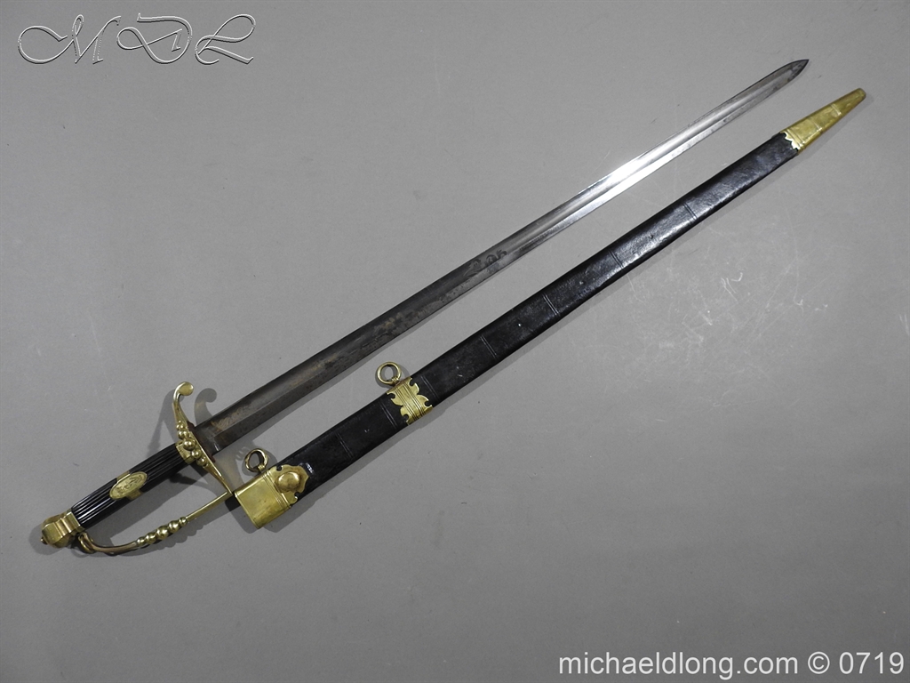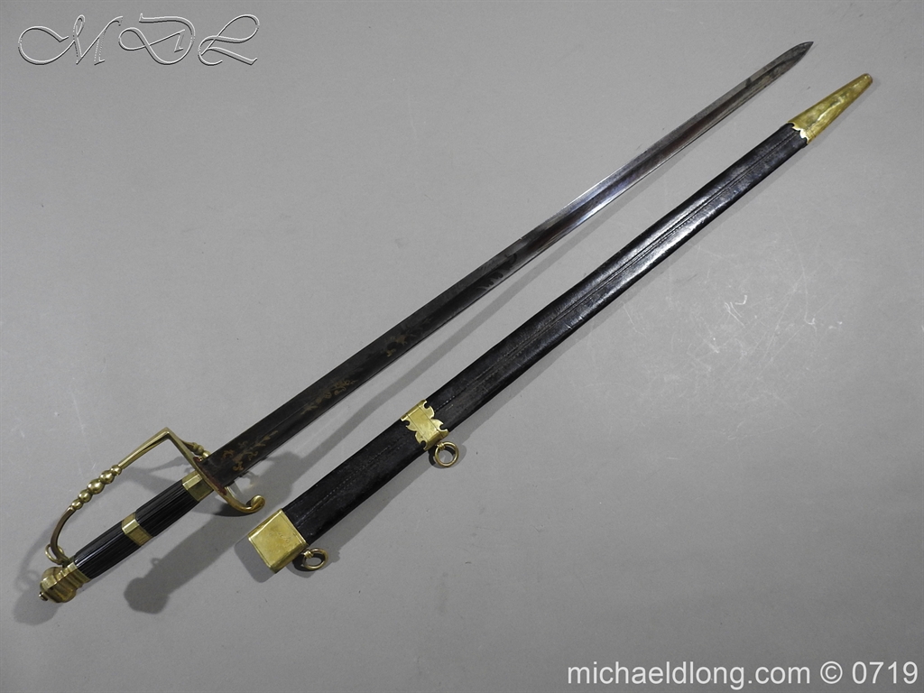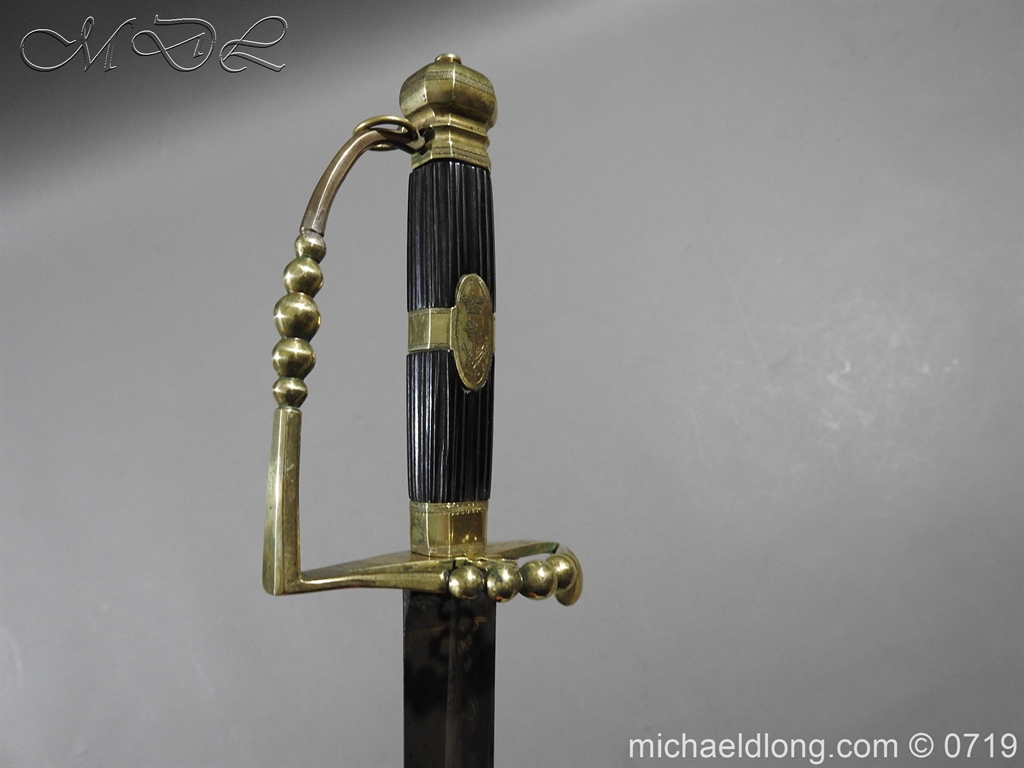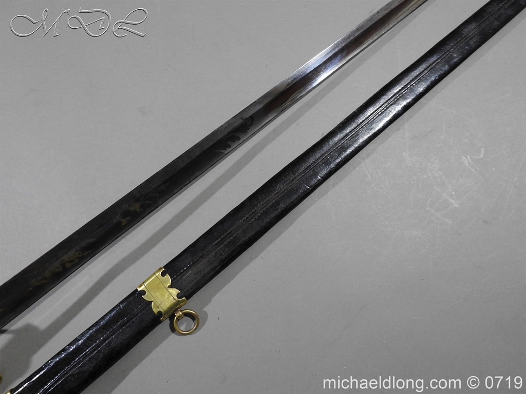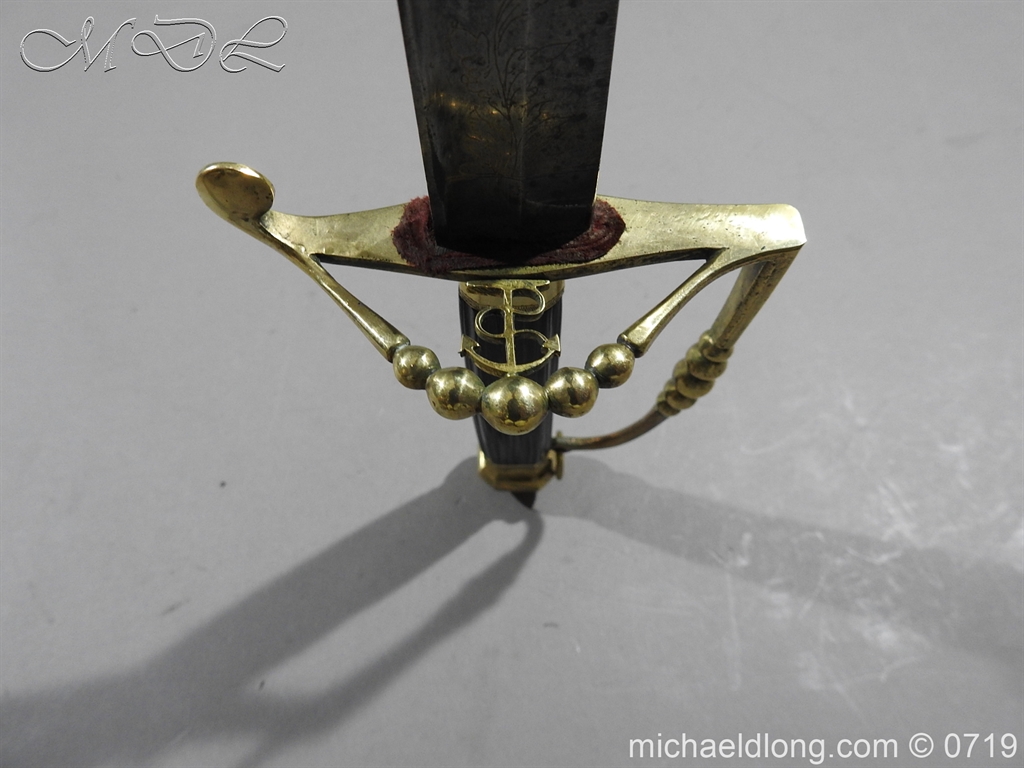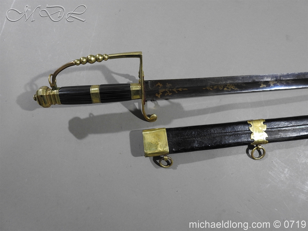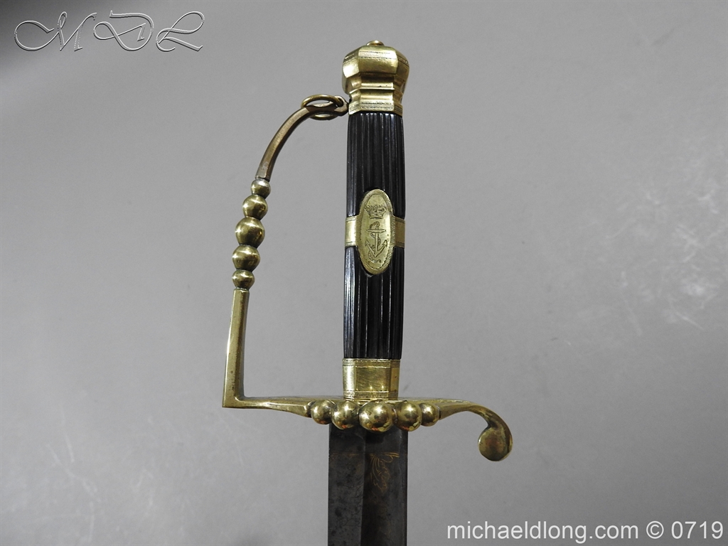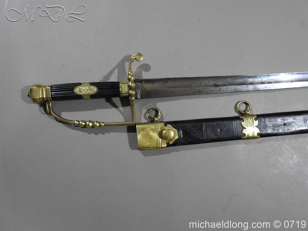 Excellent British naval officer’s sword gilt brass hilt with 5 ball design to guard and cross guard with inset anchor. Ebony fluted grip with inlayed oval disc with band engraved with crown and anchor. Straight single edged blade is engraved and with remains of blue and gilt decoration it is contains within original tooled black leather scabbard with gilt brass mounts 2 loose ring and frog stud overall length 83cm blade 68cm top scabbard mount with faint makers details – For Reference please see Swords for Sea Service plate 22