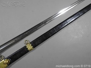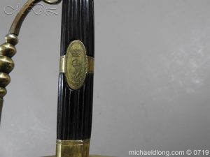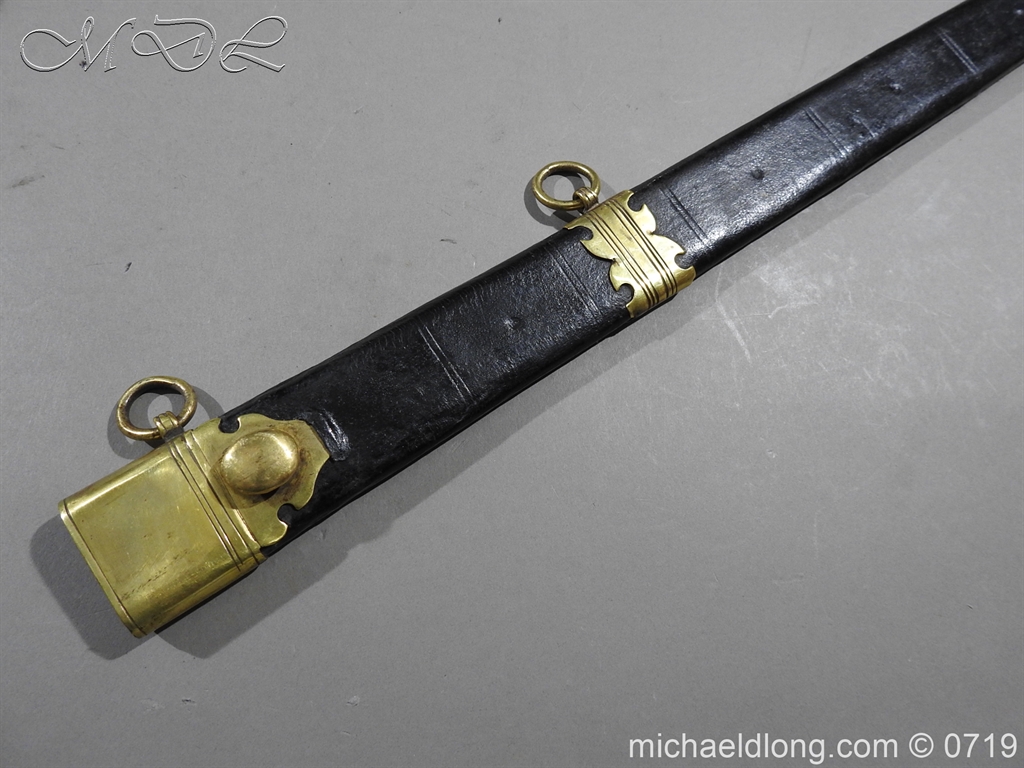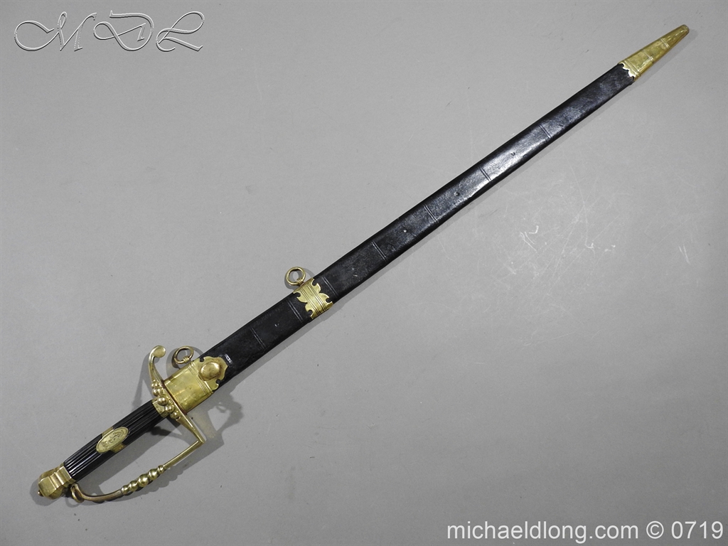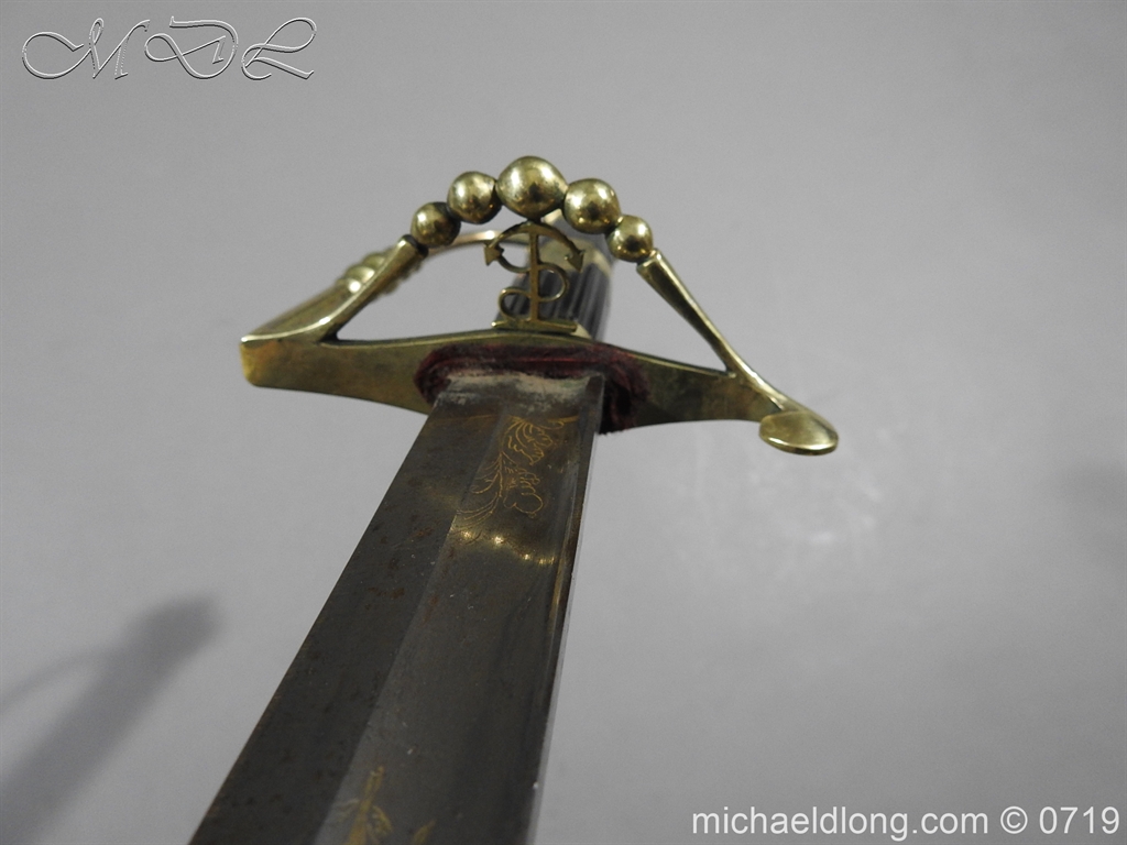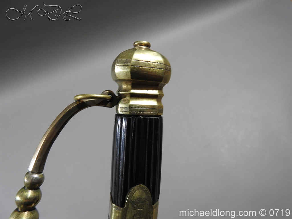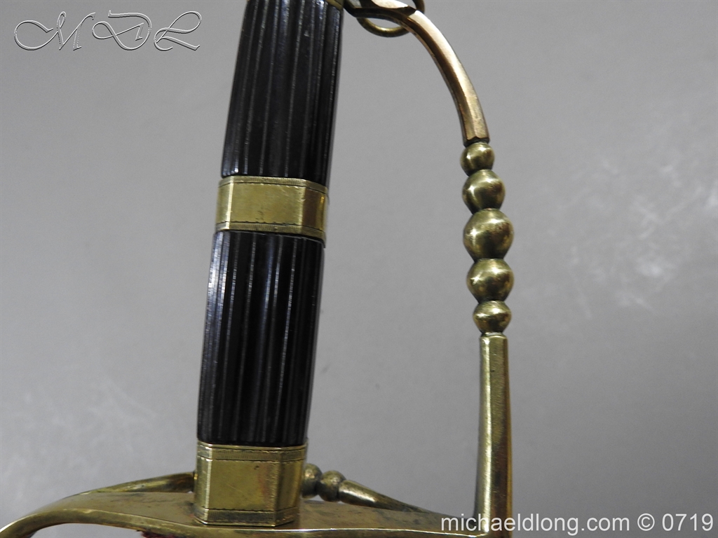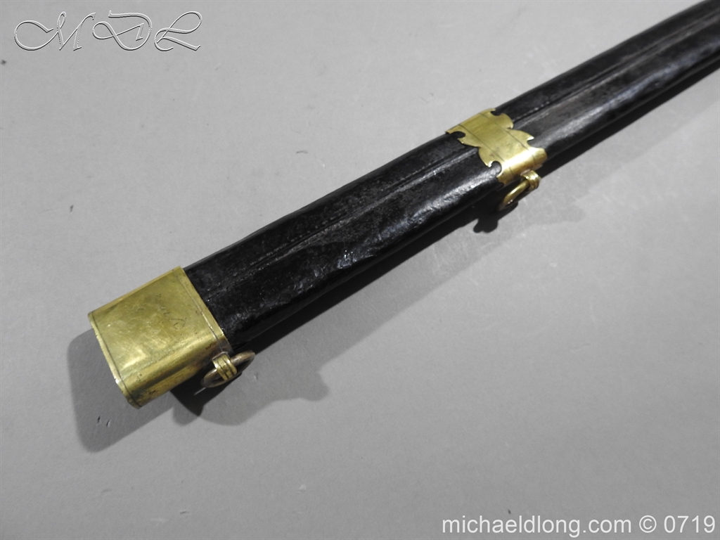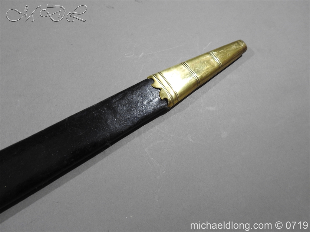 Excellent British naval officer’s sword gilt brass hilt with 5 ball design to guard and cross guard with inset anchor. Ebony fluted grip with inlayed oval disc with band engraved with crown and anchor. Straight single edged blade is engraved and with remains of blue and gilt decoration it is contains within original tooled black leather scabbard with gilt brass mounts 2 loose ring and frog stud overall length 83cm blade 68cm top scabbard mount with faint makers details – For Reference please see Swords for Sea Service plate 22