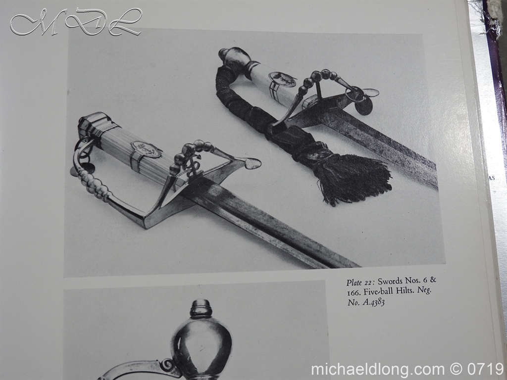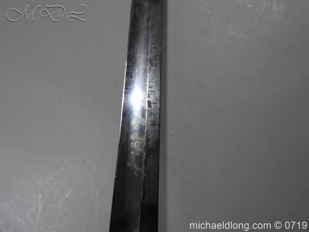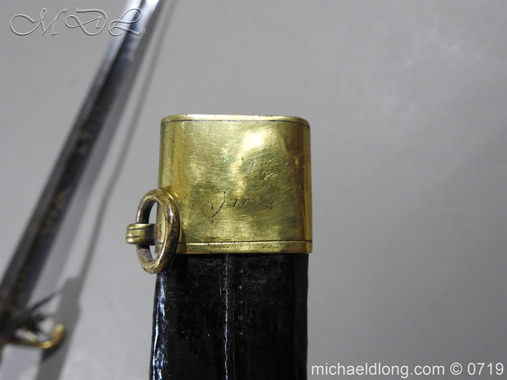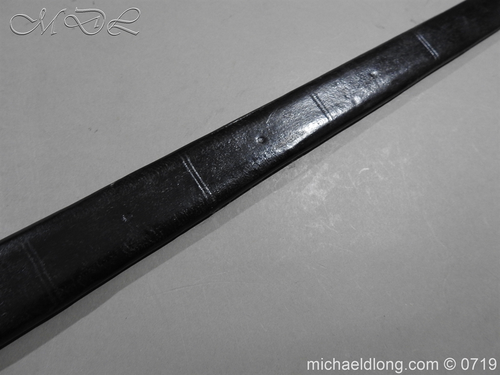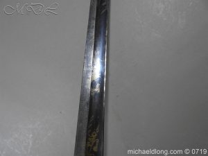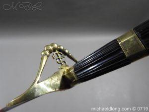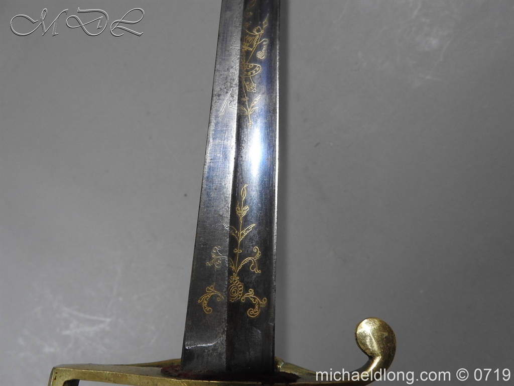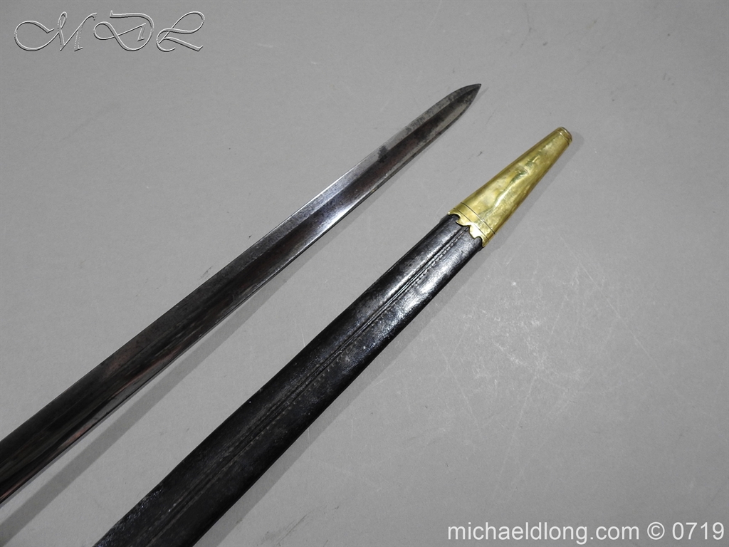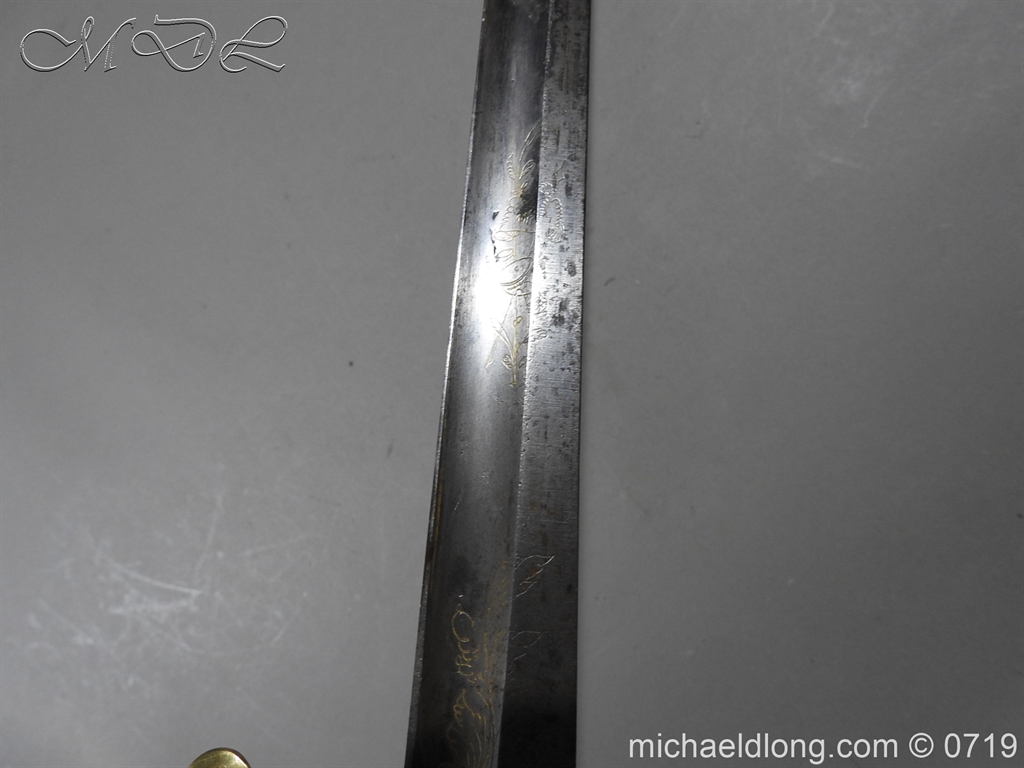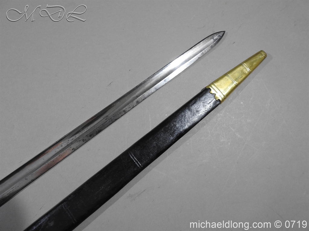 Excellent British naval officer’s sword gilt brass hilt with 5 ball design to guard and cross guard with inset anchor. Ebony fluted grip with inlayed oval disc with band engraved with crown and anchor. Straight single edged blade is engraved and with remains of blue and gilt decoration it is contains within original tooled black leather scabbard with gilt brass mounts 2 loose ring and frog stud overall length 83cm blade 68cm top scabbard mount with faint makers details – For Reference please see Swords for Sea Service plate 22