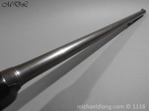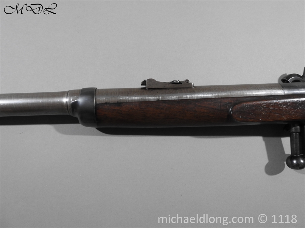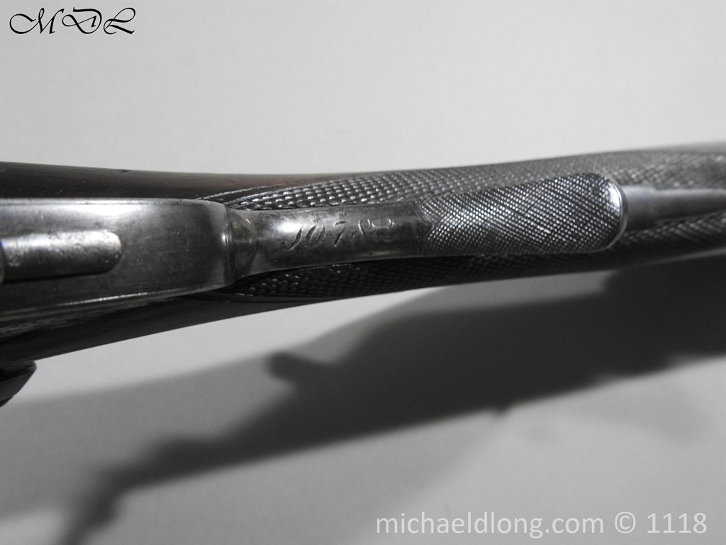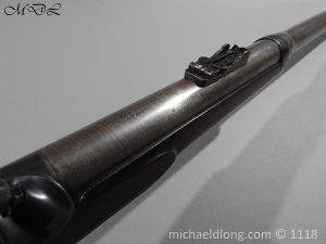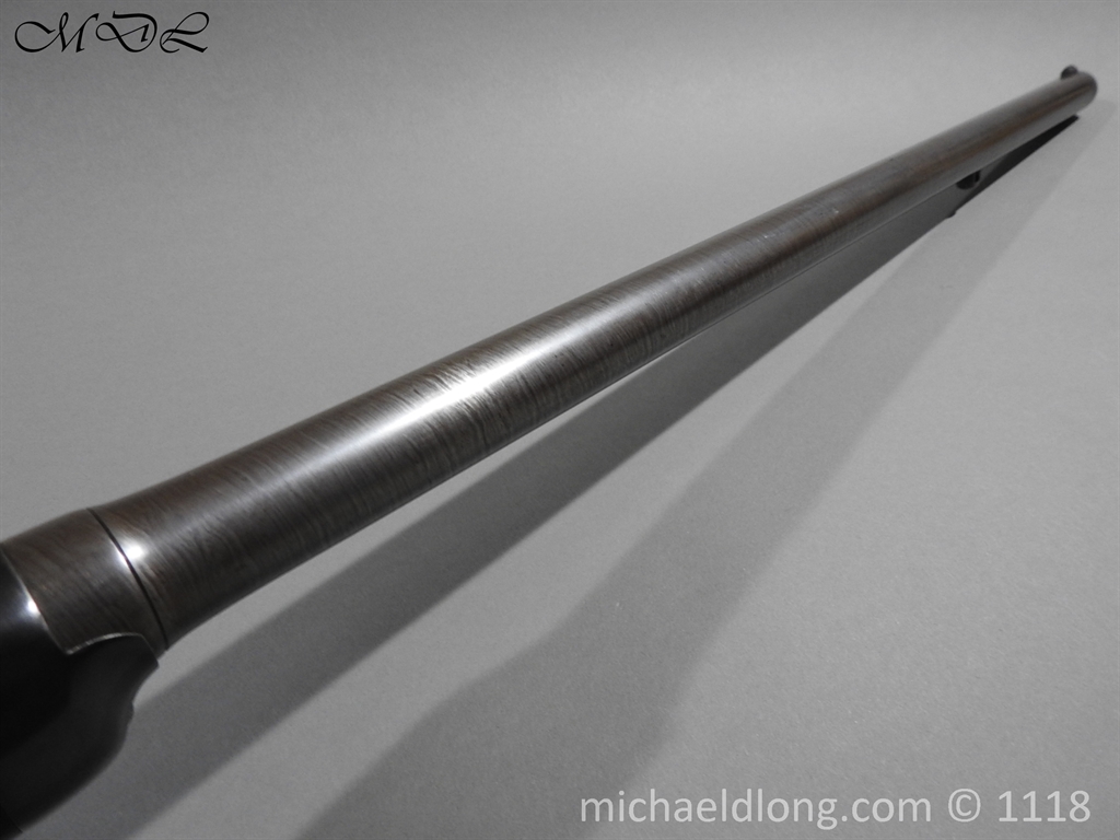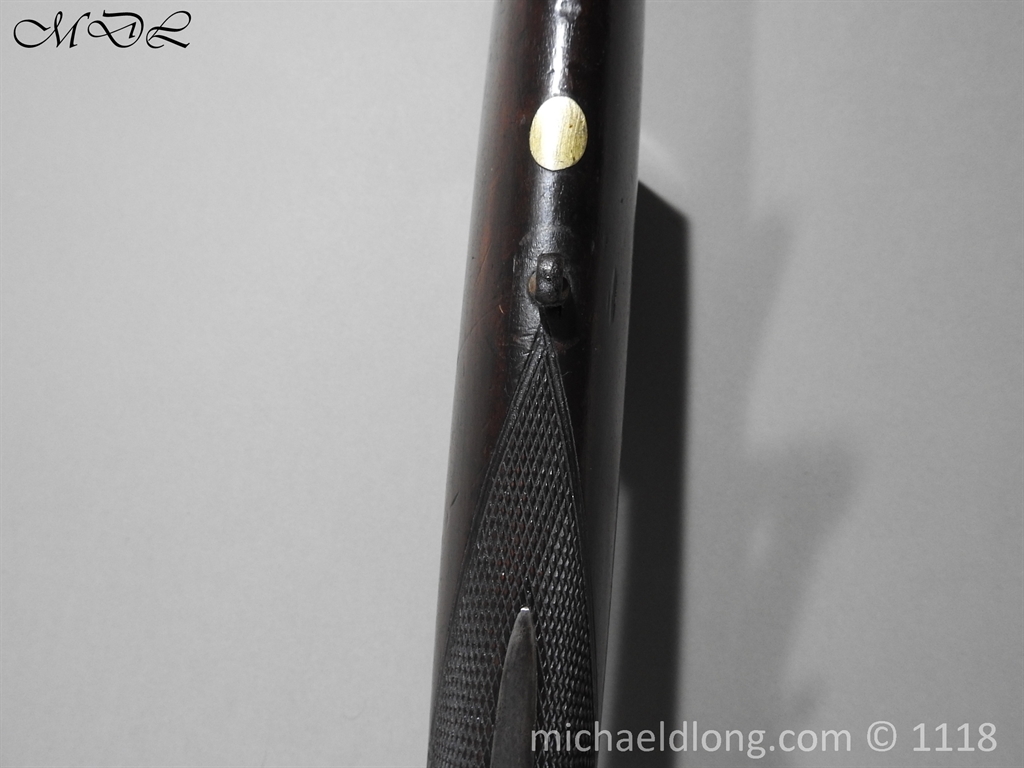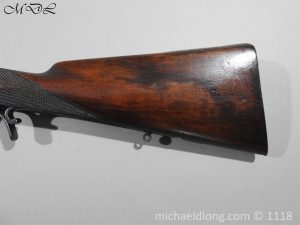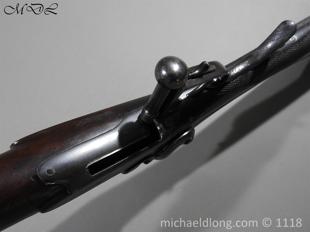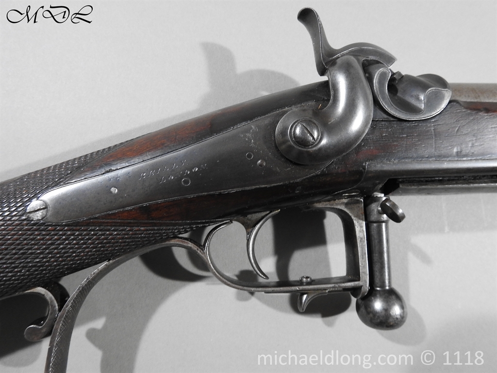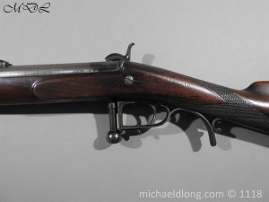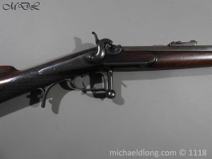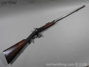 .577 Percussion capping breech loading Princes patent rifle by Reilly, London. Back action lock engraved Reilly London. Spur trigger guard squared at the front with locking slide that prevents breech opening bolt being moved. Walnut stock with iron furniture chequered to the wrist with the breech opening bolt to the underside forward of the trigger guard. Five grooved rifling, 31” long heavy military pattern Damascus twist steel .577calibre barrel fitted with a ladder rear sight to 1100 yards plus military pattern fixed front sight. The top of the barrel is engraved’ Reilly New Oxford Street London’ The front barrel band forms the runner which allows the whole barrel to move forward so the paper cartridge could be loaded and this in turn was ignited by the percussion cap. This was a very positive locking breech action which gave a good gas seal when used with felt based rounds. Numbered 10872 in front of the trigger spur. The Princes patent rifle outshot the Enfield Rifle in the 1855 Army trials. Free UK Mainland Shipping only