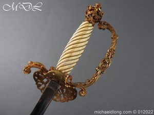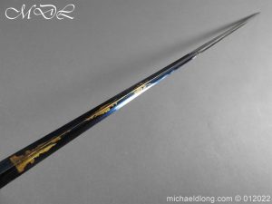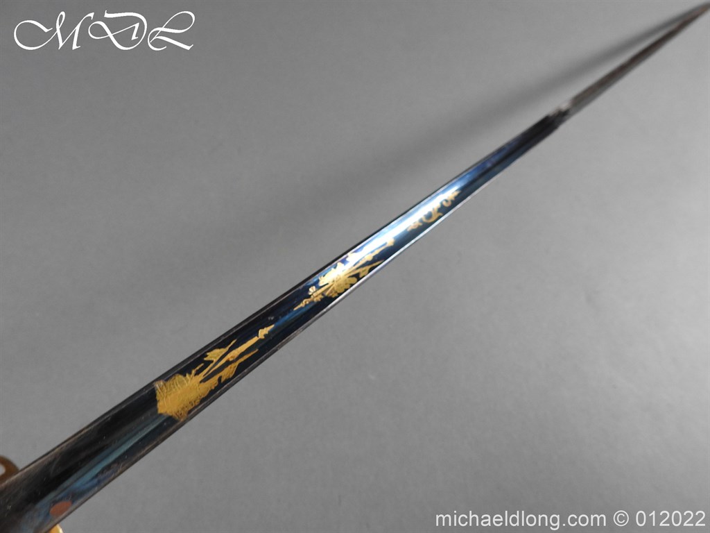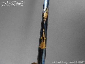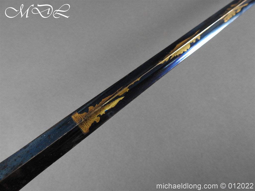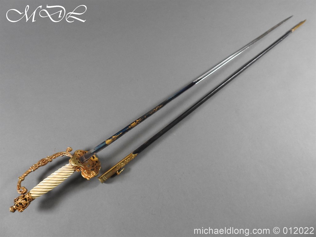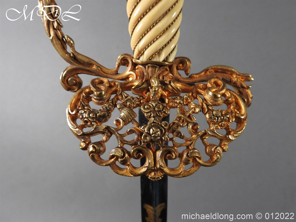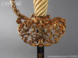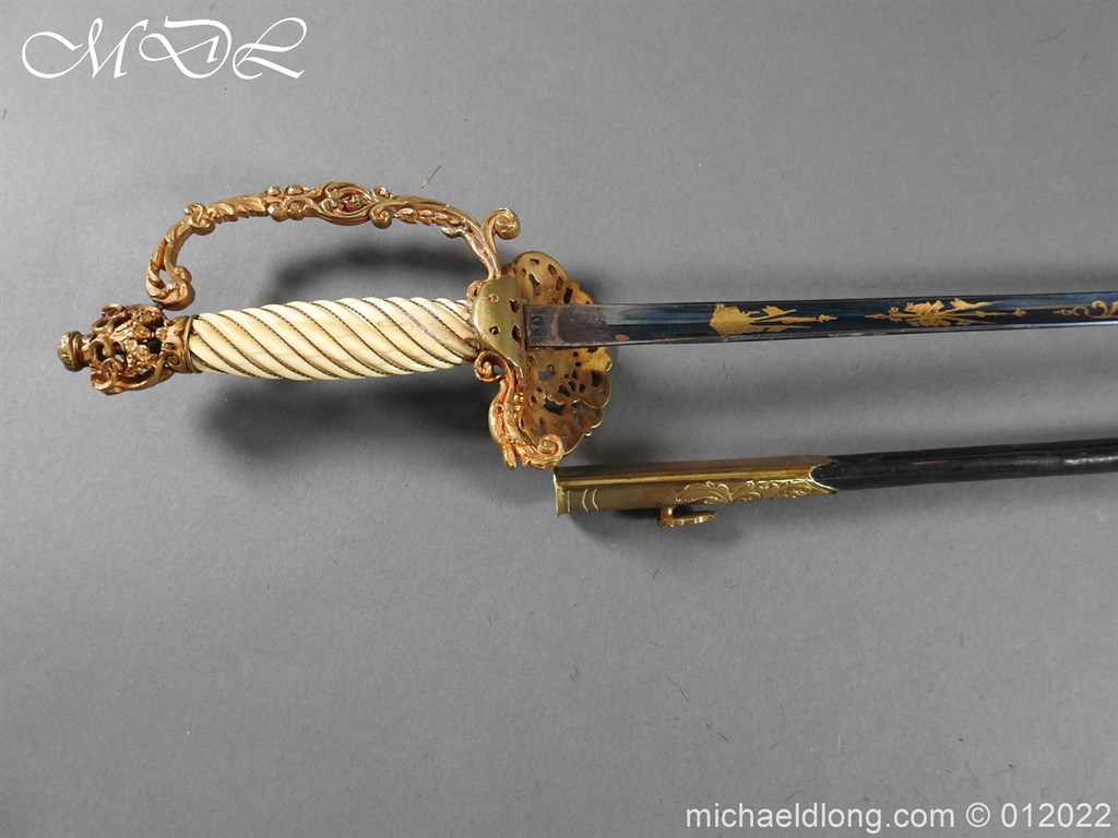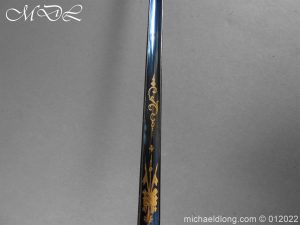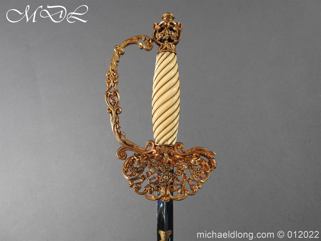 British Blue and Gilt Court Sword super condition gilt brass ornate D guard with pierced shell guard and matching urn shaped pommel with curved bone grip bound with gilt wire. The blade trefoil with excellent blue and gilt decoration including scrolls and stands of arms complete with black leather scabbard with matching decorative gilt mounts