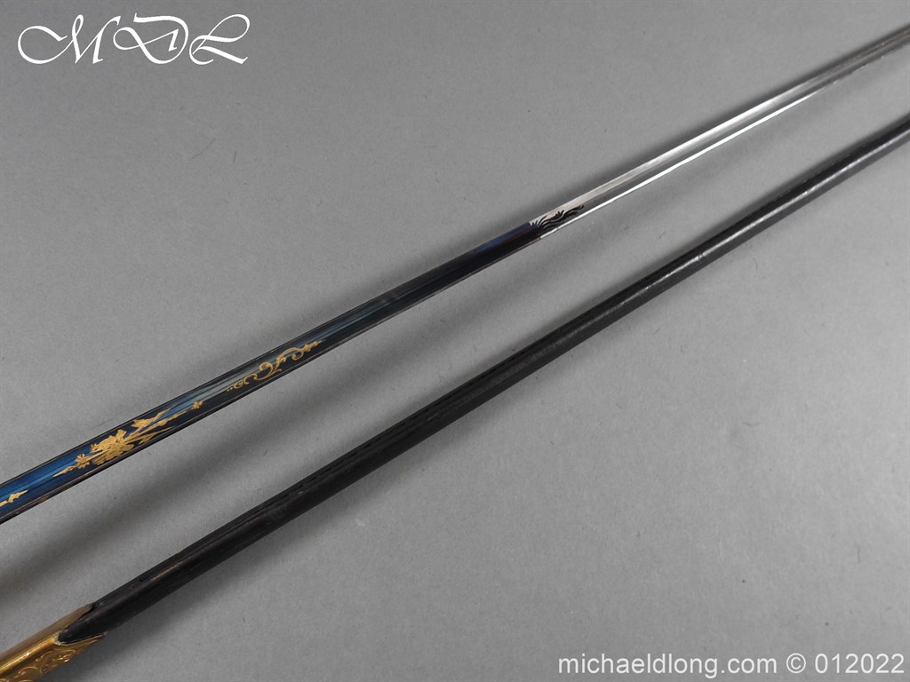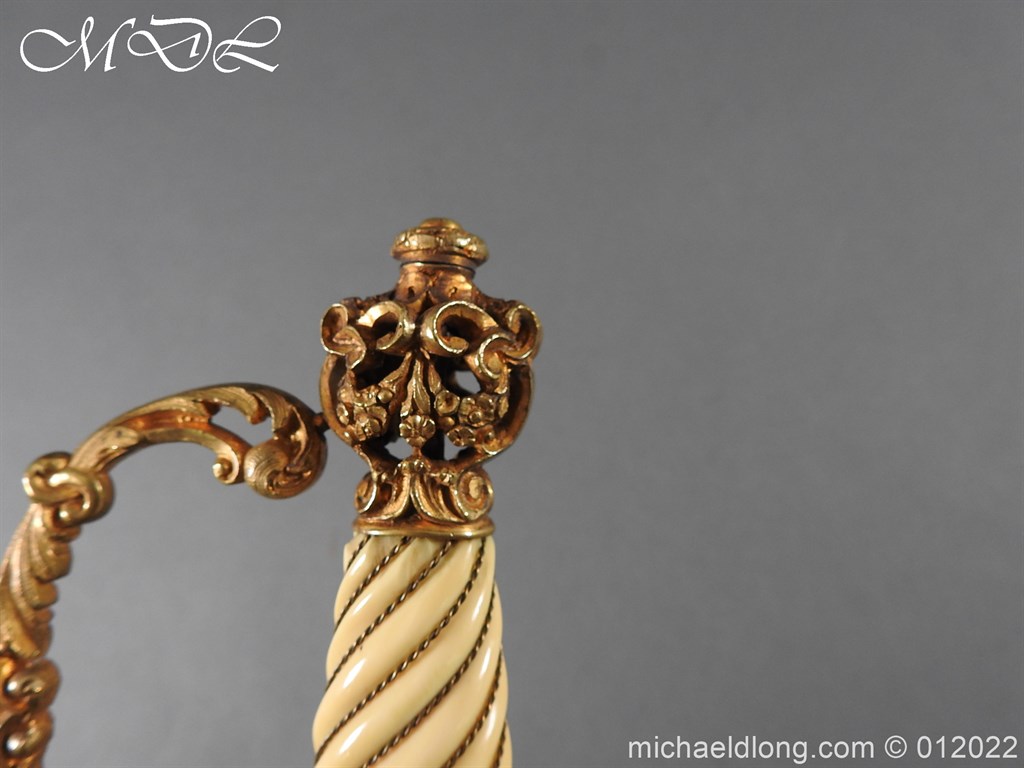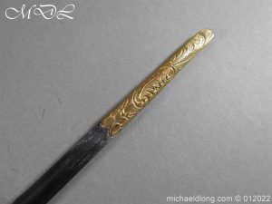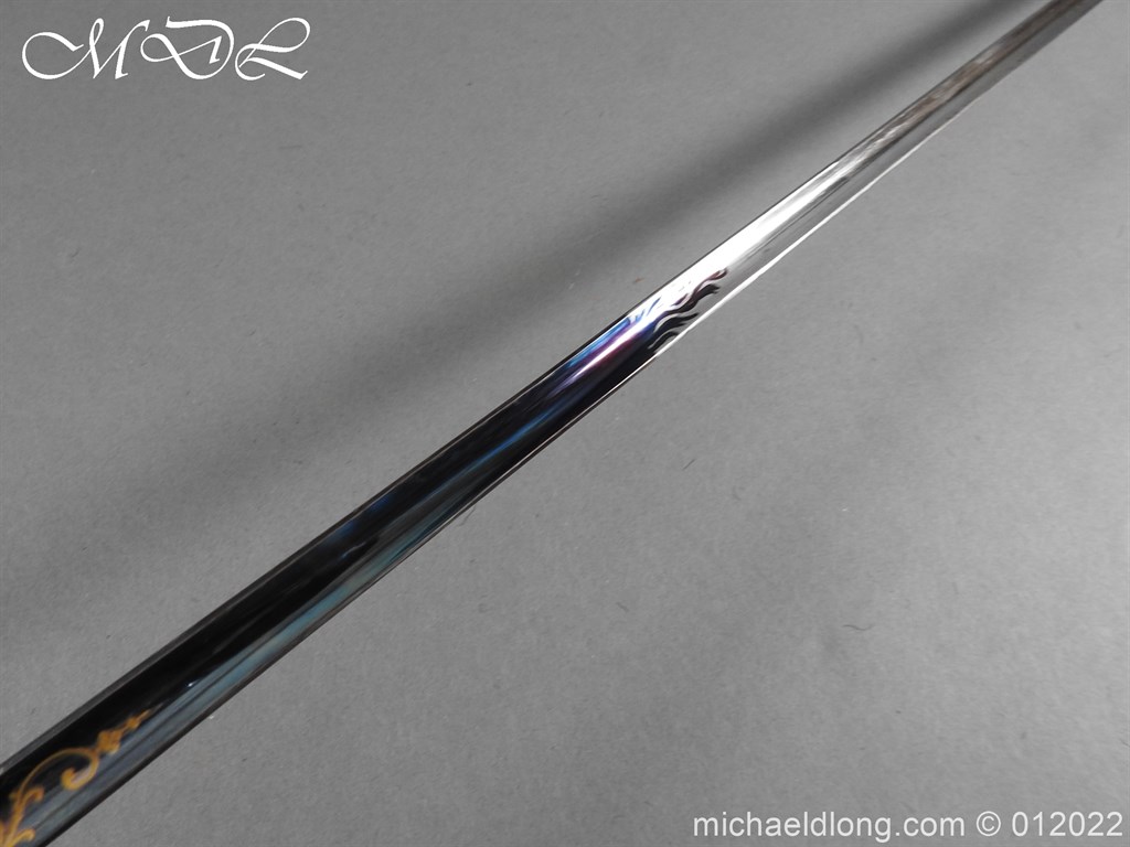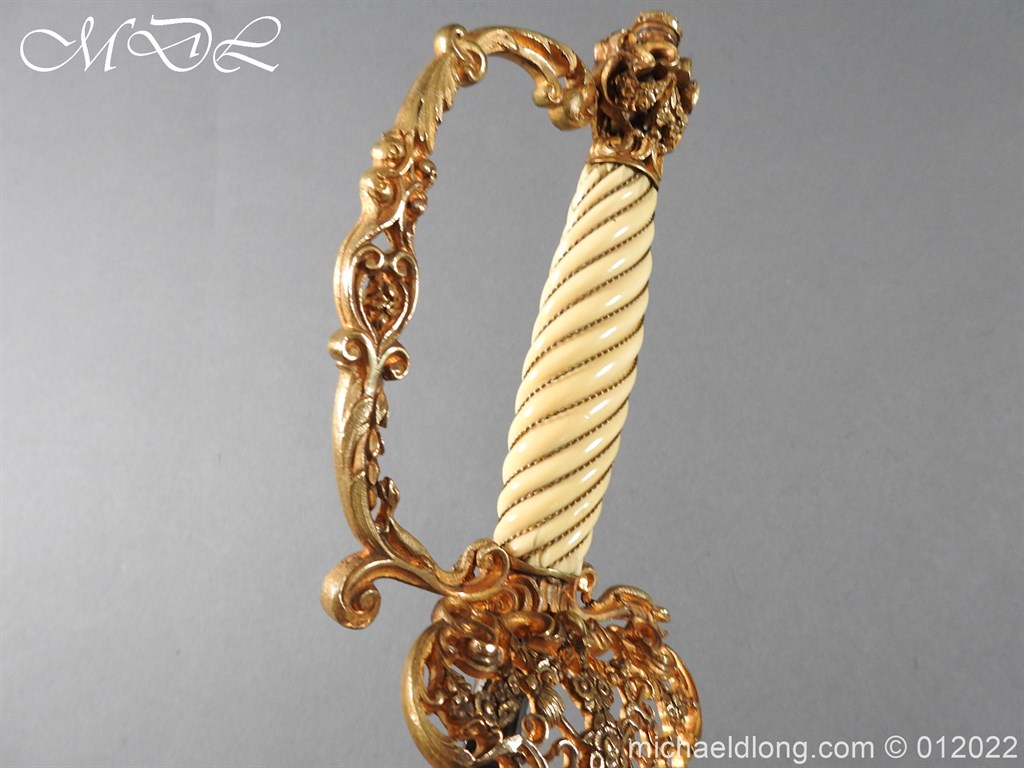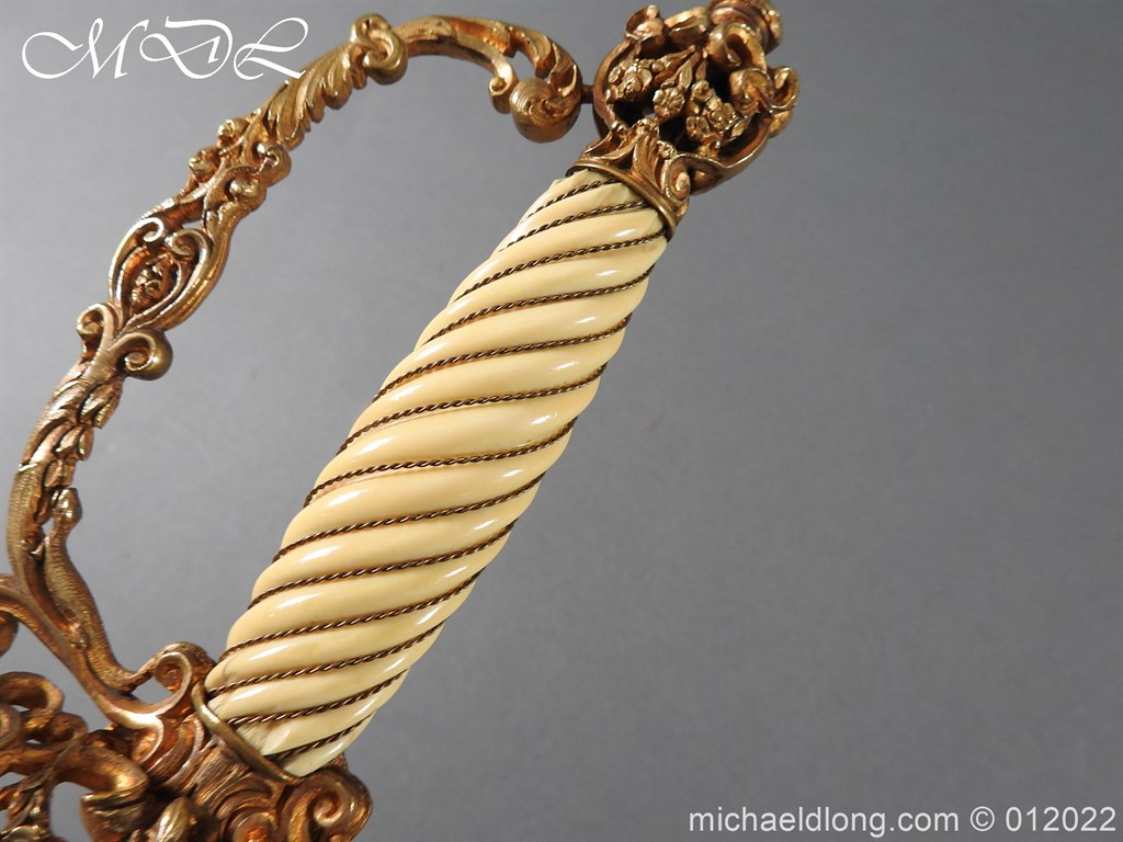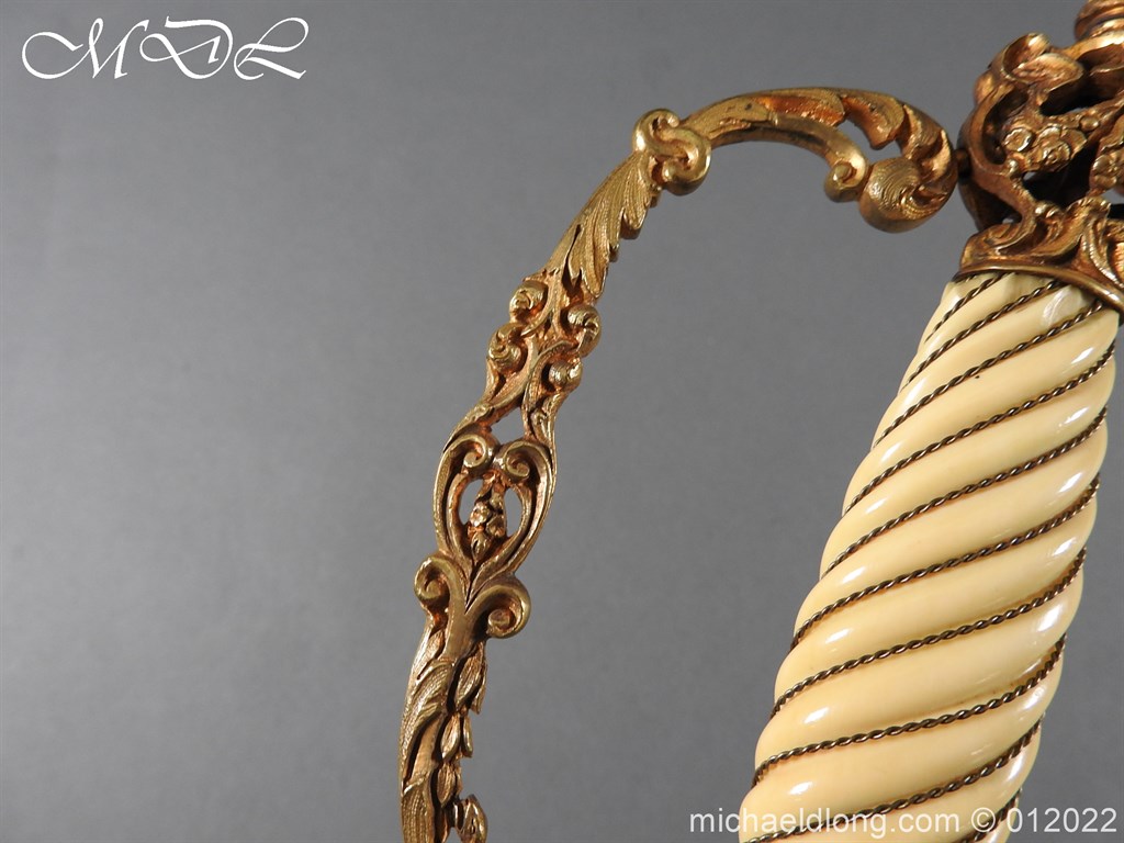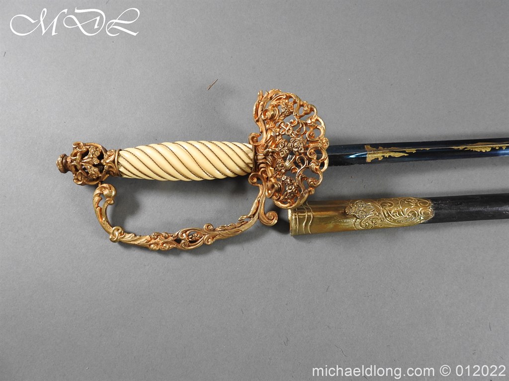 British Blue and Gilt Court Sword super condition gilt brass ornate D guard with pierced shell guard and matching urn shaped pommel with curved bone grip bound with gilt wire. The blade trefoil with excellent blue and gilt decoration including scrolls and stands of arms complete with black leather scabbard with matching decorative gilt mounts