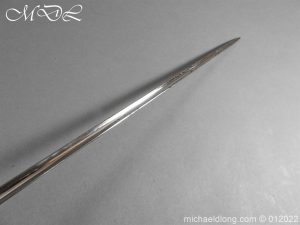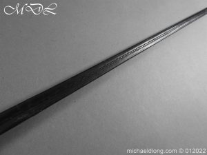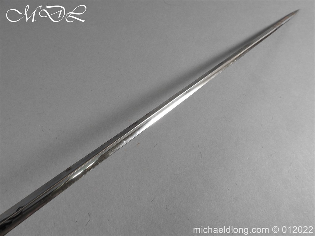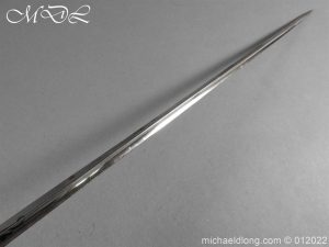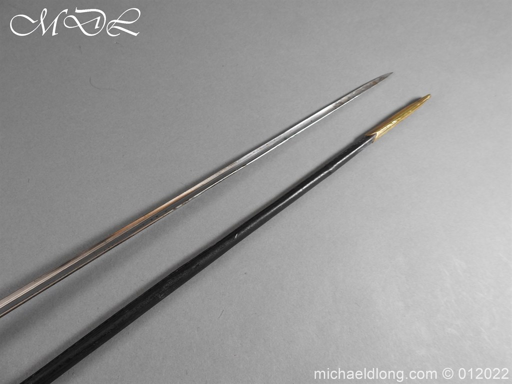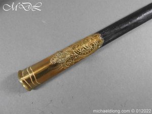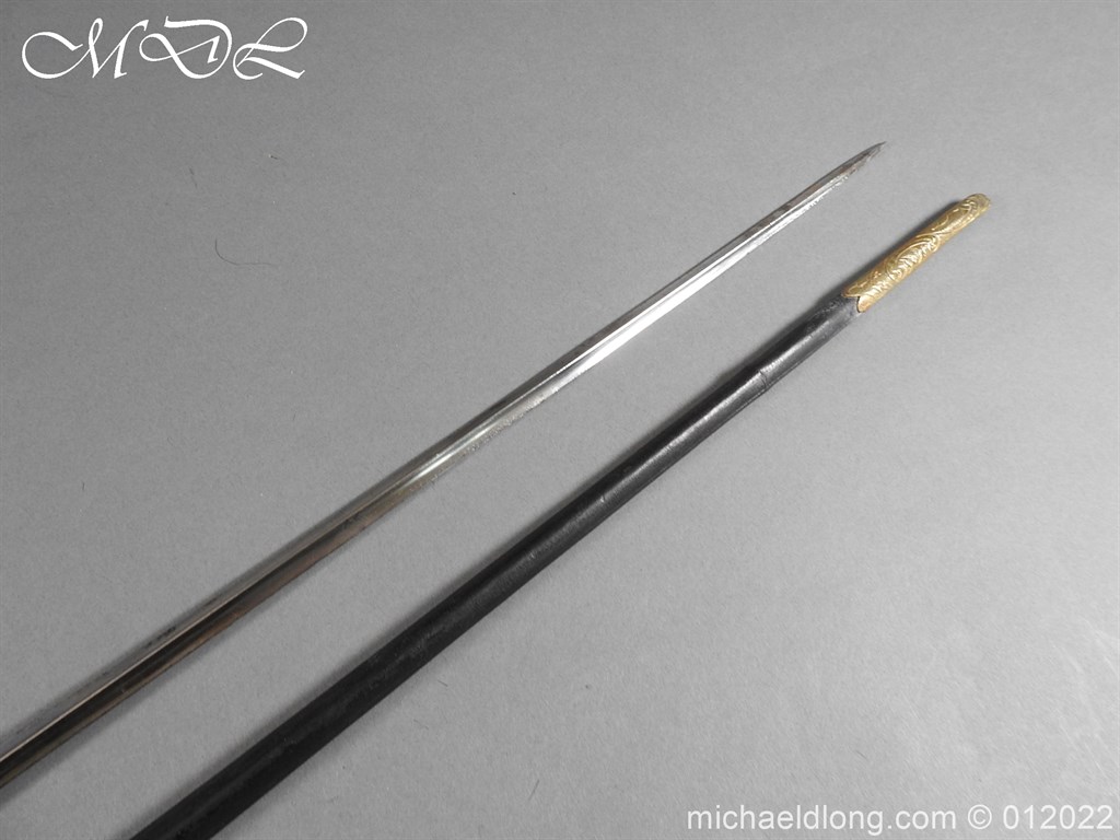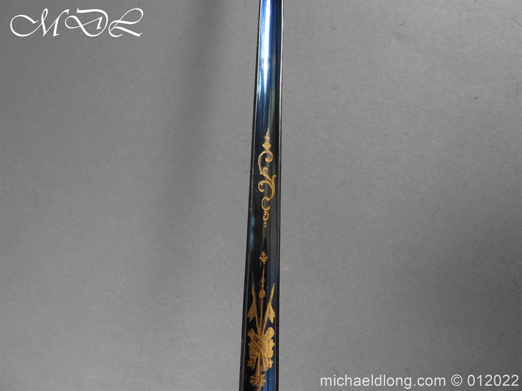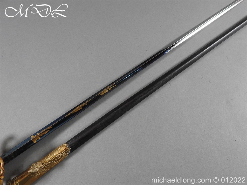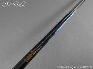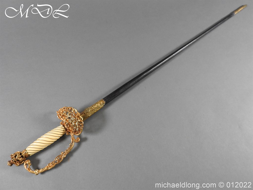 British Blue and Gilt Court Sword super condition gilt brass ornate D guard with pierced shell guard and matching urn shaped pommel with curved bone grip bound with gilt wire. The blade trefoil with excellent blue and gilt decoration including scrolls and stands of arms complete with black leather scabbard with matching decorative gilt mounts