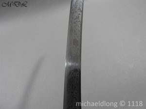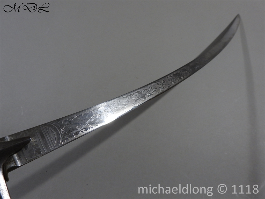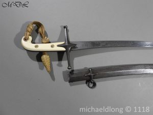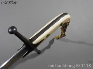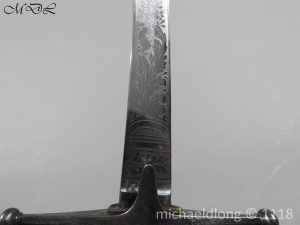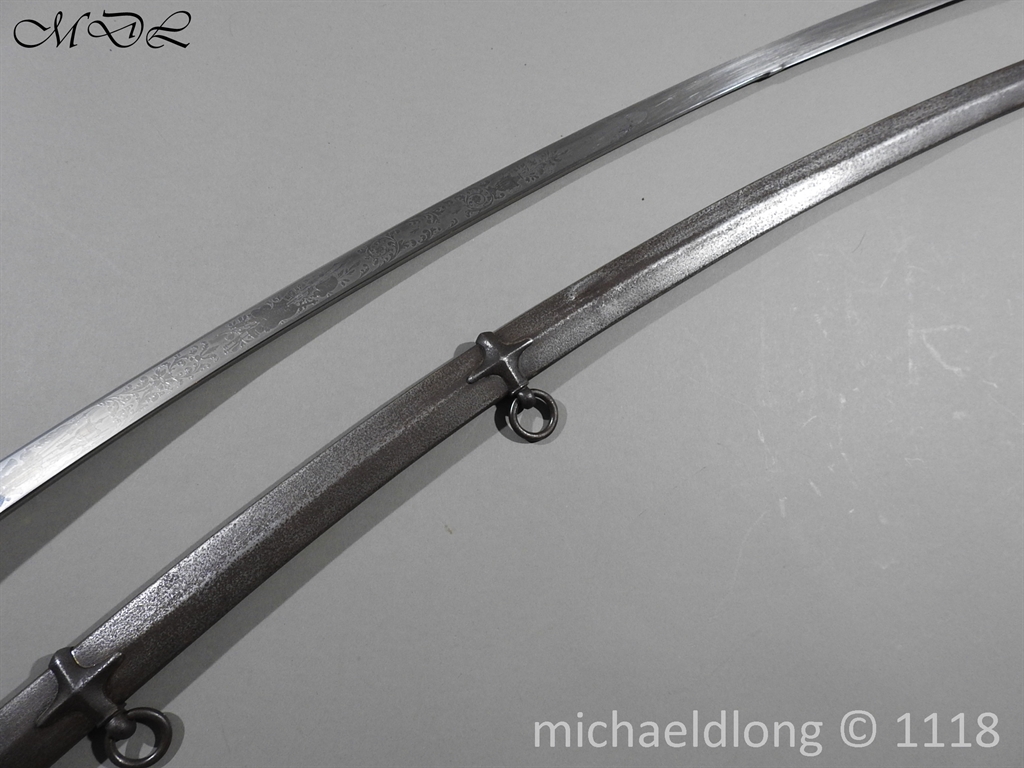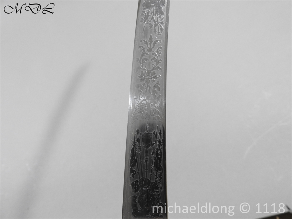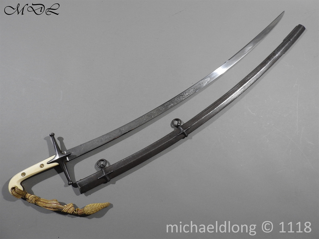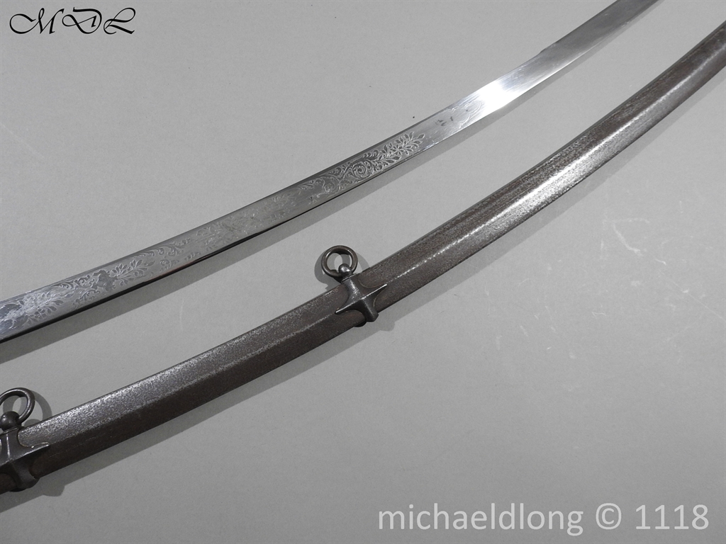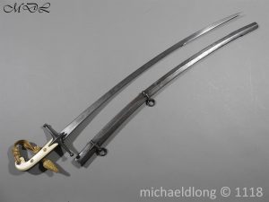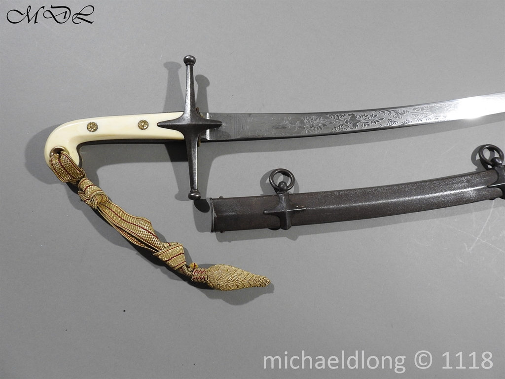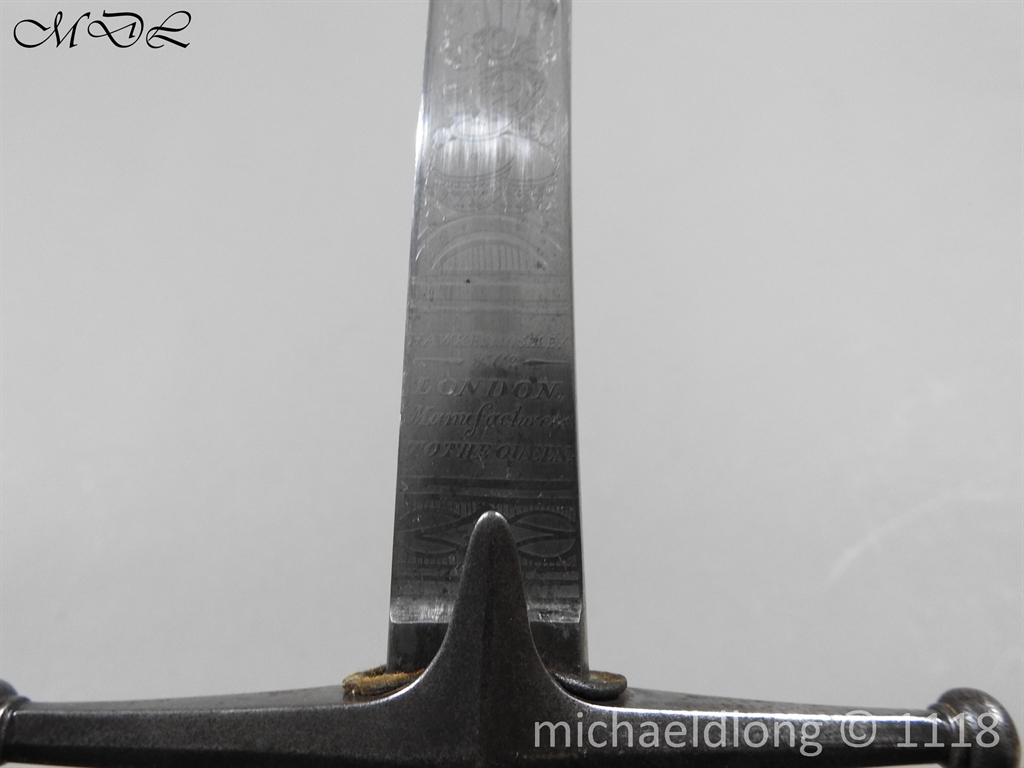 All steel mounts and scabbard with bone slab sided hilt. A near mint blade with classical helmets and trophies of arms, makers mark Hawkes Mosley and Co London Manufactures to the queen and produced between 1837 and 1852 Crimean War period.
