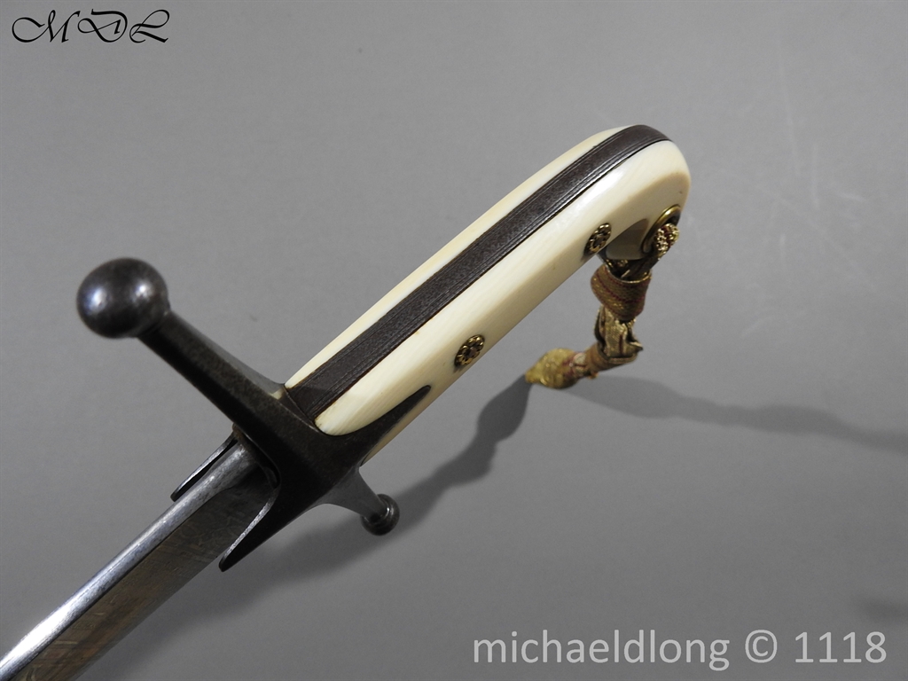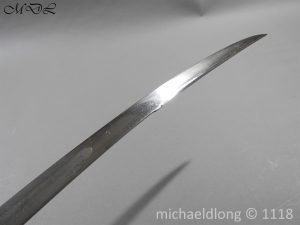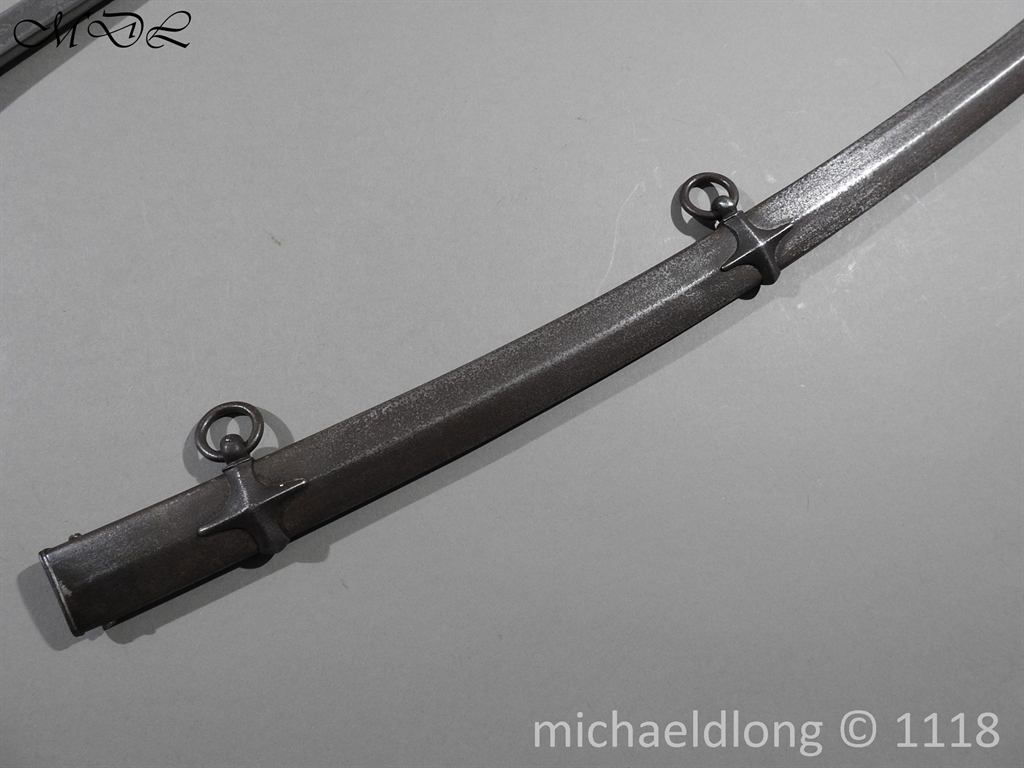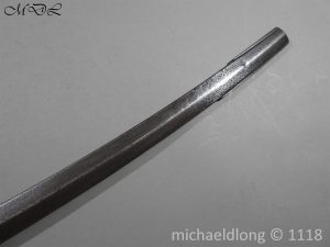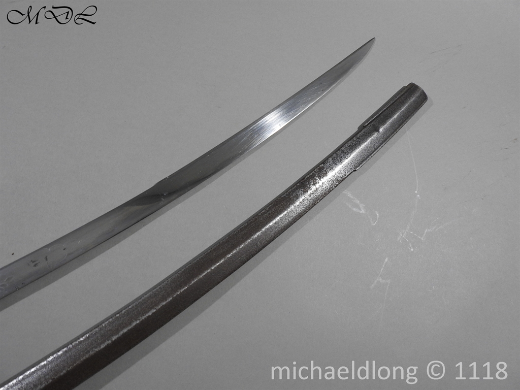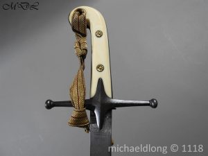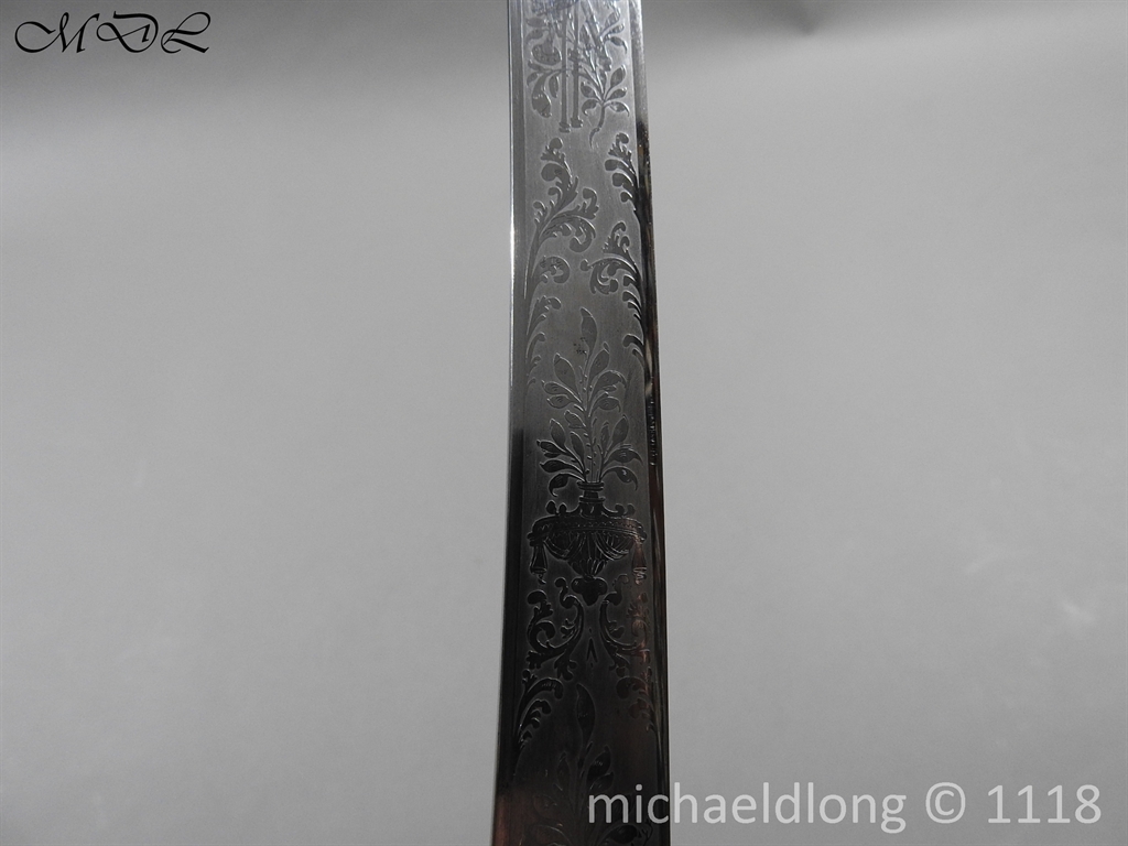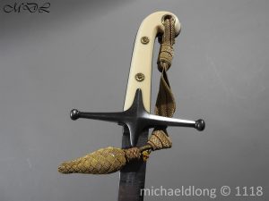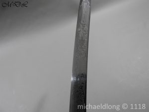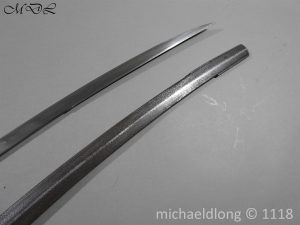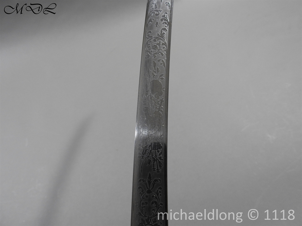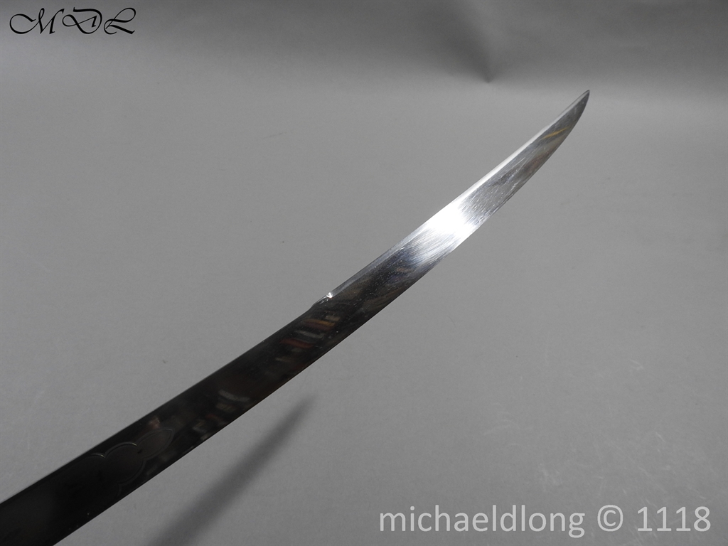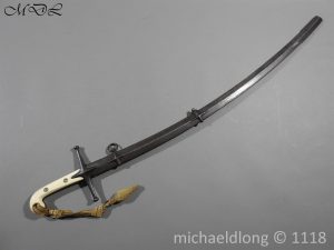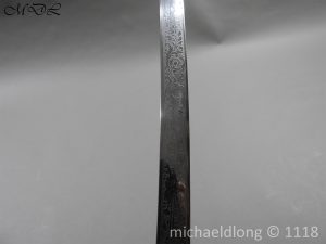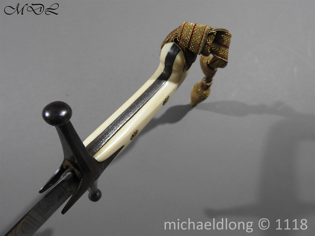 All steel mounts and scabbard with bone slab sided hilt. A near mint blade with classical helmets and trophies of arms, makers mark Hawkes Mosley and Co London Manufactures to the queen and produced between 1837 and 1852 Crimean War period.