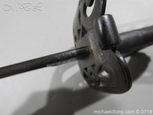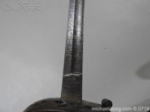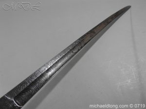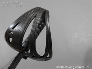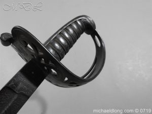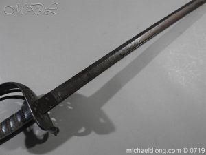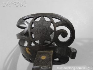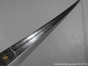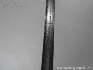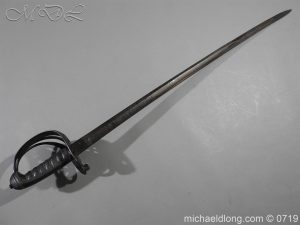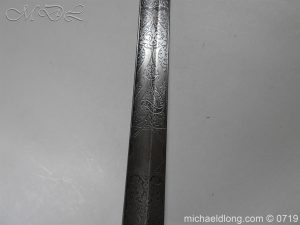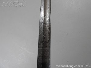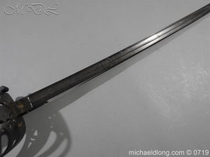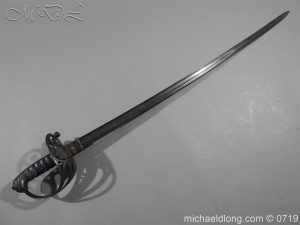Very early example numbered 6243 c 1855 regulation hilt with regimental badge to centre and wire bound fish skin grip. The slightly curved blade with VR crown and battle honours to both sided the revere with regimental badge and maker marked Henry Wilkinson The whole sword has darkened with age but no damage