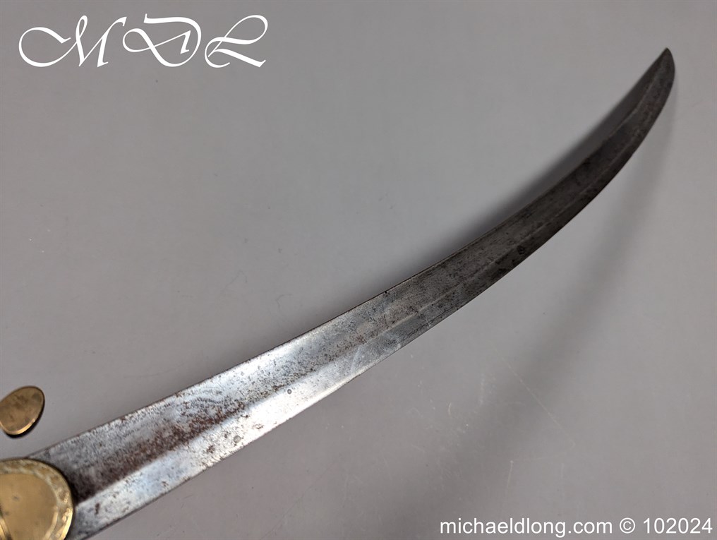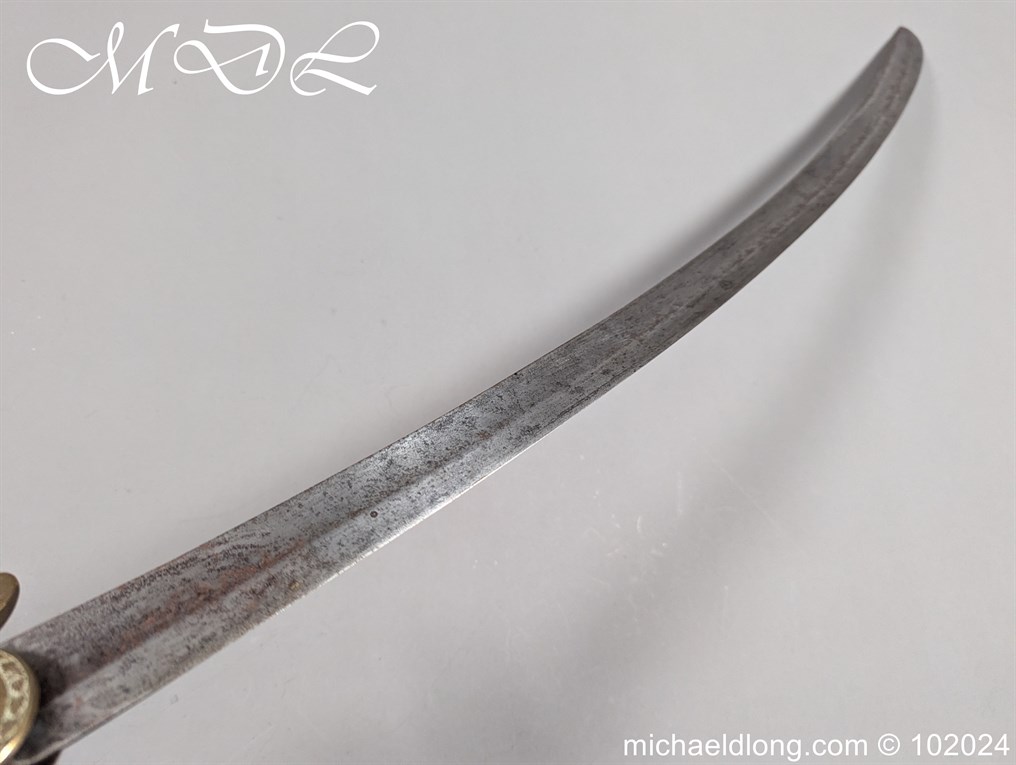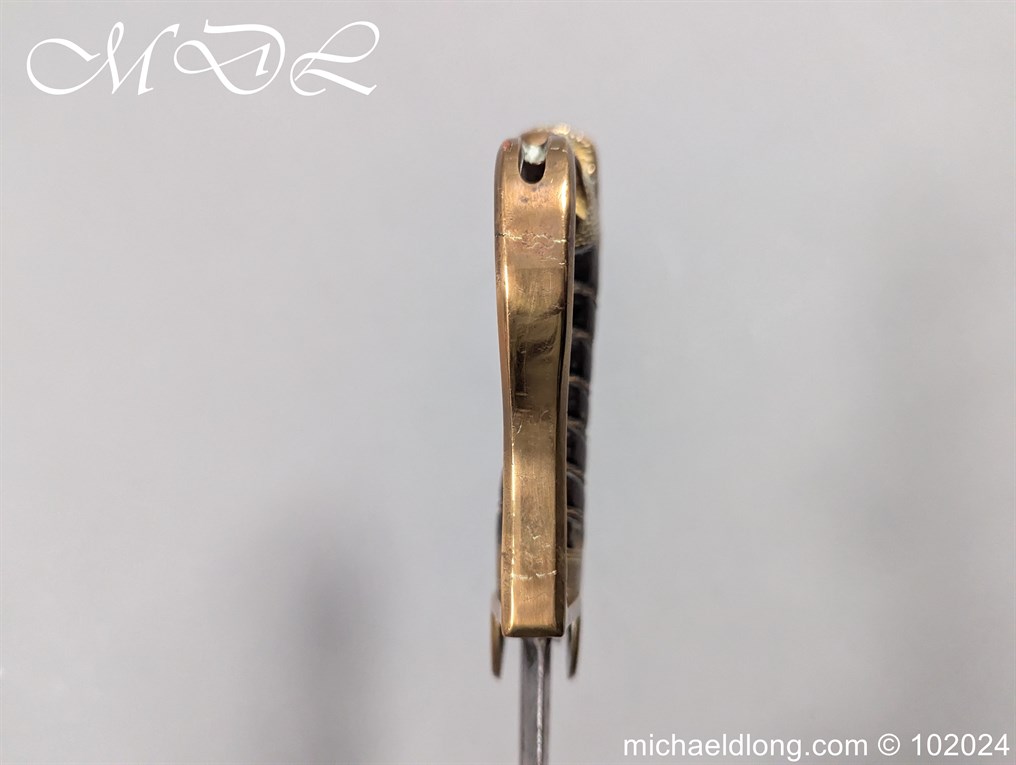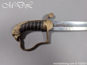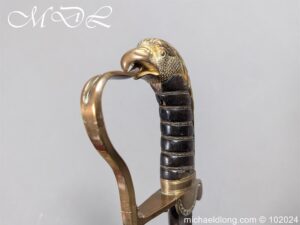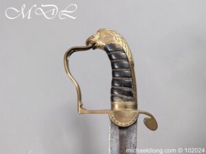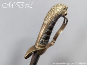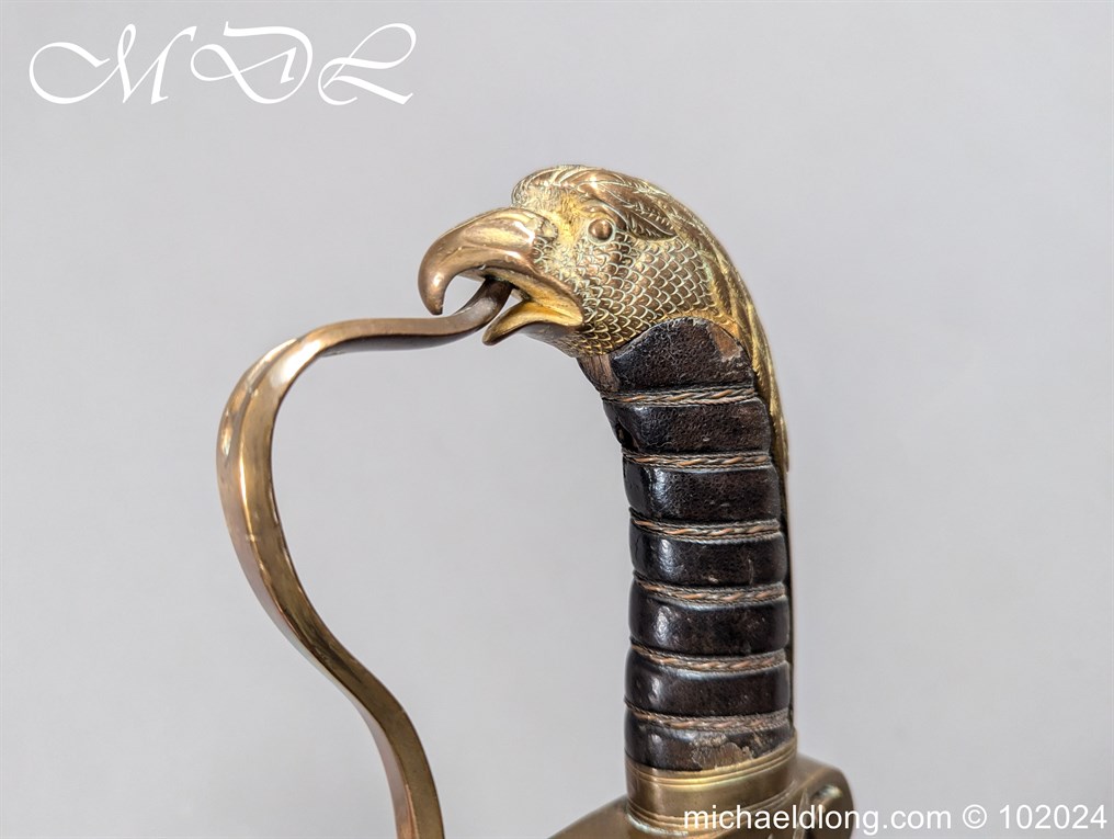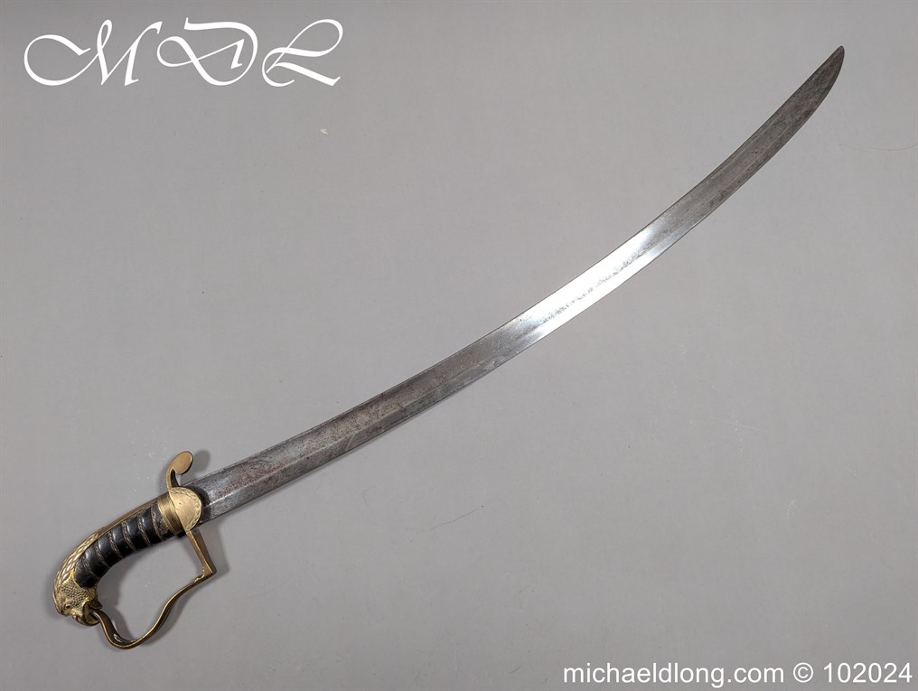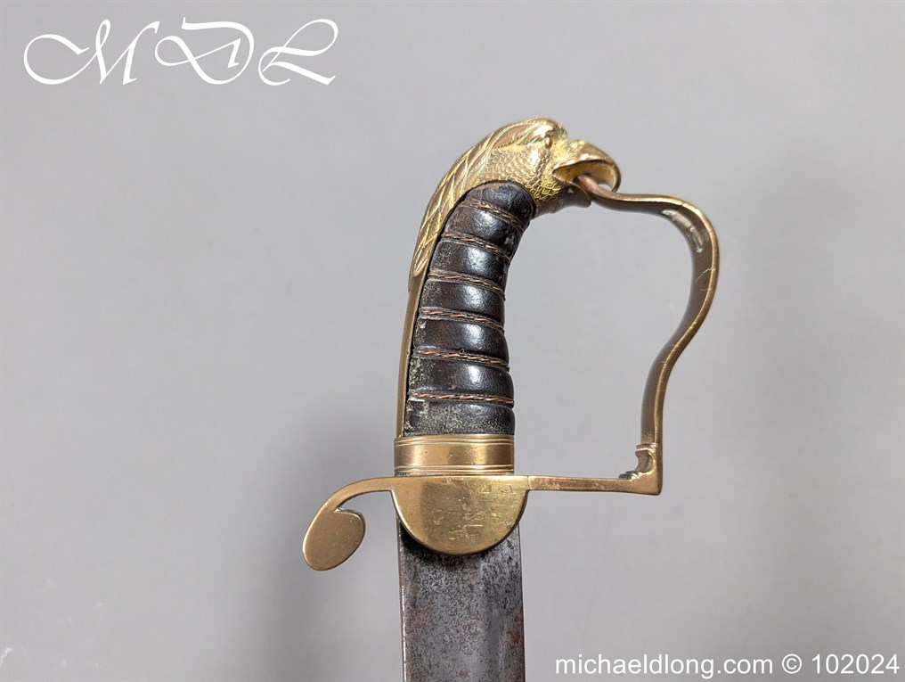 British Eagle Headed 18th Century Cavalry Sword with gilt brass stirrup hilt with excellent eagle head pommel and leather grip secured by twisted wire. The blade curved and similar to a officers regulation 1796 Light Cavalry sword. Overall length 86cm the blade 75cm