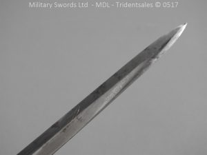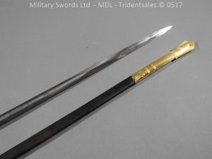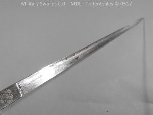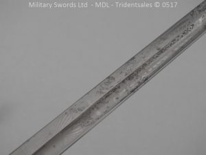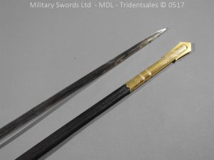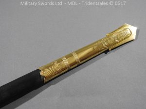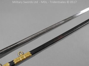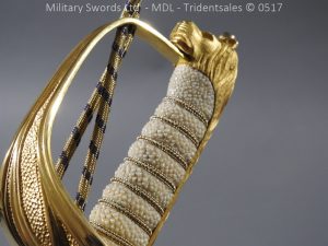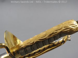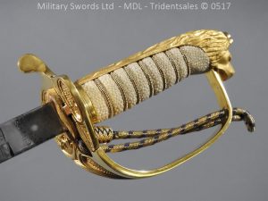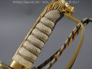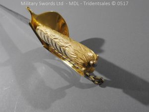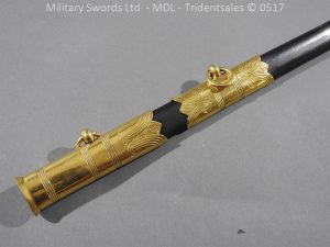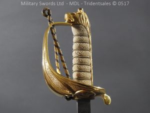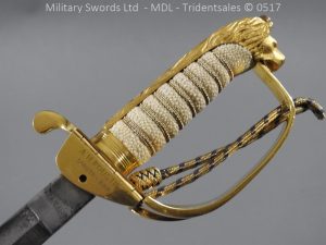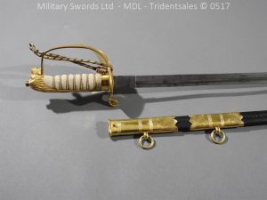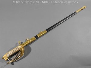Excellent example ER2 current issue in excellent condition with a gilt brass hilt with a lion head pommel, a solid half basket guard with a crowned fouled anchor, the grip is covered with fish skin, the blade is 31.5 inches in length and is well etched with a crowned anchor and within scrolls the reverse with royal coat of arms, complete with its brass mounted leather scabbard and a gold bullion sword knot, marked Gieves and fold down guard named A H Poustie