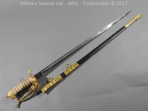 Excellent example ER2 current issue in excellent condition with a gilt brass hilt with a lion head pommel, a solid half basket guard with a crowned fouled anchor, the grip is covered with fish skin, the blade is 31.5 inches in length and is well etched with a crowned anchor and within scrolls the reverse with royal coat of arms, complete with its brass mounted leather scabbard and a gold bullion sword knot, marked Gieves and fold down guard named A H Poustie