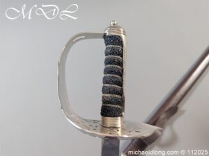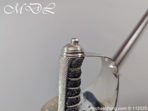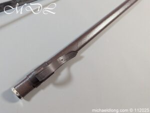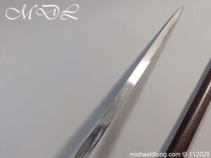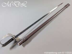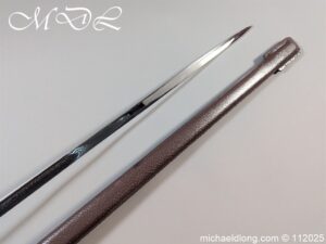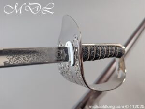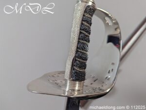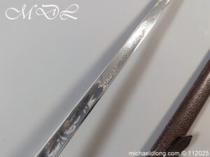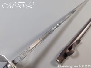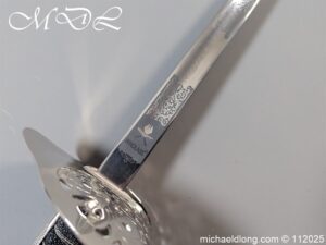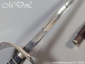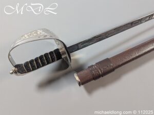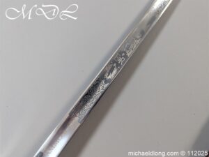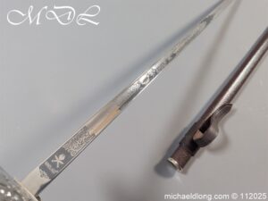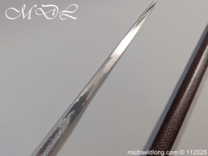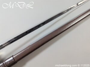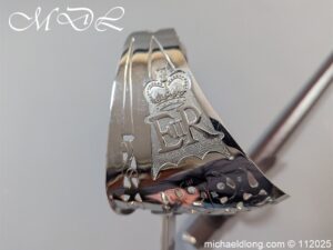 British ER 2 Royal Maines Officers Sword by Ammo and Co in new condition. Regulation sword, steel plated hilt with fish skin grip and chequered back strap all in unused condition. The straight blade etched with ER and crown with Royal Marines and regimental badge to reverse surrounded by floral decoration plus Ammo and Co. Complete with field service scabbard again in new condition.