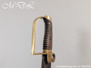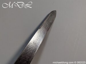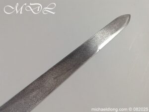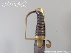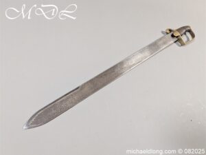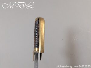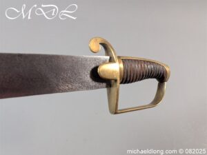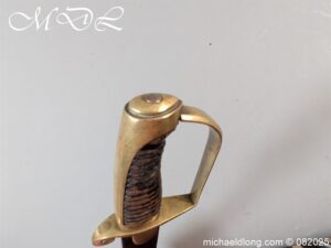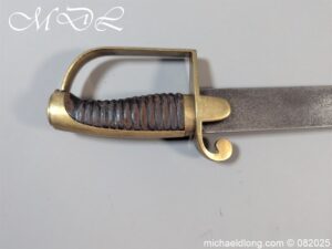 British Foot Artillery Sword c 1820 straight blade unfullered flat back with spear point. The guard brass straight knucklebow with brass shield shaped langets, curled quillon and leather-bound leather grip. Only marking is on the hilt which is a stylised S over stamped with a T or F overall length 24.75 inch over all 29.5 inch for reference please see Swords of the British Army Revised Edition page 233