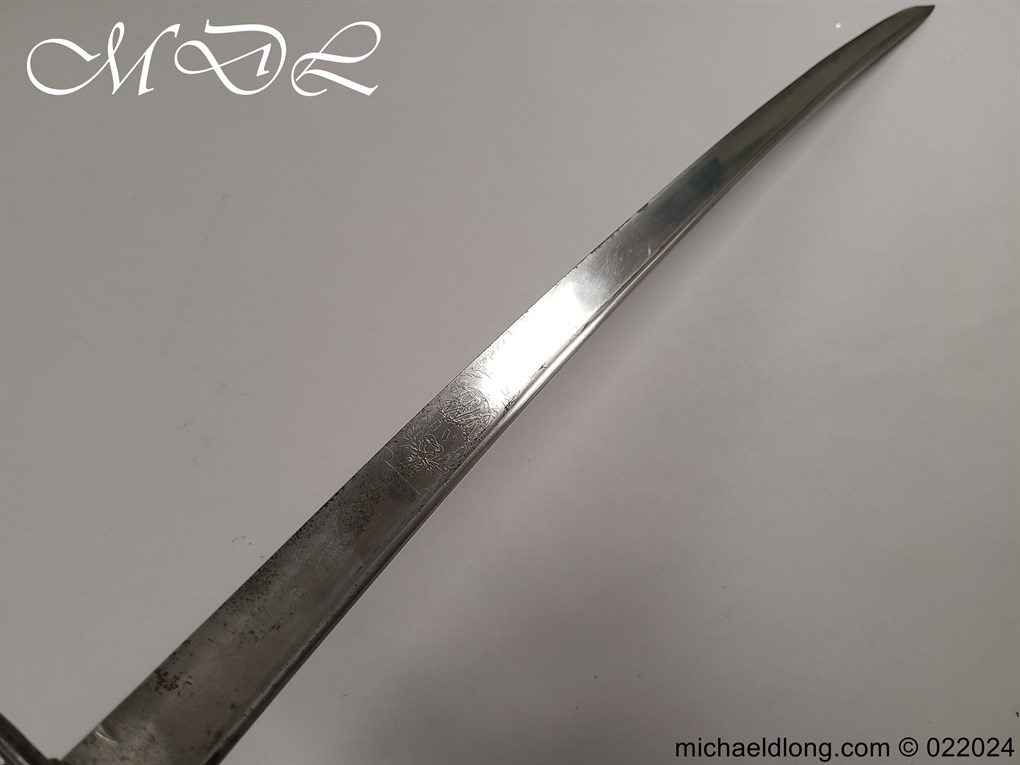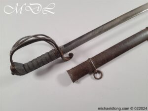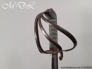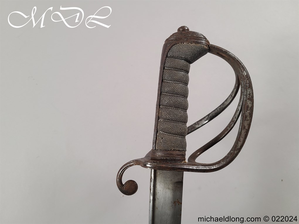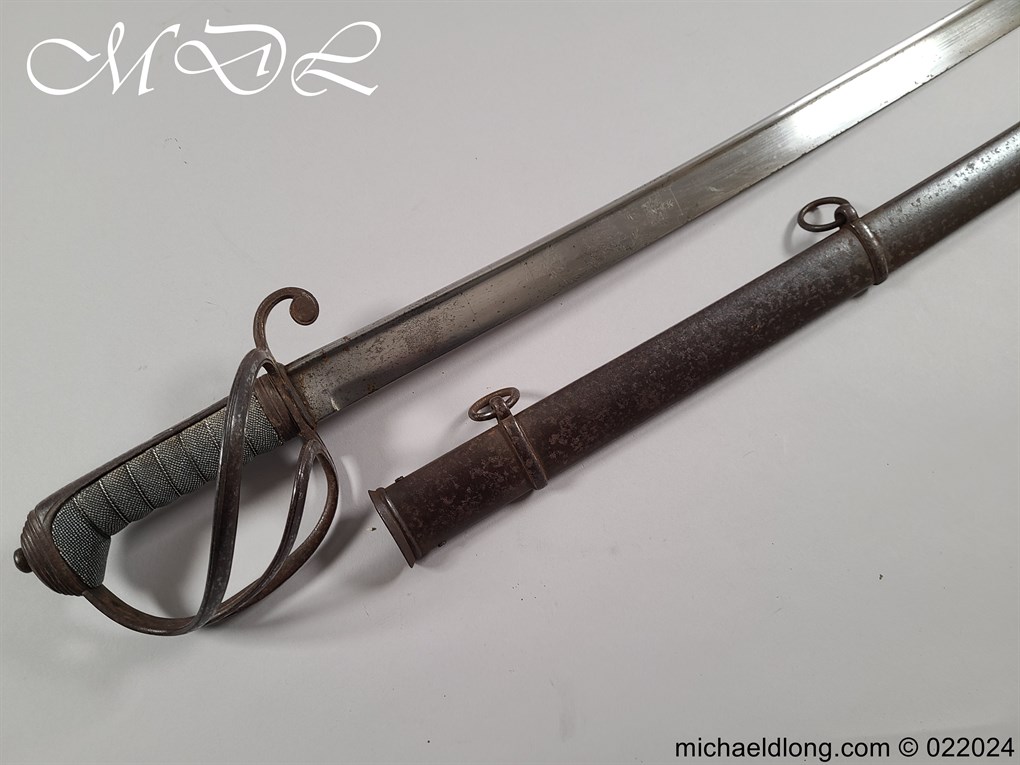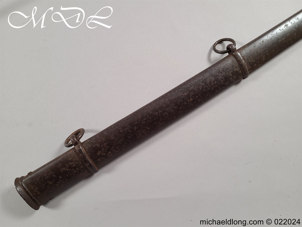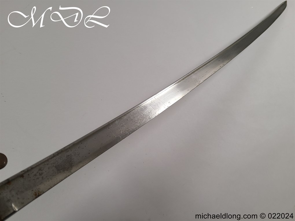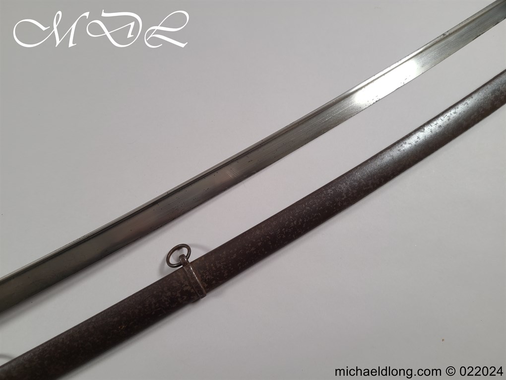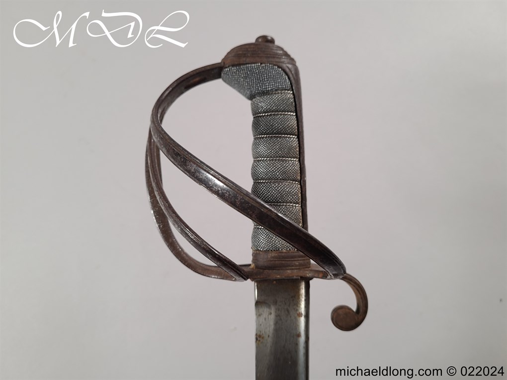 British George 4th 1821 Light Cavalry Officers Sword, in nice untouched condition regulation 3 bar hilt with stepped pommel and fisk skin grip. Slightly curved pipe backed blade etched with Crown GR and IV on each side with in panels plus makers details MOORE, LATE BICKNELL & MOORE, 1 OLD BOND ST., LONDON note very faint, Complete with matching steel scabbard. Overall length 104cm the blade 90.5cm for reference please see Swords of the British Army Revised Plate 78