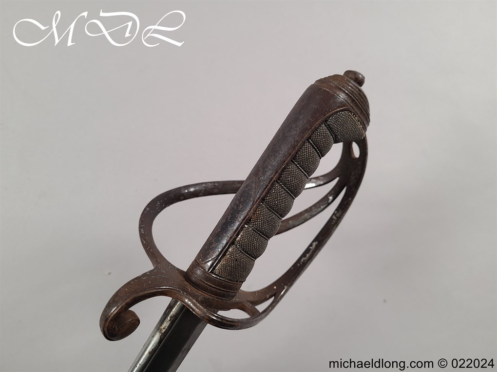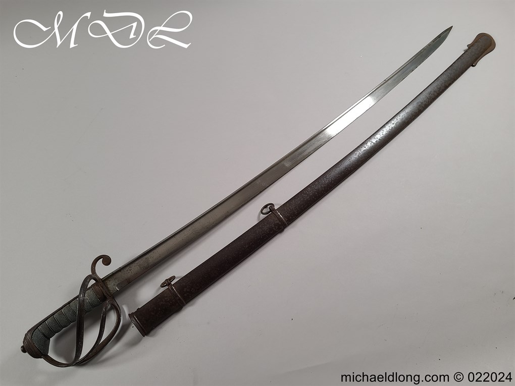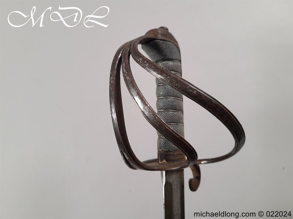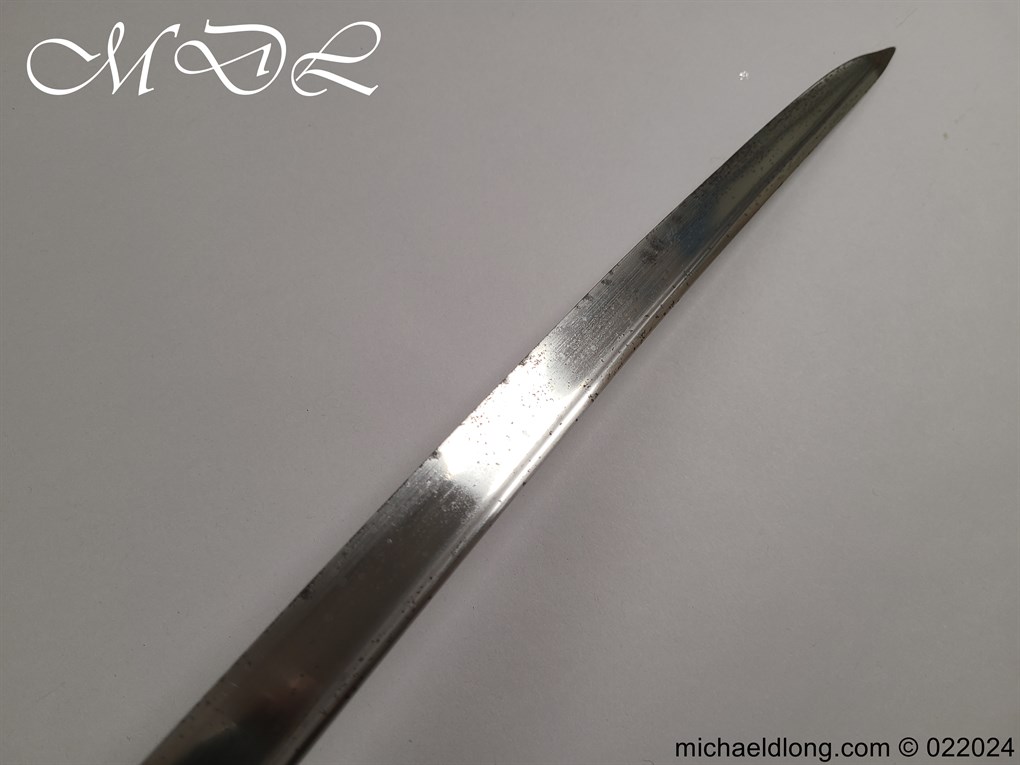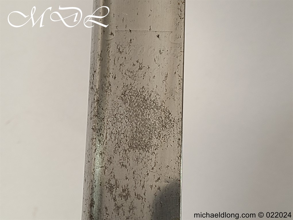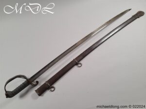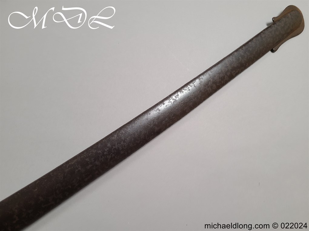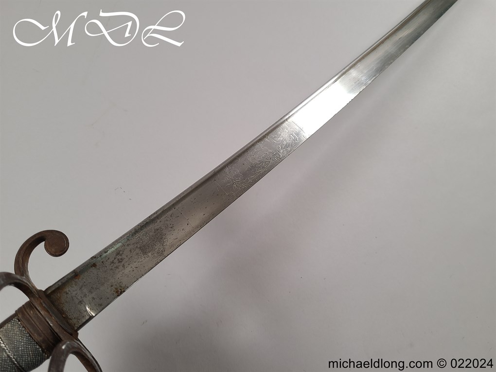British George 4th 1821 Light Cavalry Officers Sword, in nice untouched condition regulation 3 bar hilt with stepped pommel and fisk skin grip. Slightly curved pipe backed blade etched with Crown GR and IV on each side with in panels plus makers details MOORE, LATE BICKNELL & MOORE, 1 OLD BOND ST., LONDON note very faint, Complete with matching steel scabbard. Overall length 104cm the blade 90.5cm for reference please see Swords of the British Army Revised Plate 78