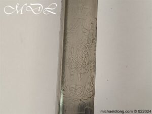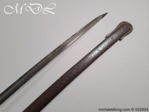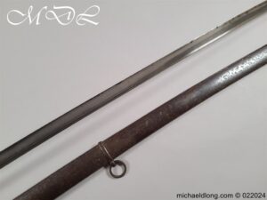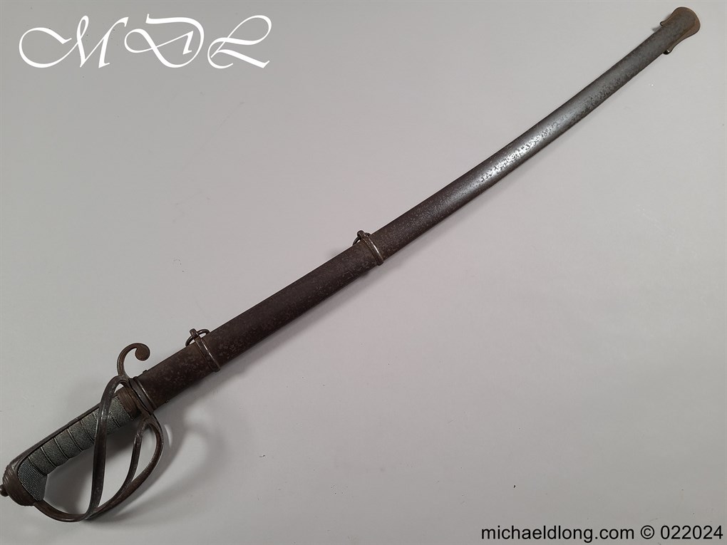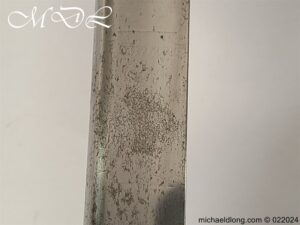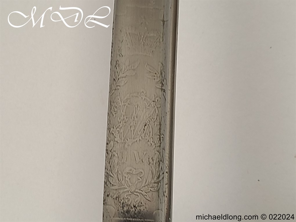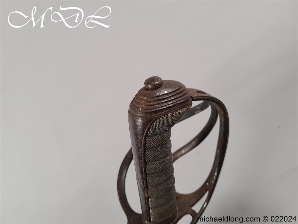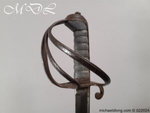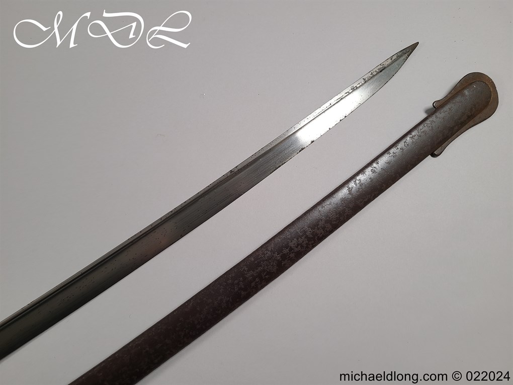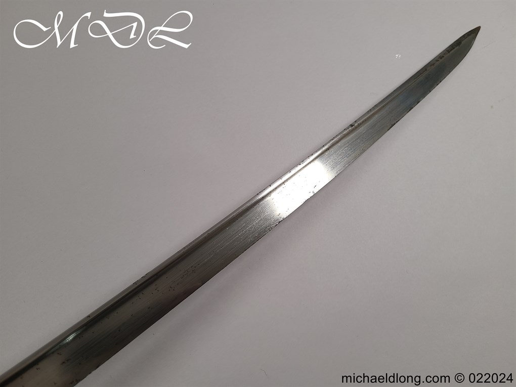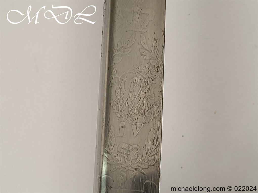 British George 4th 1821 Light Cavalry Officers Sword, in nice untouched condition regulation 3 bar hilt with stepped pommel and fisk skin grip. Slightly curved pipe backed blade etched with Crown GR and IV on each side with in panels plus makers details MOORE, LATE BICKNELL & MOORE, 1 OLD BOND ST., LONDON note very faint, Complete with matching steel scabbard. Overall length 104cm the blade 90.5cm for reference please see Swords of the British Army Revised Plate 78