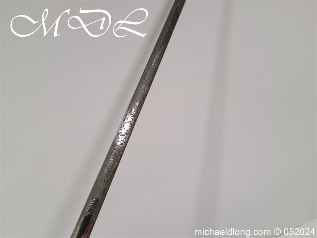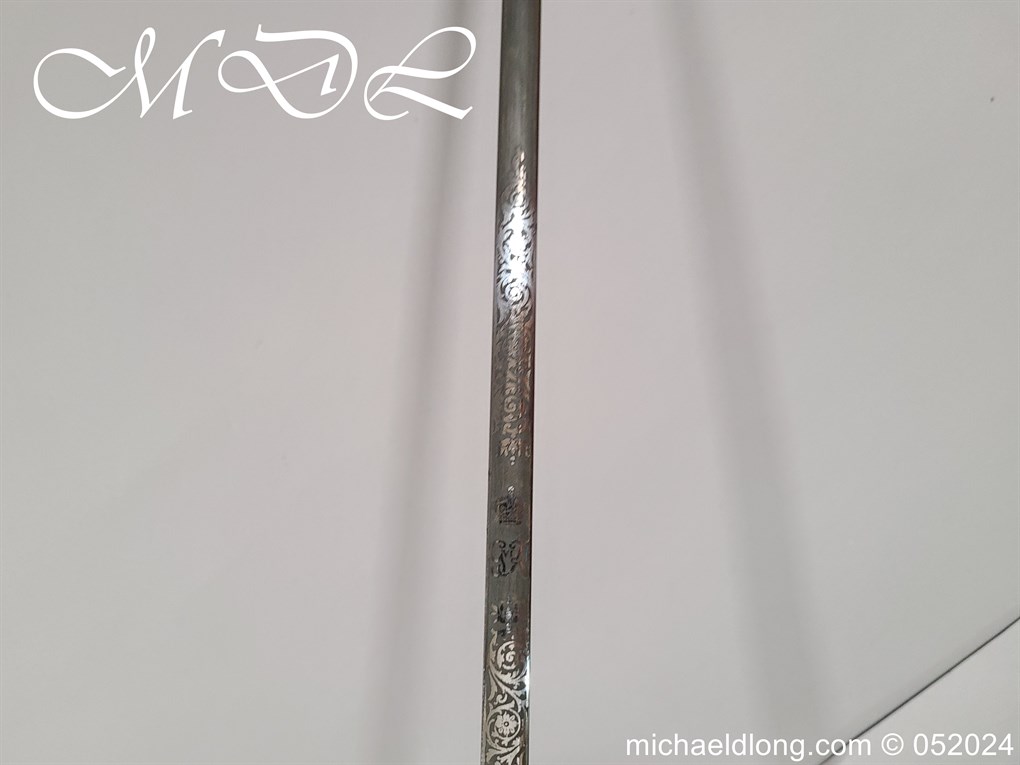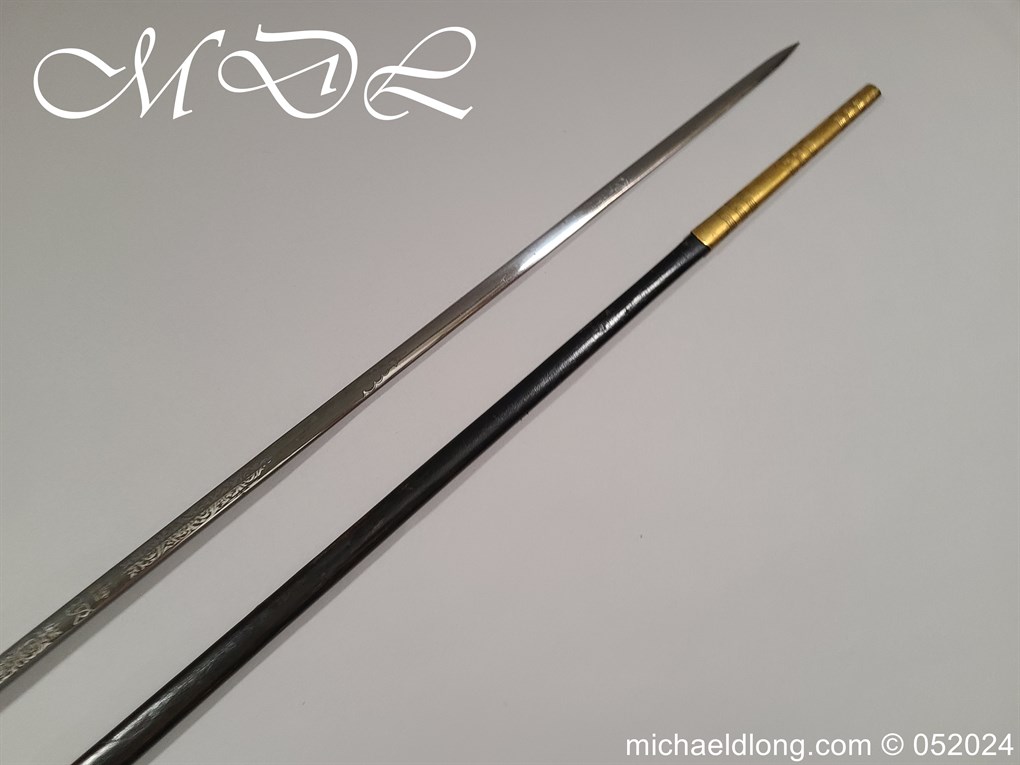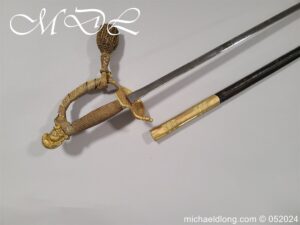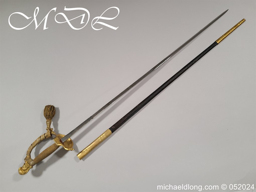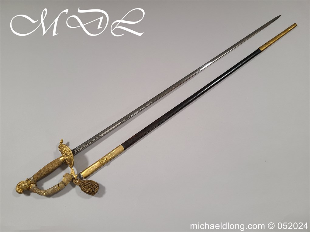 British George 5th Officers Court Sword by Wilkinson Sword in super condition, bought directly from a London regiment, classic form of hilt with full dress knot. The blade in super condition etching bright and clear with GR V and crown to both sided surrounded by floral decoration and maker marked Wilkinson Sword London. It is complete with black leather scabbard with matching gilt mounts.