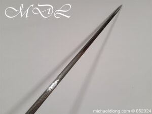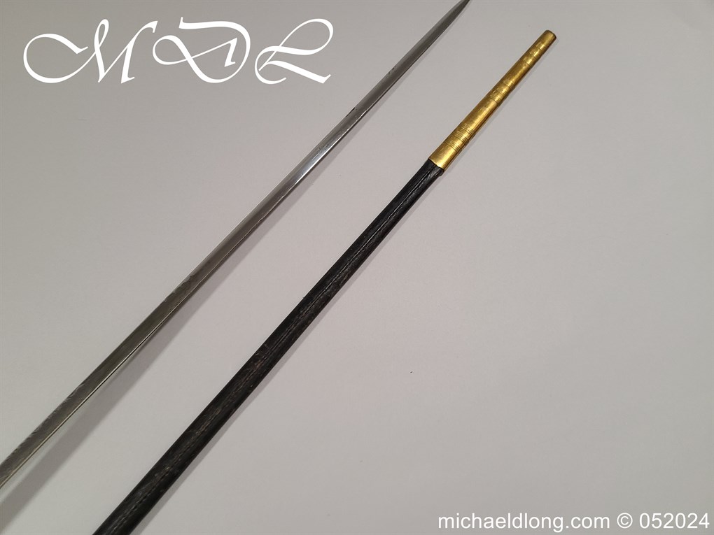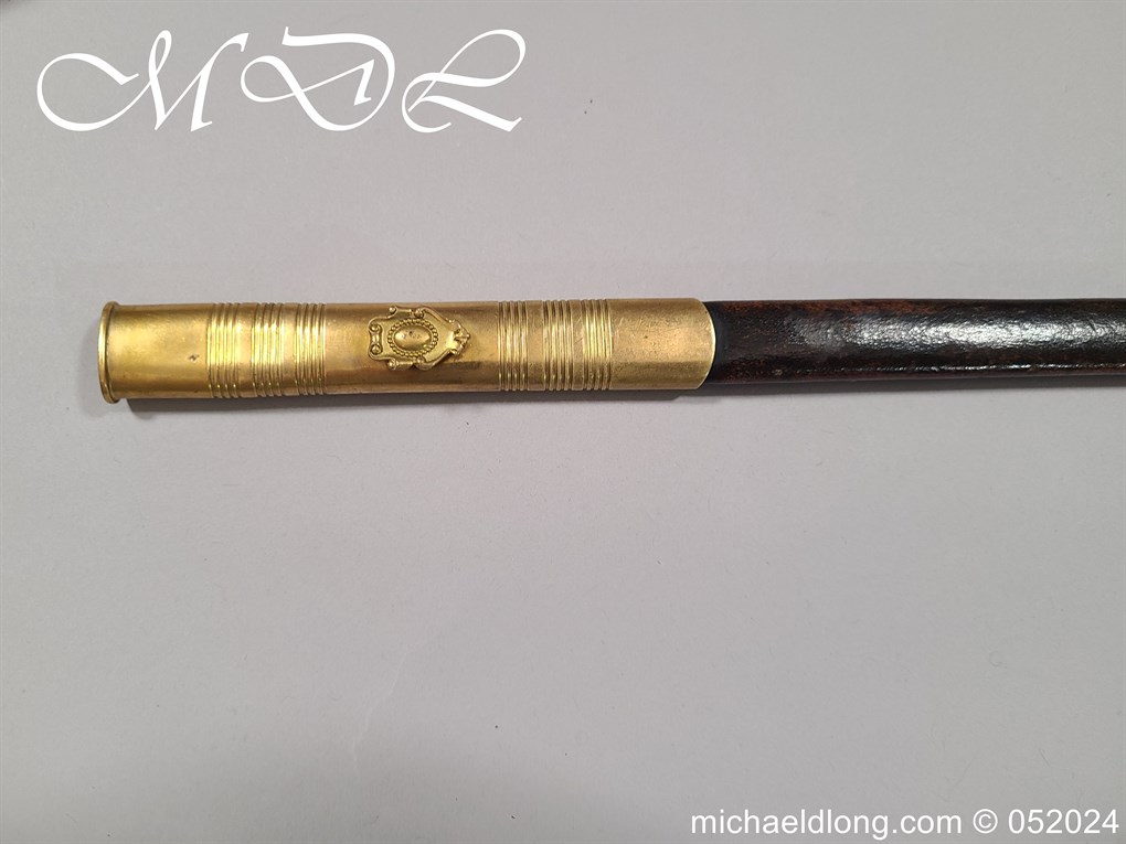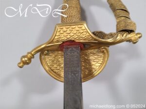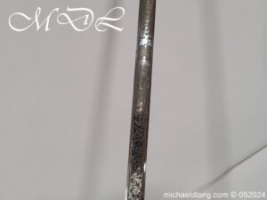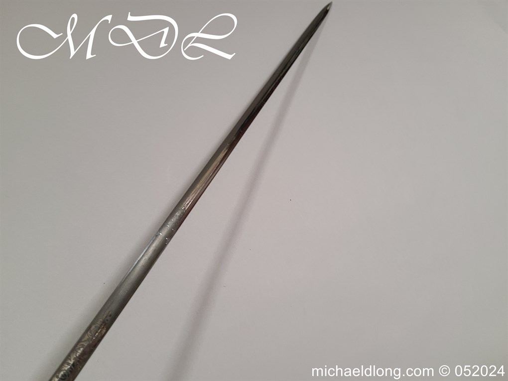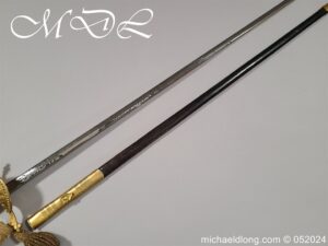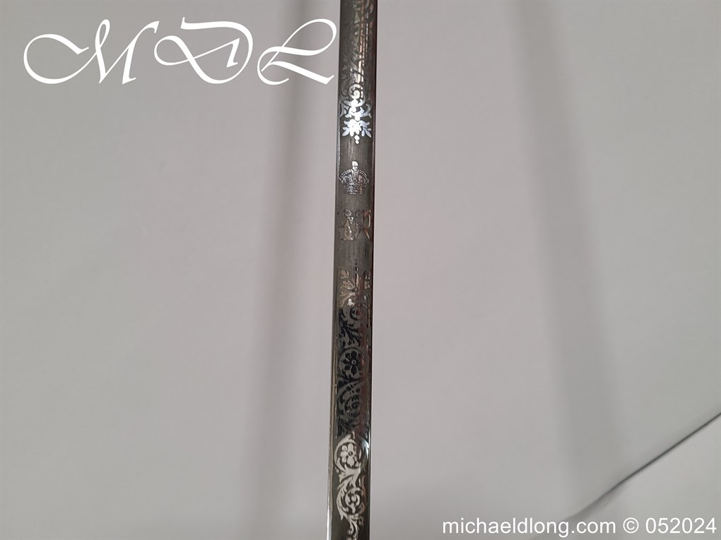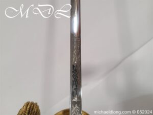 British George 5th Officers Court Sword by Wilkinson Sword in super condition, bought directly from a London regiment, classic form of hilt with full dress knot. The blade in super condition etching bright and clear with GR V and crown to both sided surrounded by floral decoration and maker marked Wilkinson Sword London. It is complete with black leather scabbard with matching gilt mounts.