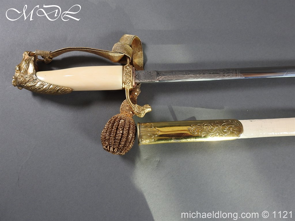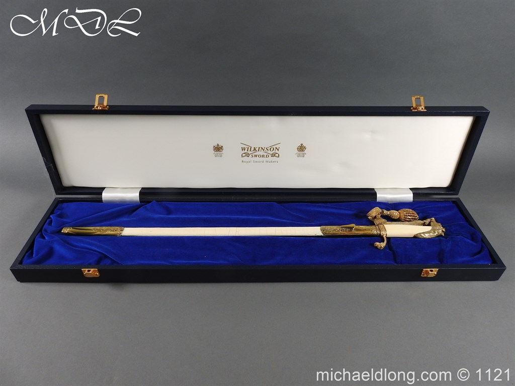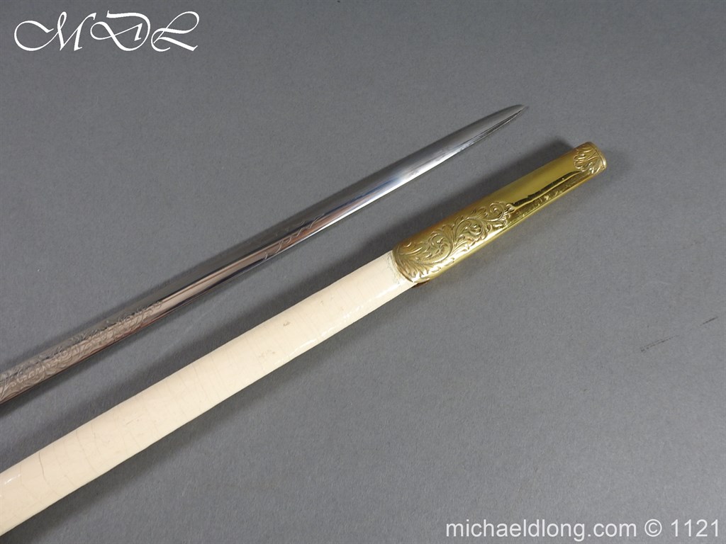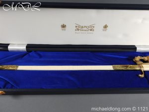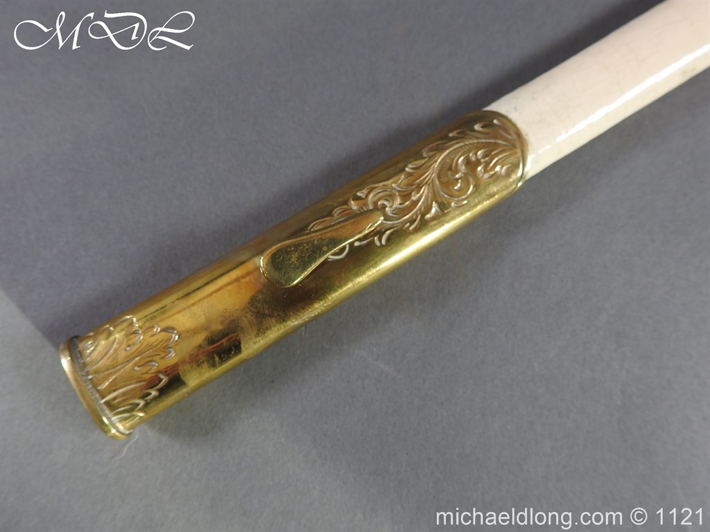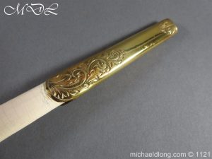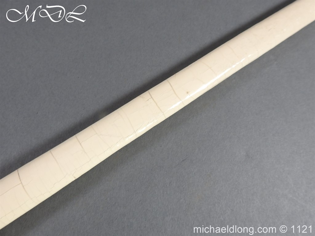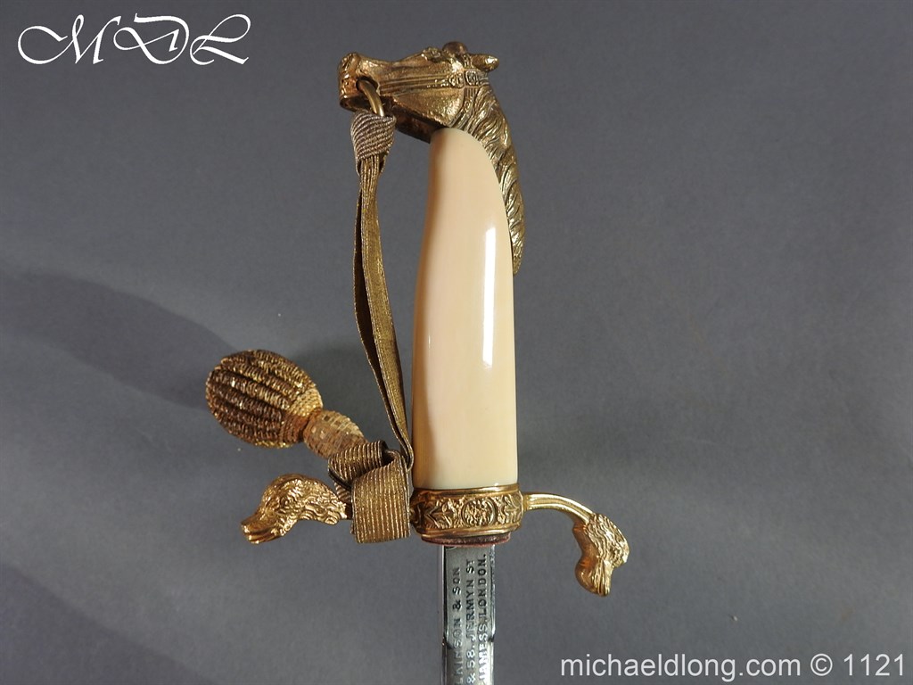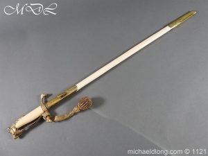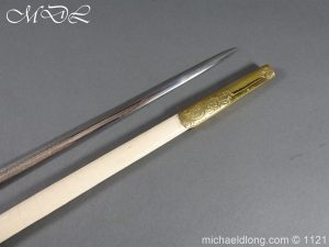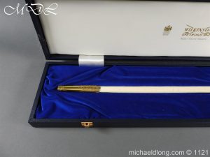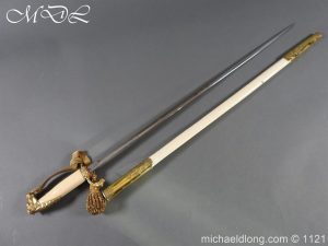 British Page of Honour Sword George the 5th plain bone grip with horse head pommel in gilt brass and matching cross guard with dog head finials pointing in opposite directions. The blade narrow bi-convex section tapering to a point along it’s full length with square shoulder and the hilt. Acid etched with foliage G R V and crown should marked Wilkinson & Son 57 & 58 Jermyn Street St James London plus stylised W within the Star of David. Complete with white leather scabbard which has engraved gilt mounts original knot and contained within a modern Wilkinson Sword box. Please note age wear to the white finish on the leather scabbard. Information: British Cut & Thrust Weapons by John Wilkinson Latham page 51 – Blade Length: 23.75 inches – Overall Length: 27.75 inches