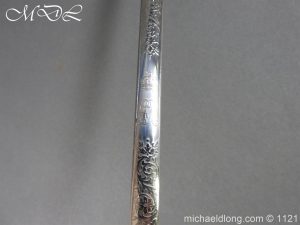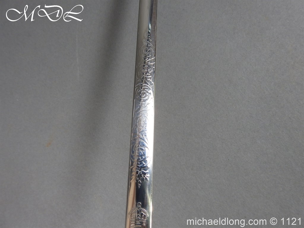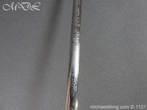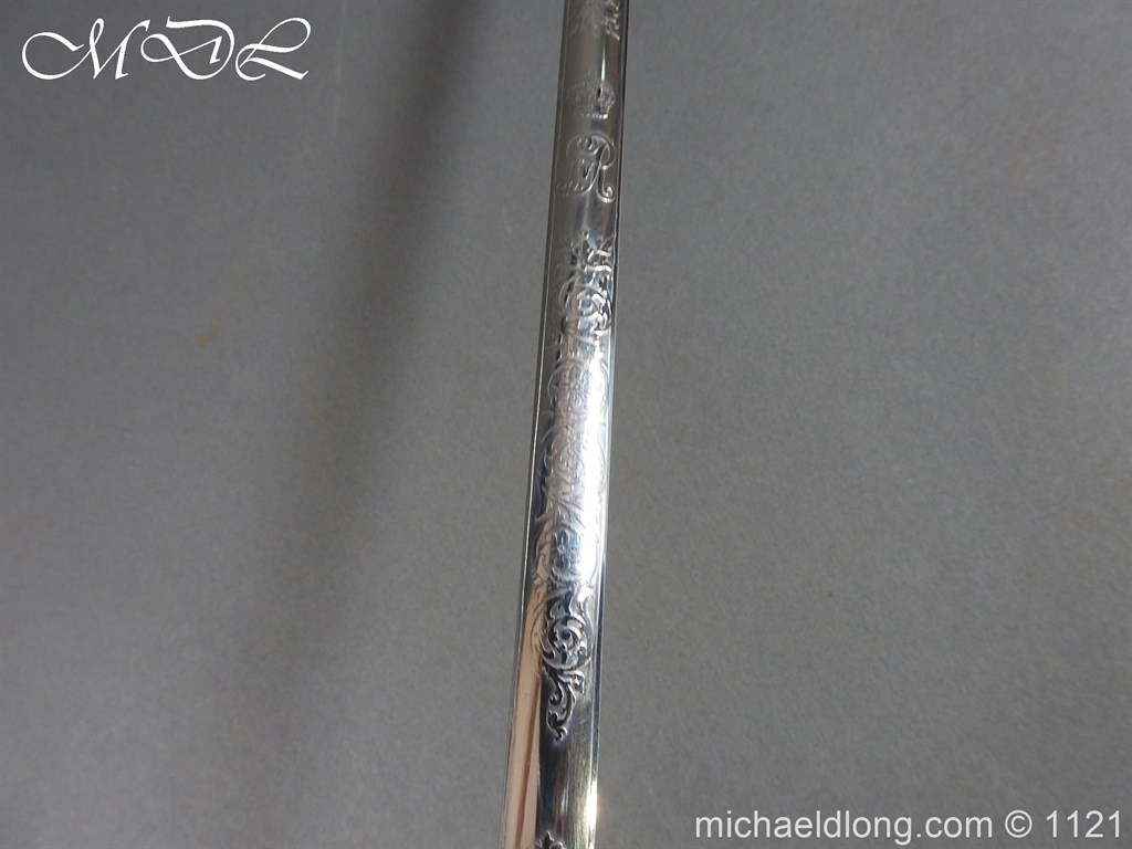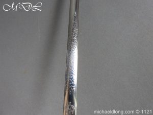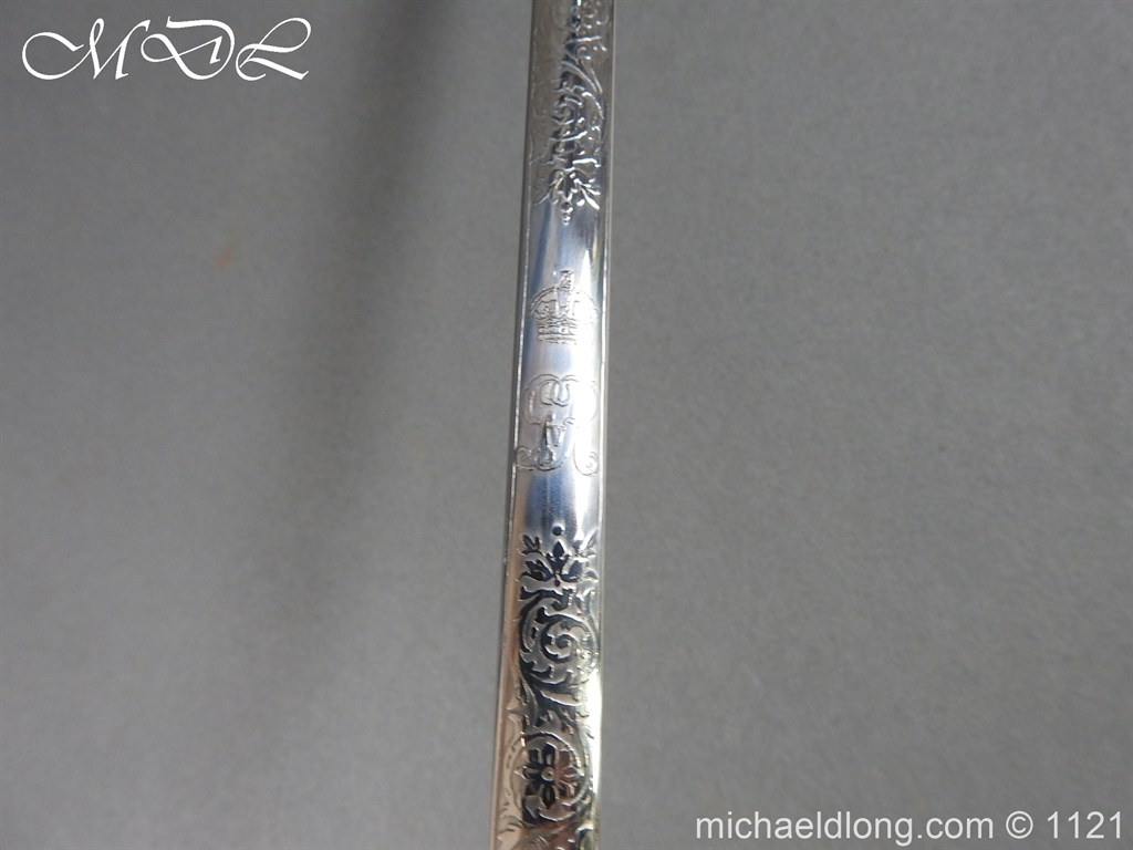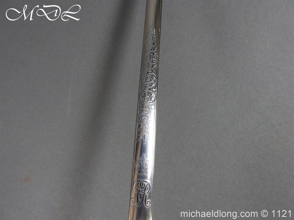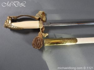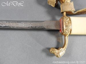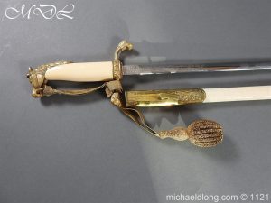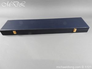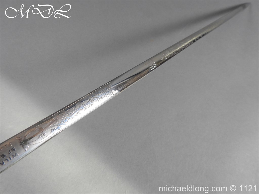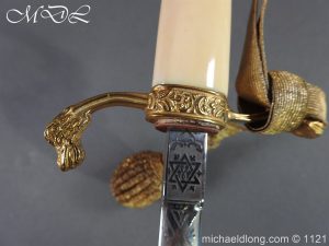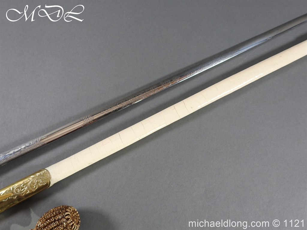 British Page of Honour Sword George the 5th plain bone grip with horse head pommel in gilt brass and matching cross guard with dog head finials pointing in opposite directions. The blade narrow bi-convex section tapering to a point along it’s full length with square shoulder and the hilt. Acid etched with foliage G R V and crown should marked Wilkinson & Son 57 & 58 Jermyn Street St James London plus stylised W within the Star of David. Complete with white leather scabbard which has engraved gilt mounts original knot and contained within a modern Wilkinson Sword box. Please note age wear to the white finish on the leather scabbard. Information: British Cut & Thrust Weapons by John Wilkinson Latham page 51 – Blade Length: 23.75 inches – Overall Length: 27.75 inches