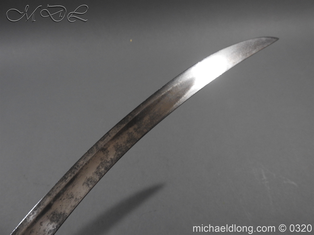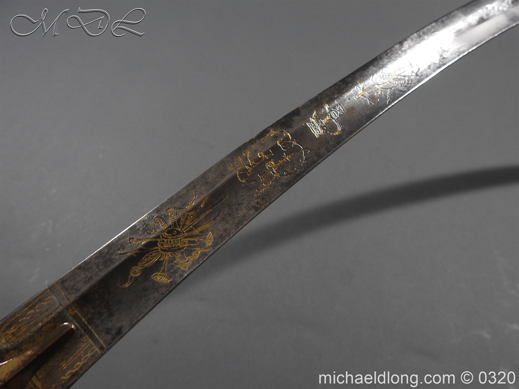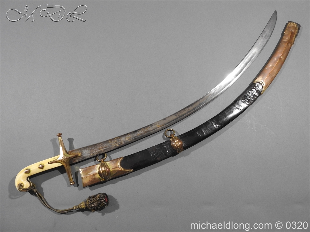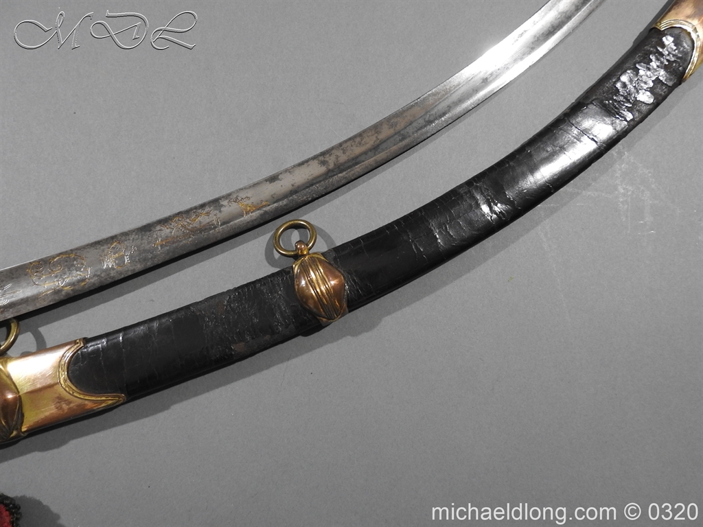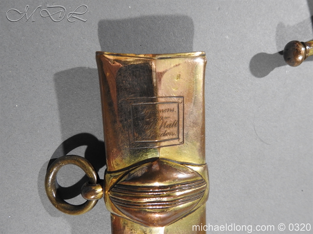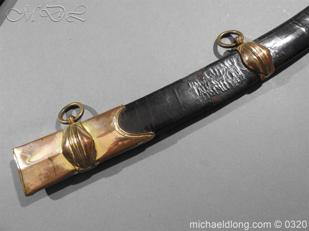 British Georgian Hussars or Lancers Officer’s Mameluke, the hilt with gilt brass mounts and studs securing the grip with original officer’s dress knot. The curved blade engraved with trophies of arms, G R and crown to both sides with gilt inlay. The spine of the blade maker marked JJ Runkell Solingen and in overall good condition with some surface staining. Complete with back leather scabbard with large raised gilt mounts the top one being engraved with Synmons 102 Pall Mall London but has age wear.