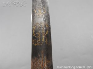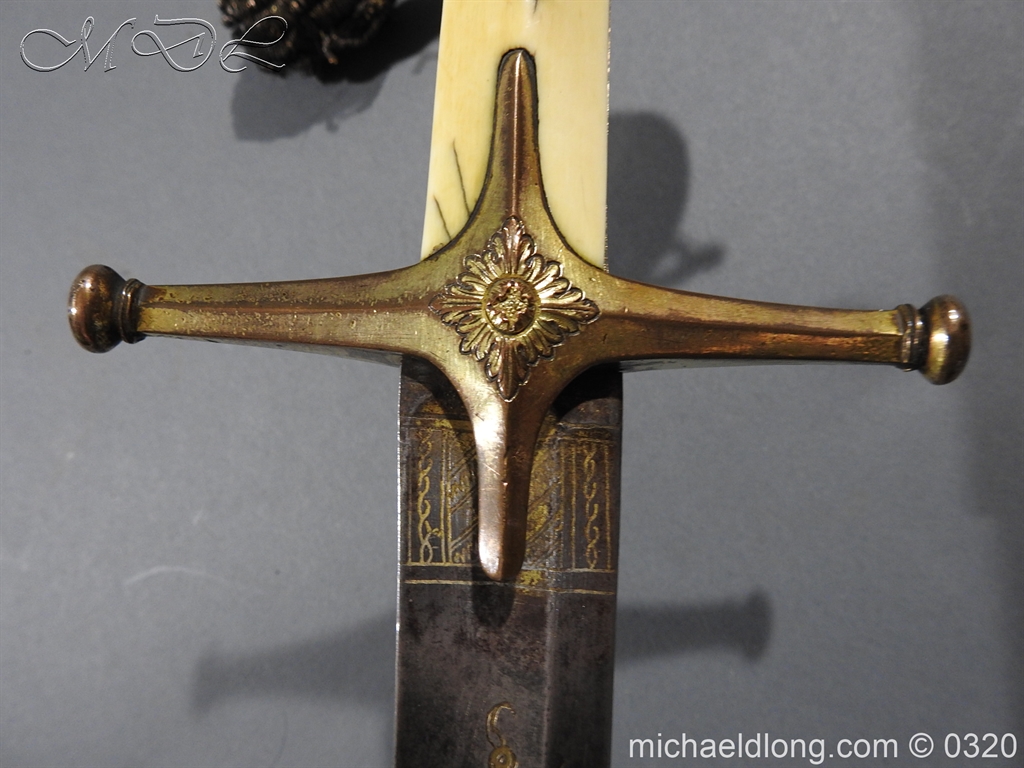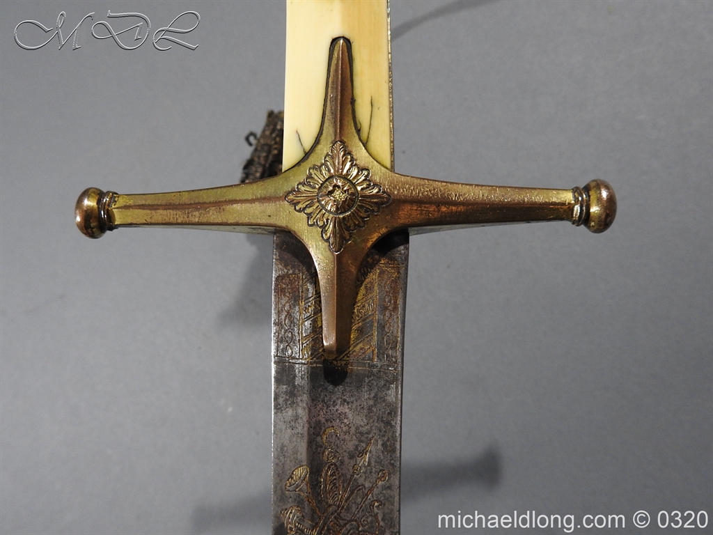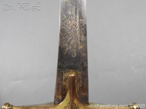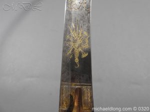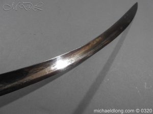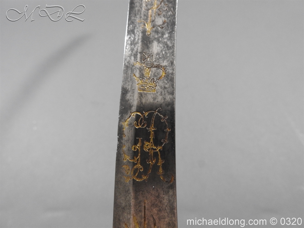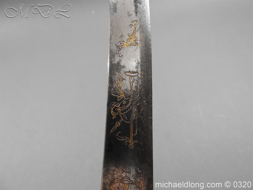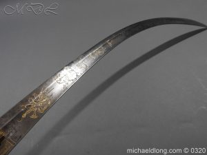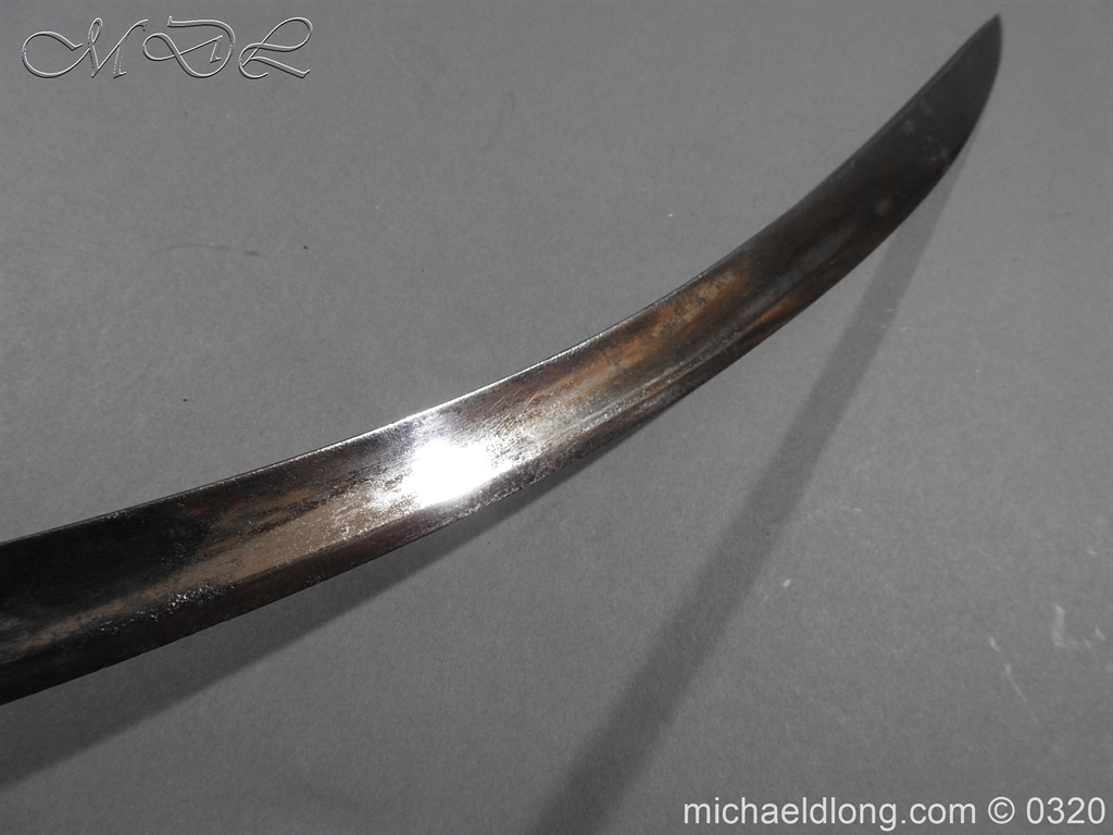 British Georgian Hussars or Lancers Officer’s Mameluke, the hilt with gilt brass mounts and studs securing the grip with original officer’s dress knot. The curved blade engraved with trophies of arms, G R and crown to both sides with gilt inlay. The spine of the blade maker marked JJ Runkell Solingen and in overall good condition with some surface staining. Complete with back leather scabbard with large raised gilt mounts the top one being engraved with Synmons 102 Pall Mall London but has age wear.