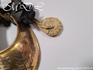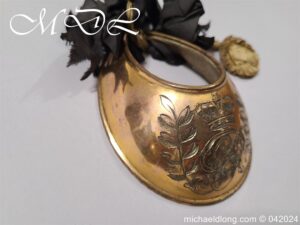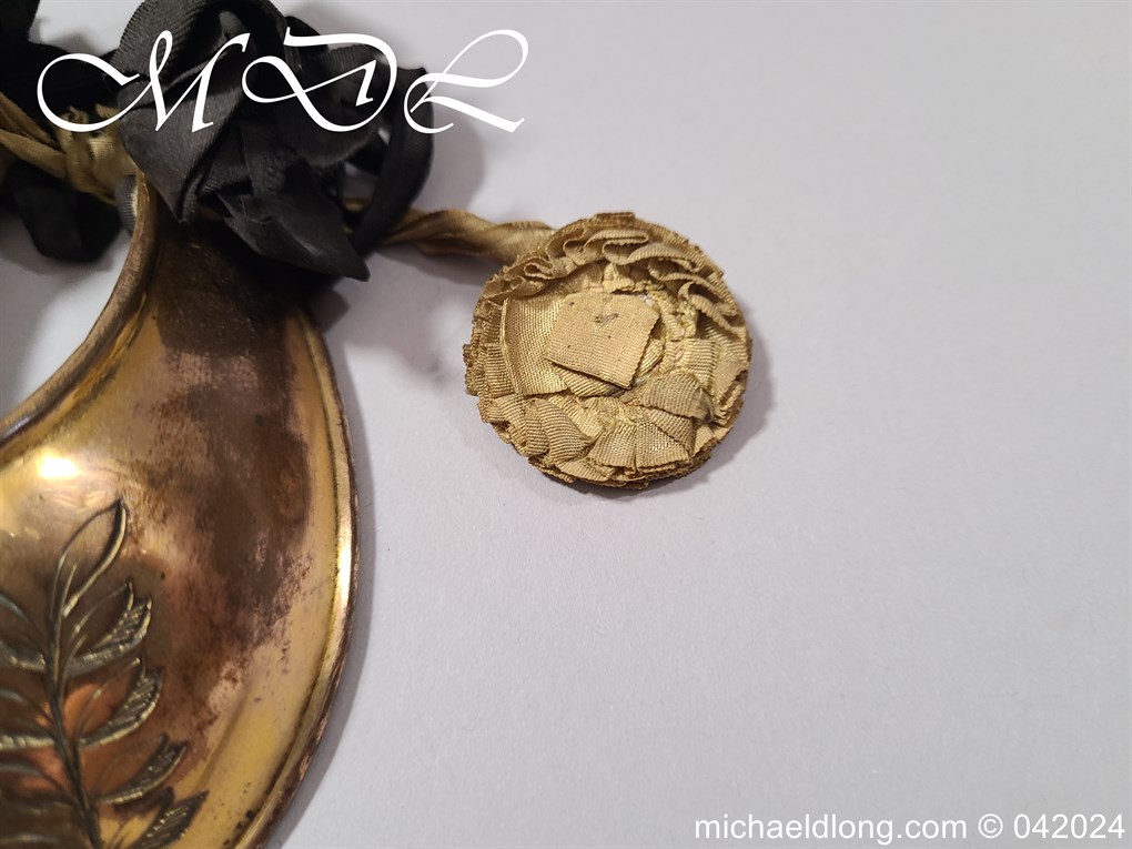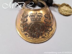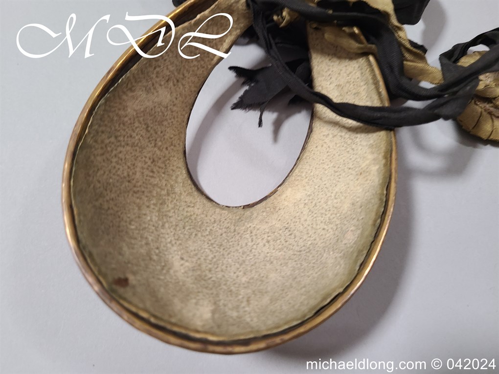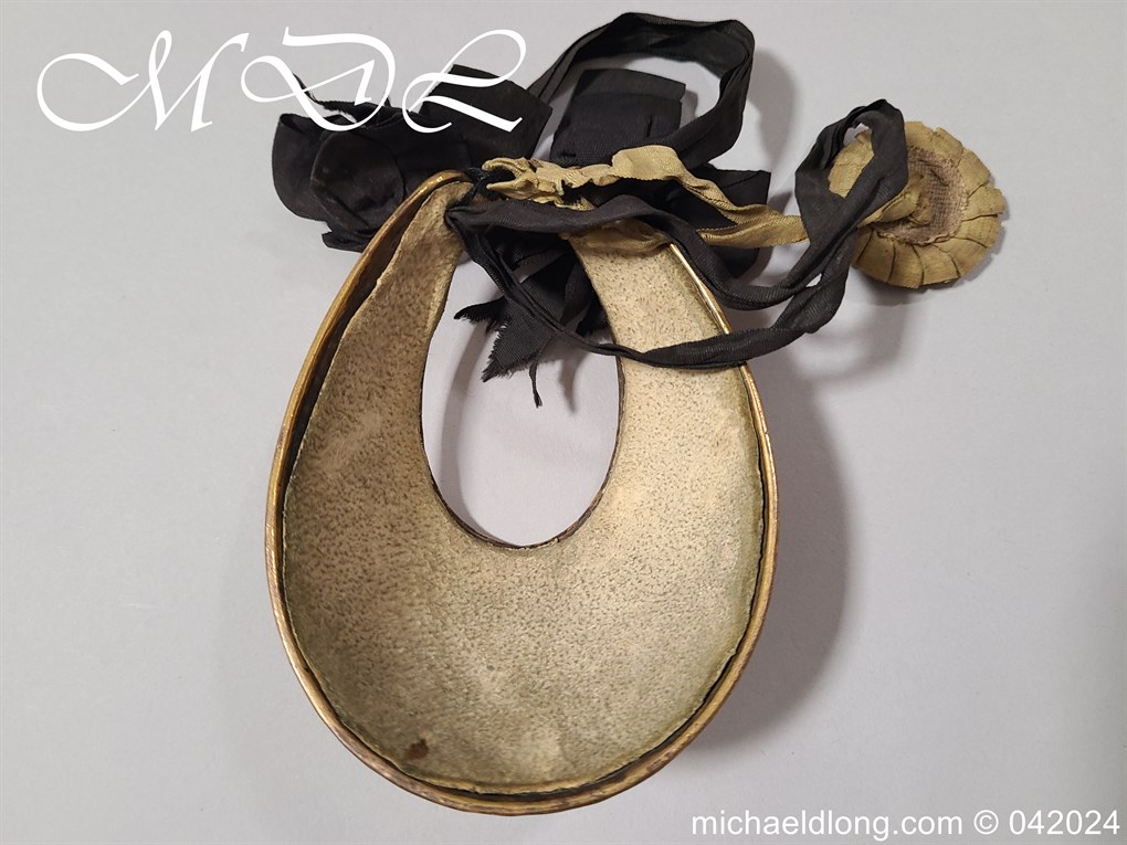 British Georgian period Universal Pattern officers Gorget. It retains most of the original fire gilding with only the odd contact mark. The front is beautifully engraved with crowned GR, which is flanked with olive branches and the inside with leather liner and complete with one period rosette.