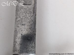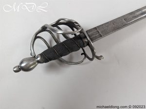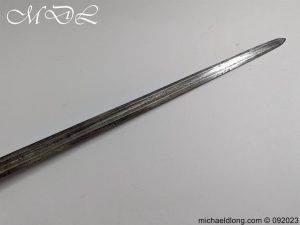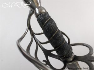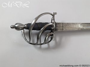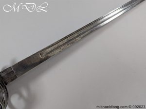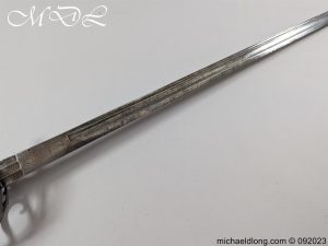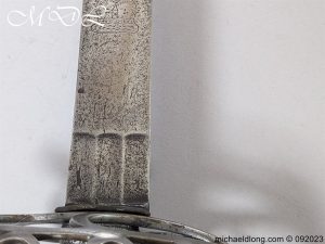 Heavy Cavalry 1788 Sword iron hilt consisting of bars forming half basket with D shaped flat knucklebow leading to a four slotted cross guard. Leather grip secured by twisted silver wire and large ovoid pommel. Straight blade single edged becoming double towards the tip with crown to both sides with makers name Harvey tight and solid sword in very good condition