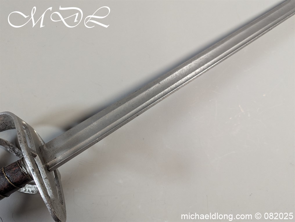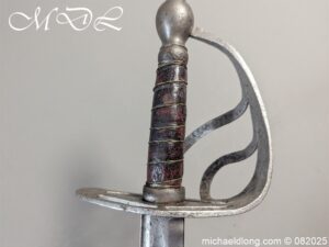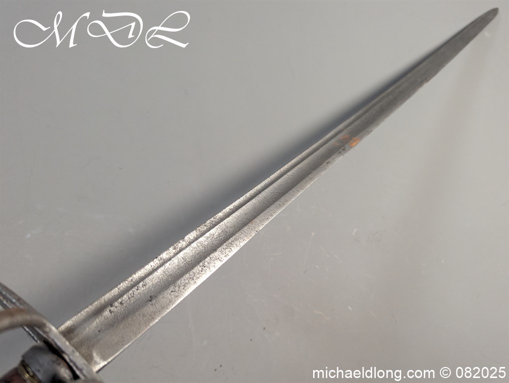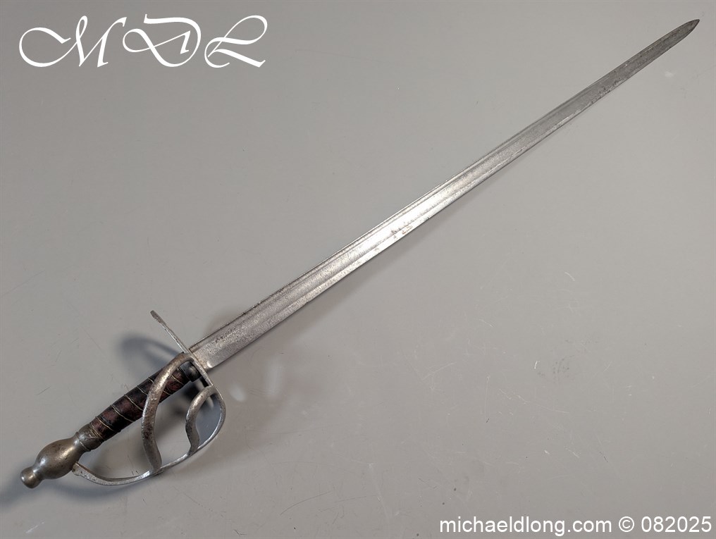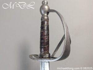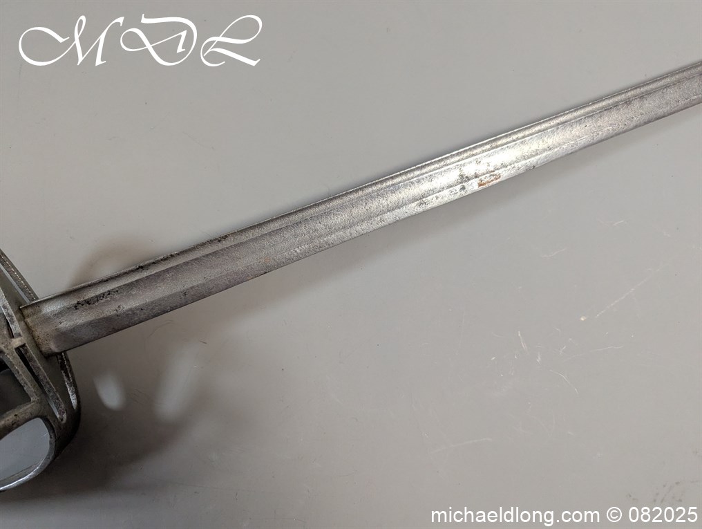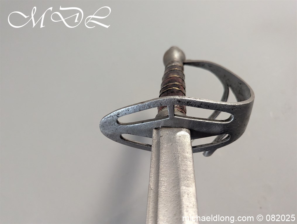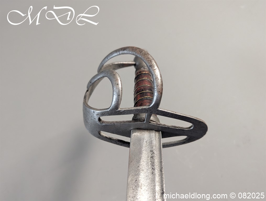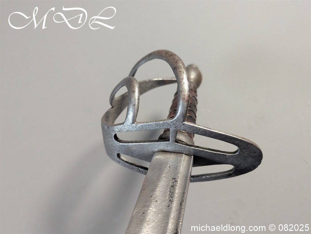 British Heavy Cavalry Troopers Sword c 1788 with a straight flat back single edged blade 35.5 inches in length. Broad and narrow fullers down each side and with a spear point. The hilt half basket with slotted base ovoid pommel and leather-bound grip please note sword has been cleaned for reference please see Swords of the British Army by Brian Robson Revised edition page 15 item 13