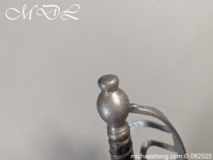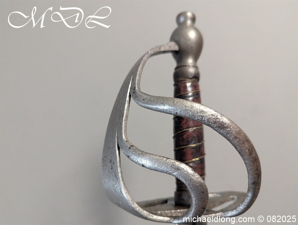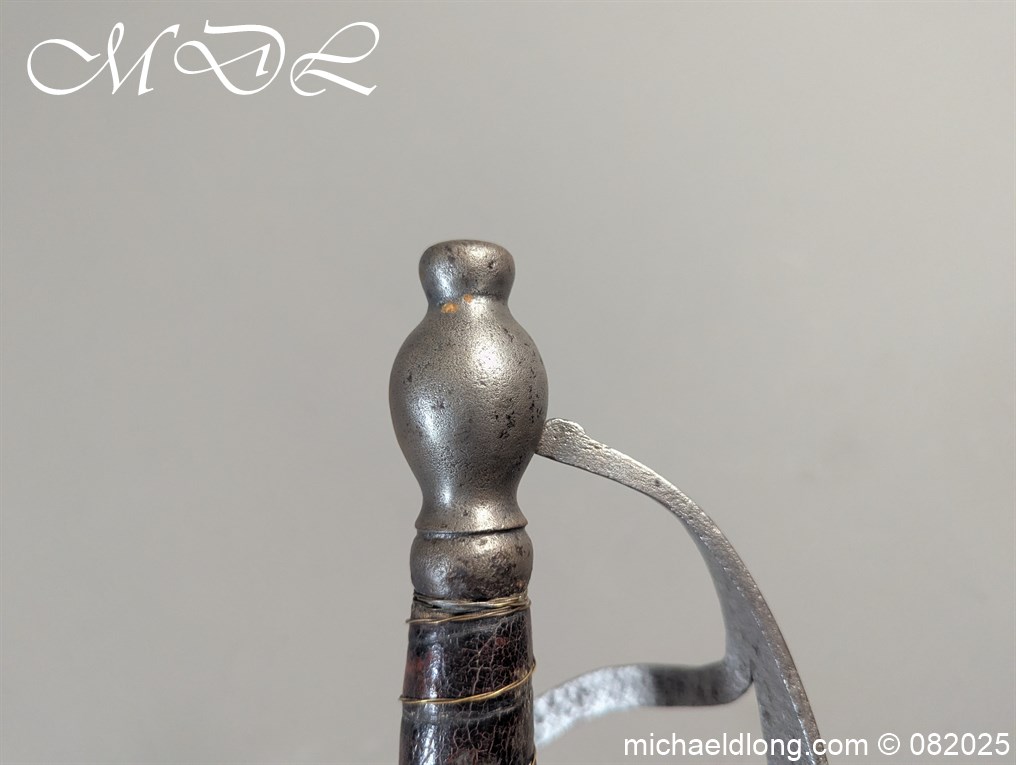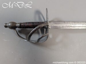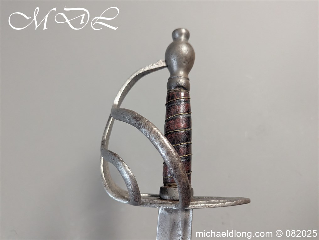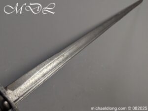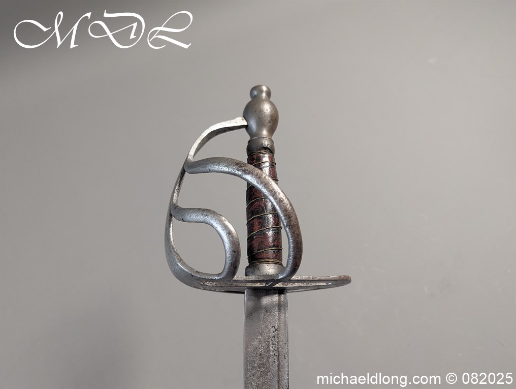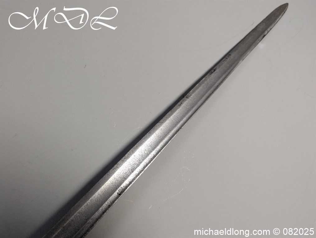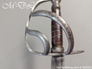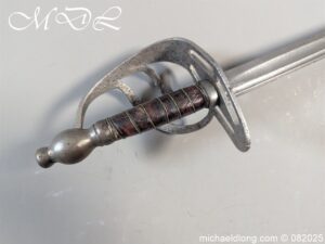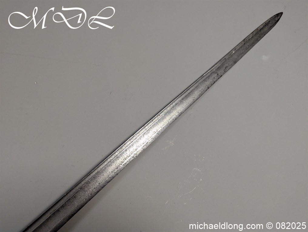 British Heavy Cavalry Troopers Sword c 1788 with a straight flat back single edged blade 35.5 inches in length. Broad and narrow fullers down each side and with a spear point. The hilt half basket with slotted base ovoid pommel and leather-bound grip please note sword has been cleaned for reference please see Swords of the British Army by Brian Robson Revised edition page 15 item 13