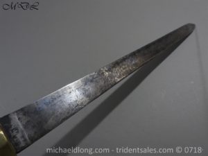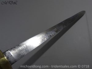 By Carl Eickhorn Solingen. Brass one piece grip and crossguard stamped with an ‘S’ on crossguard with spear pointed single edged steel blade with makers marks on ricasso. In its brass mounted black leather scabbard, stamped with an ‘S’ for Solingen. Length 723mm Blade 575mm.