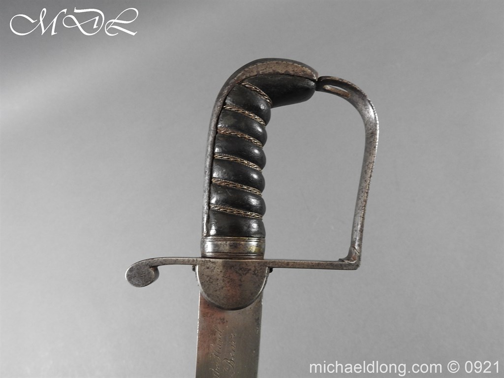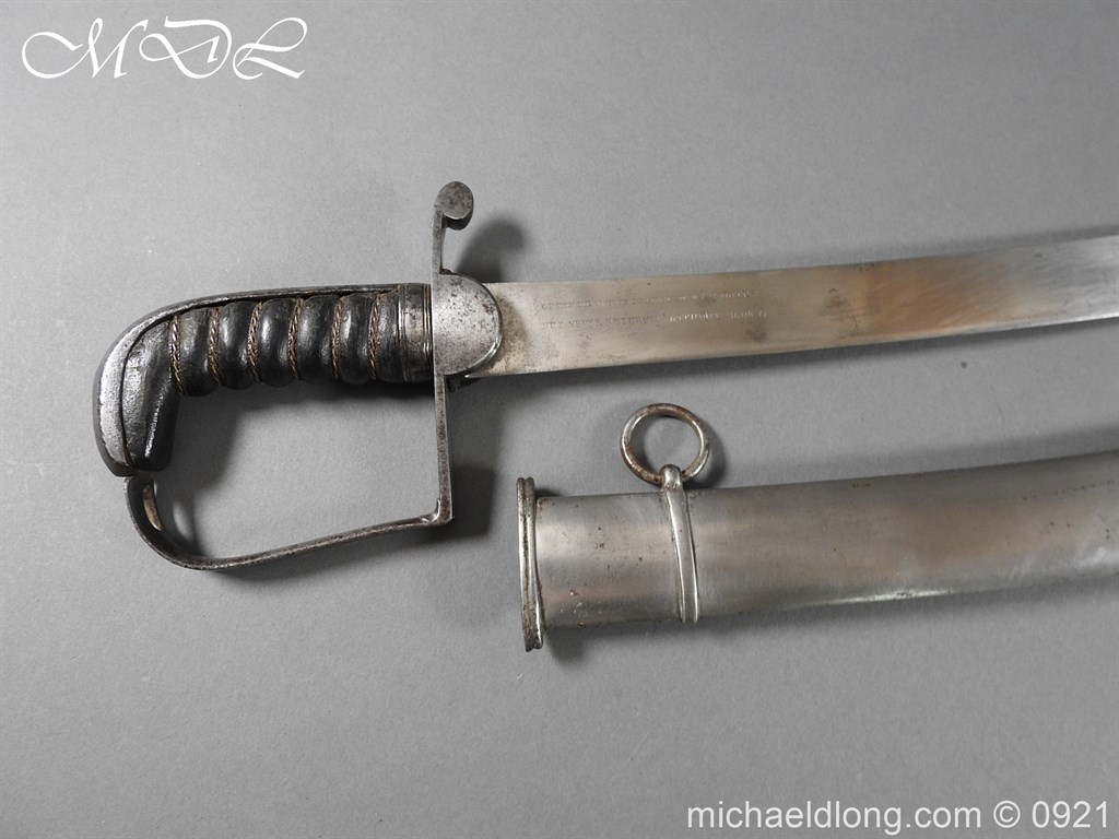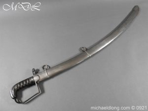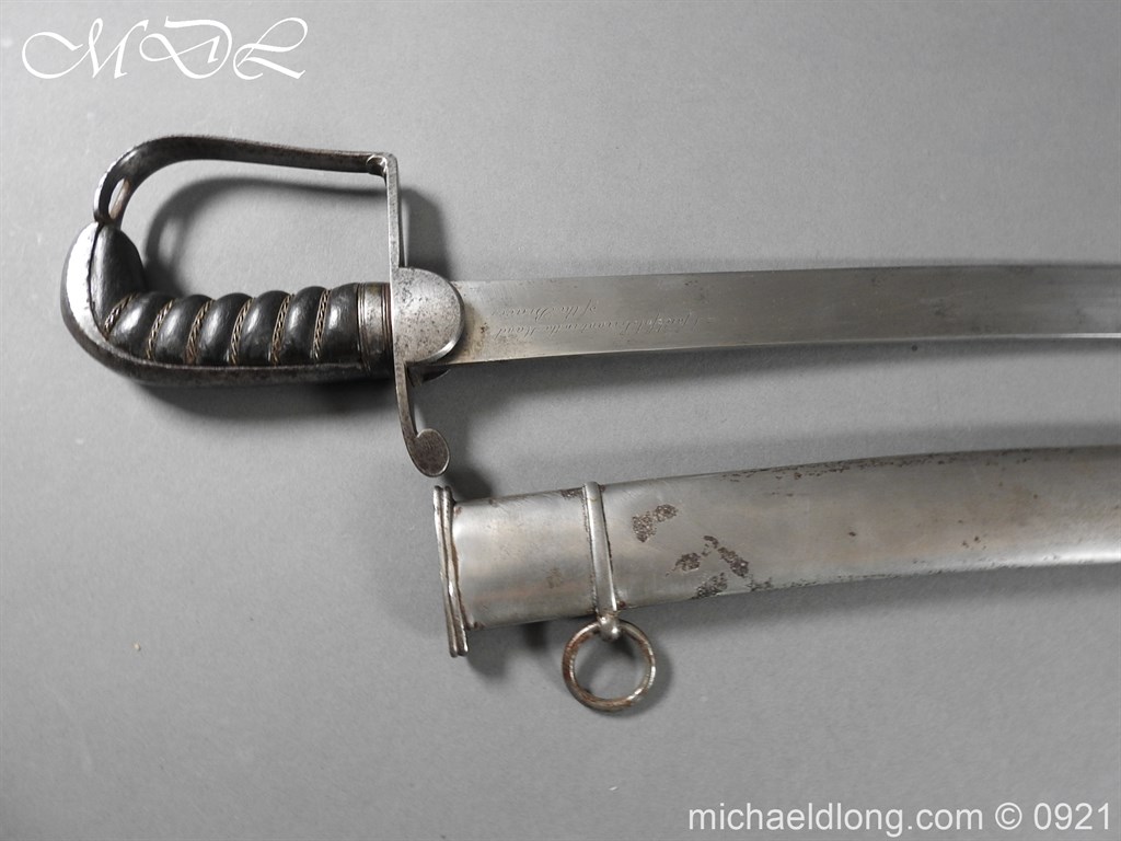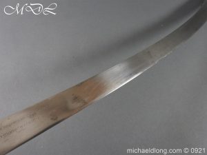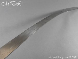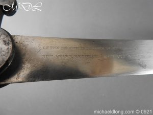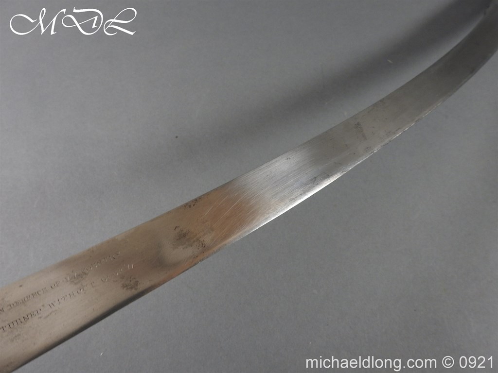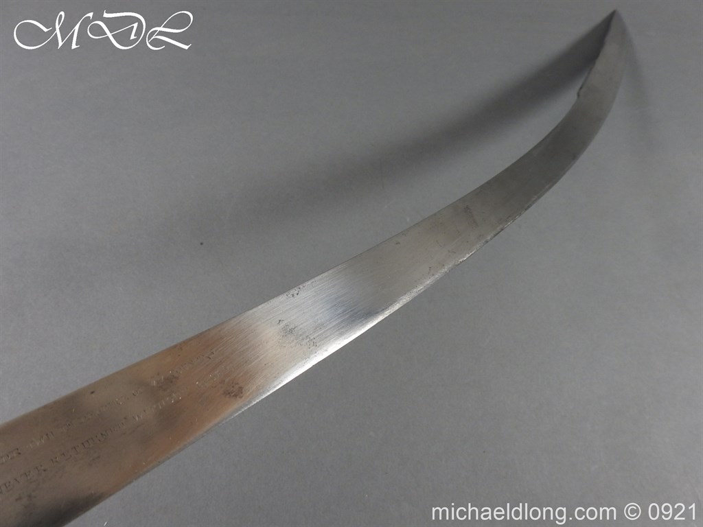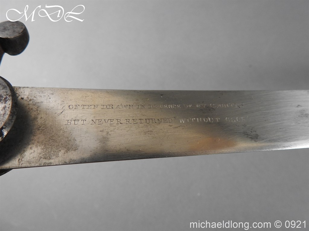 British Light Cavalry Officer’s Sword with stirrup hilt D shaped langets, extended back strap and leather grip bound with silver wire. The flat blade curved no fuller becoming double edged for the last 11 inches. It is engraved on both sides one side with A faithful servant in the hand off the brave and the reverse Often drawn in the defence of my country but never returned without glory both is different scripts please see images. Complete with matching steel scabbard.