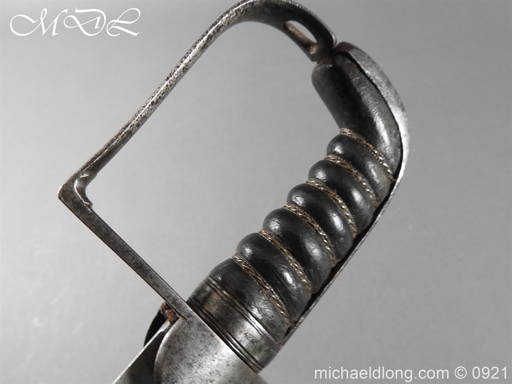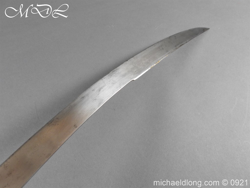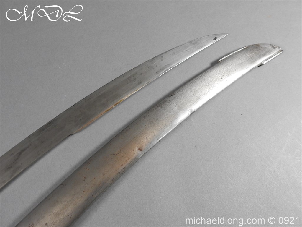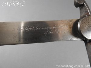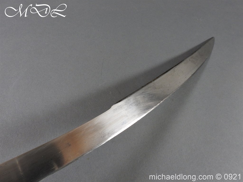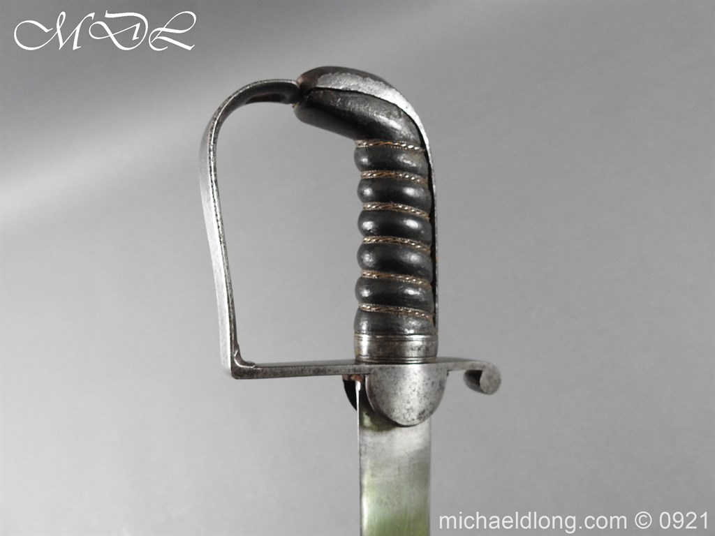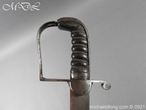 British Light Cavalry Officer’s Sword with stirrup hilt D shaped langets, extended back strap and leather grip bound with silver wire. The flat blade curved no fuller becoming double edged for the last 11 inches. It is engraved on both sides one side with A faithful servant in the hand off the brave and the reverse Often drawn in the defence of my country but never returned without glory both is different scripts please see images. Complete with matching steel scabbard.