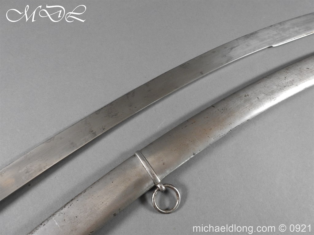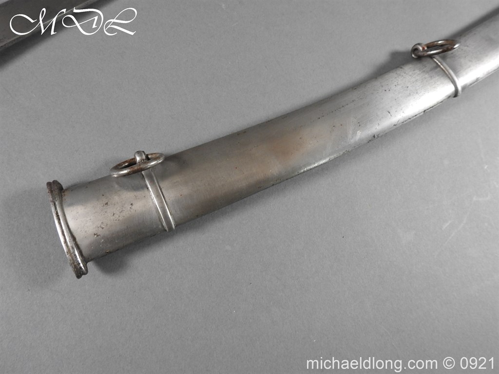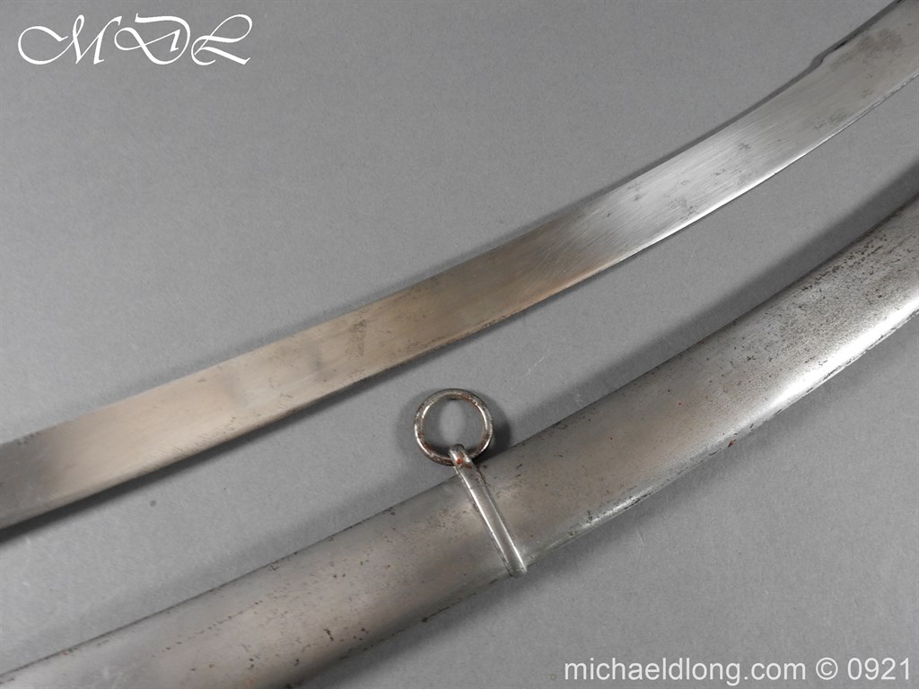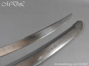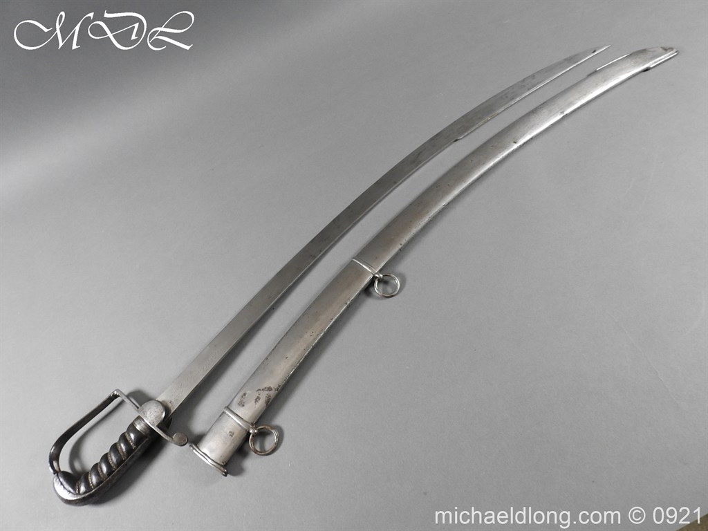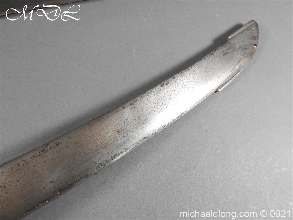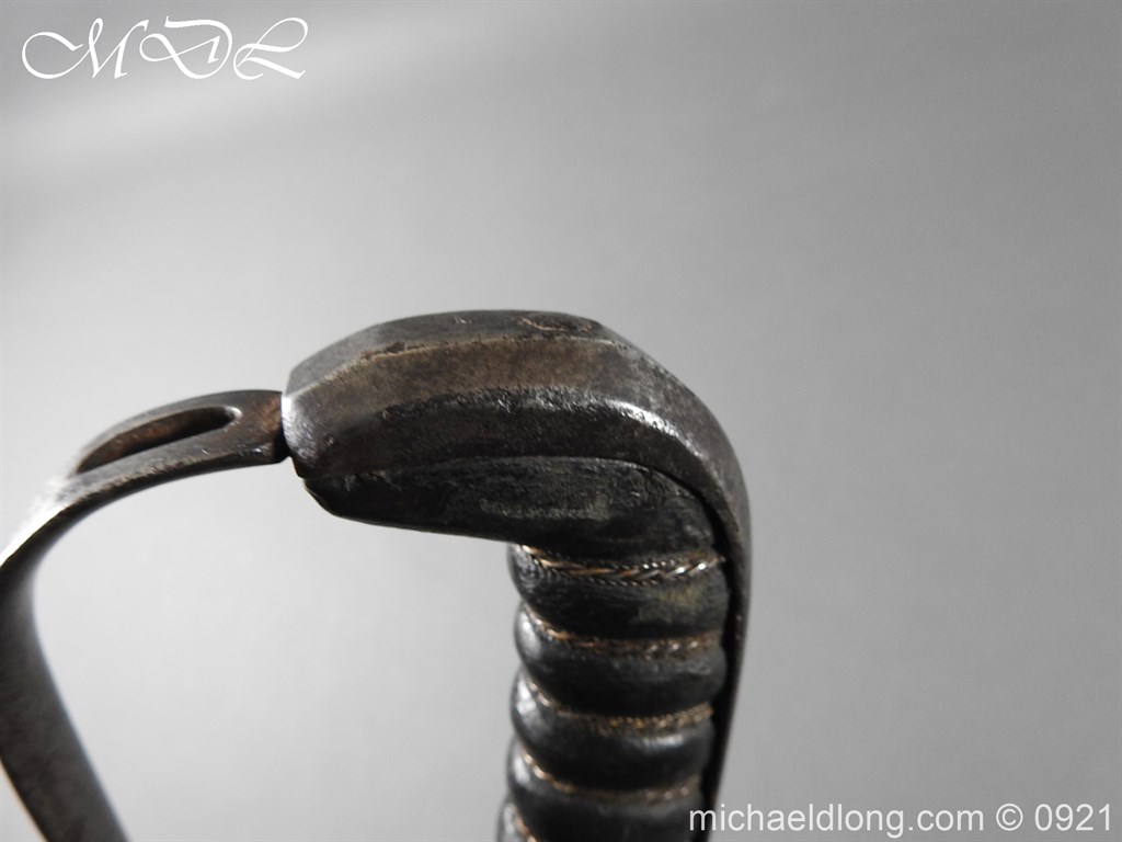 British Light Cavalry Officer’s Sword with stirrup hilt D shaped langets, extended back strap and leather grip bound with silver wire. The flat blade curved no fuller becoming double edged for the last 11 inches. It is engraved on both sides one side with A faithful servant in the hand off the brave and the reverse Often drawn in the defence of my country but never returned without glory both is different scripts please see images. Complete with matching steel scabbard.